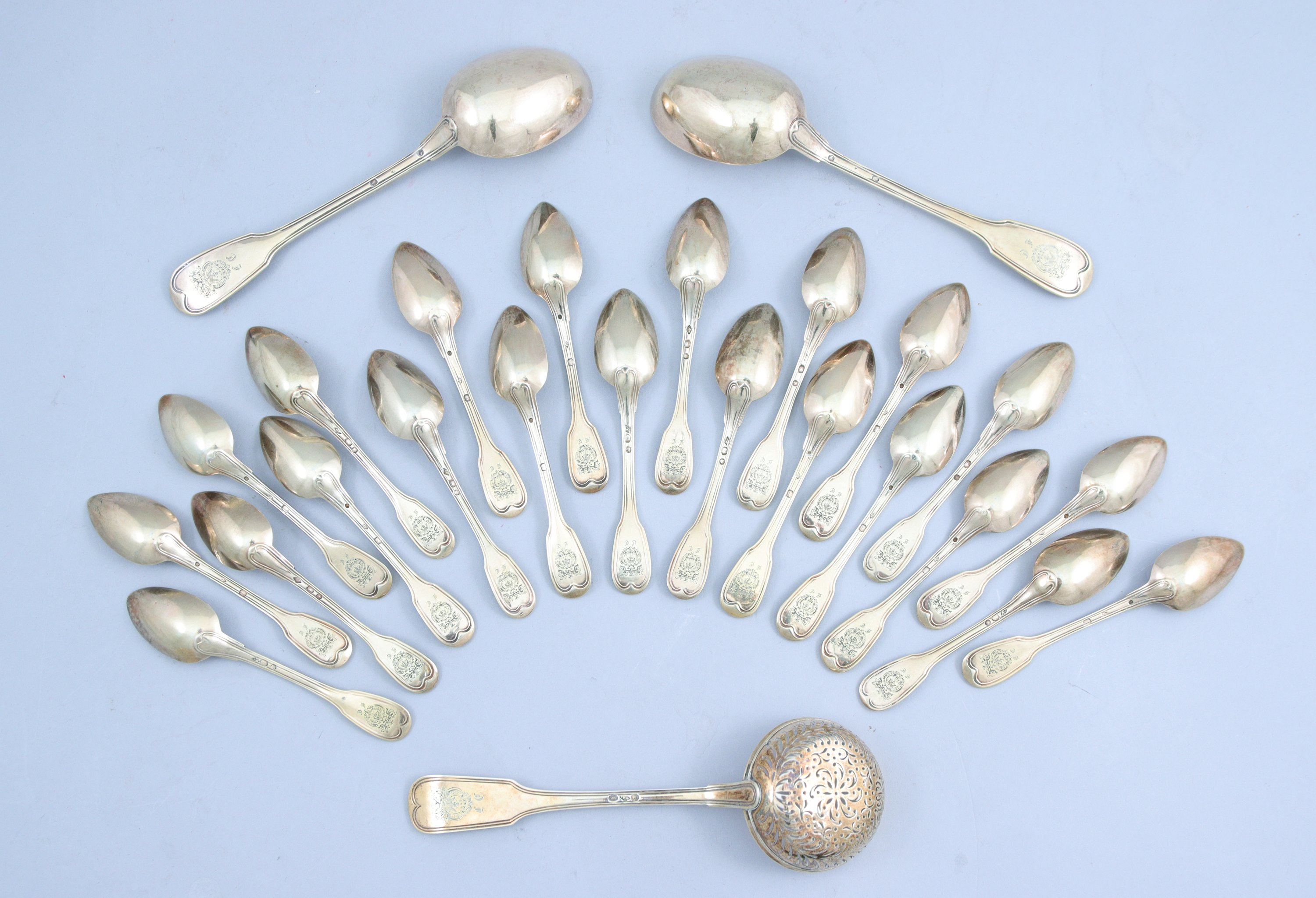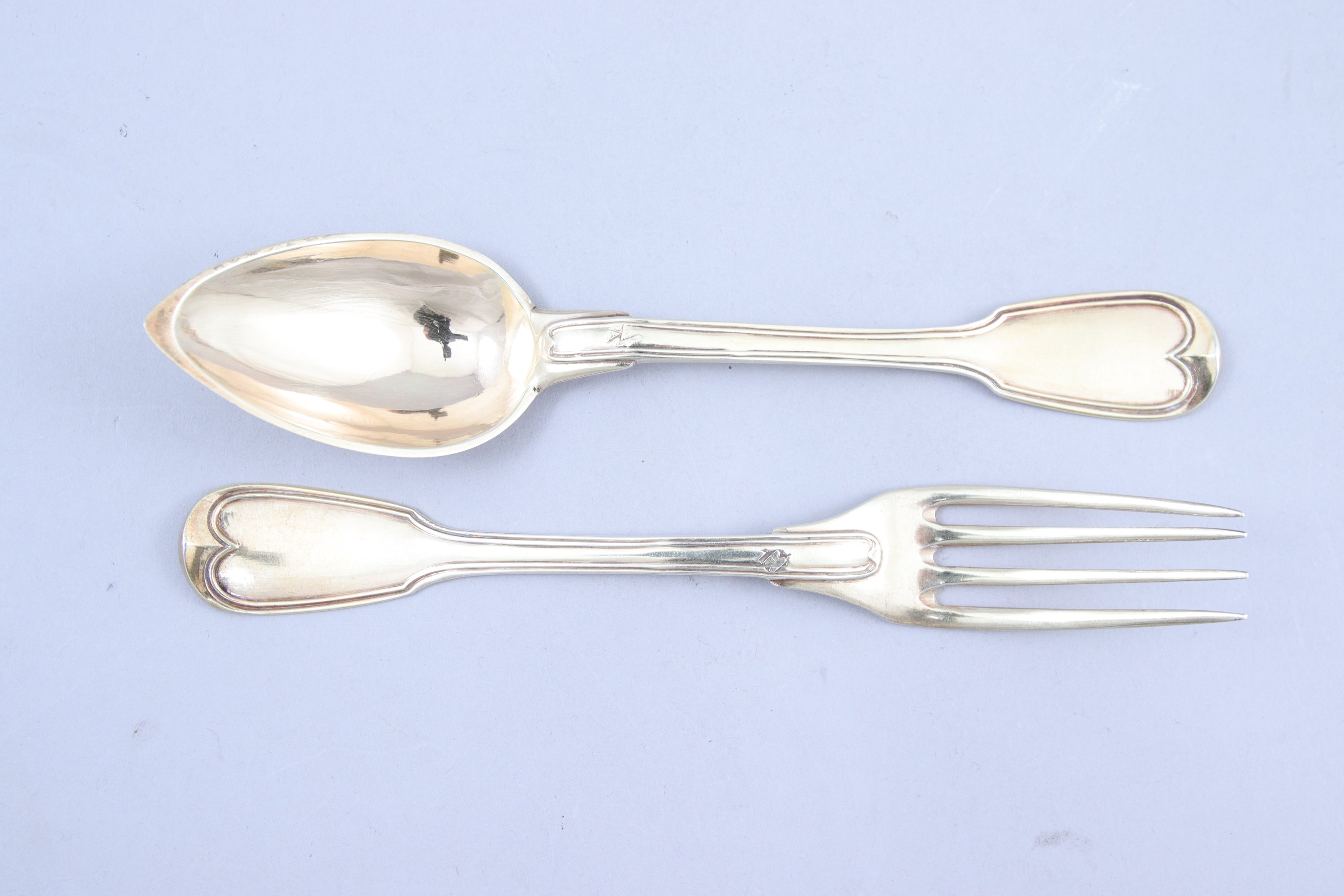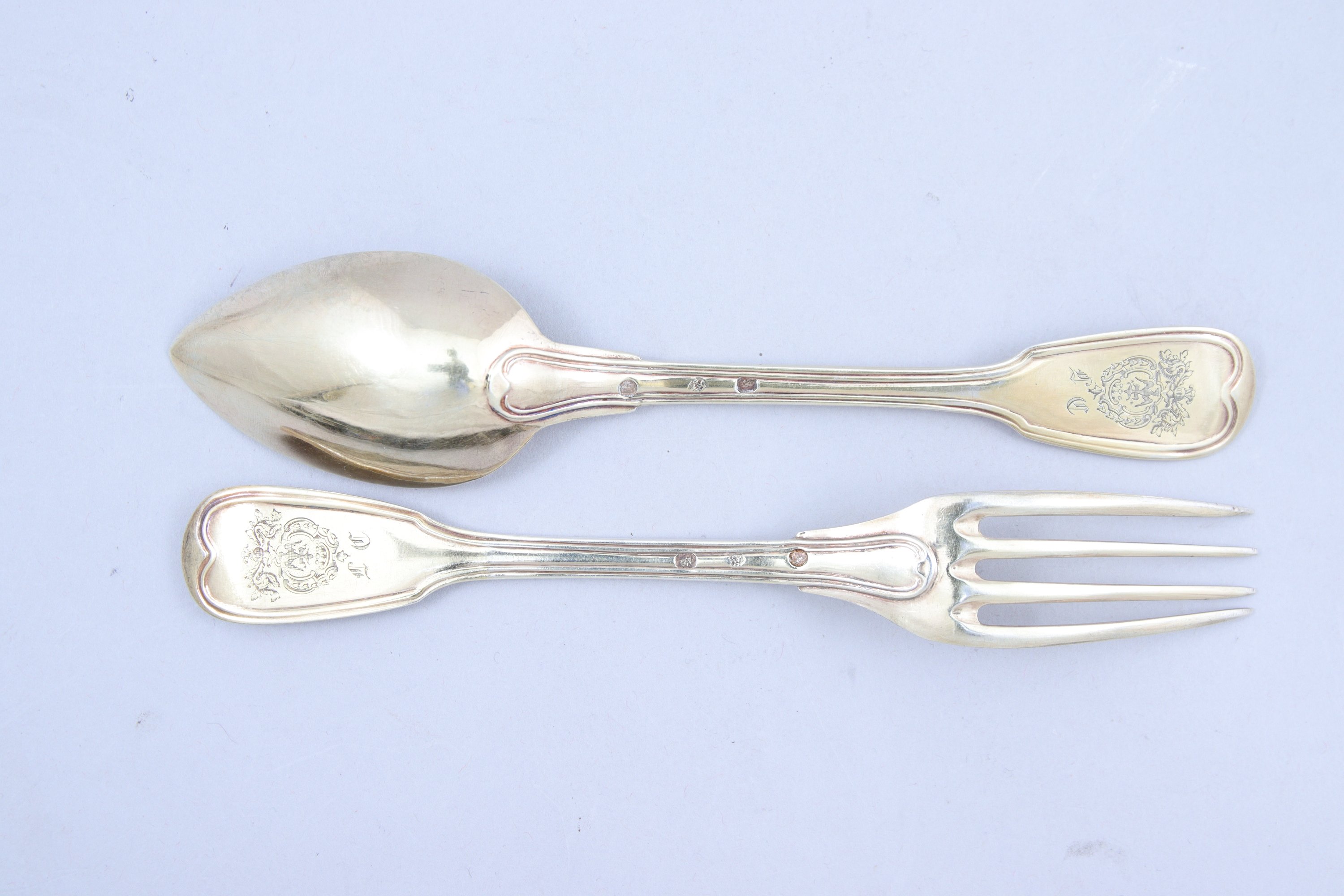 en vermeil, modèle à filet contour de 73 pièces comprenant : 24 couverts à entremets, 22 petites cuillers, une cuiller à saupoudrer et deux cuillers à crème. Chaque pièce monogrammée des initiales "LC" avec un oiseau aux ailes déployées.