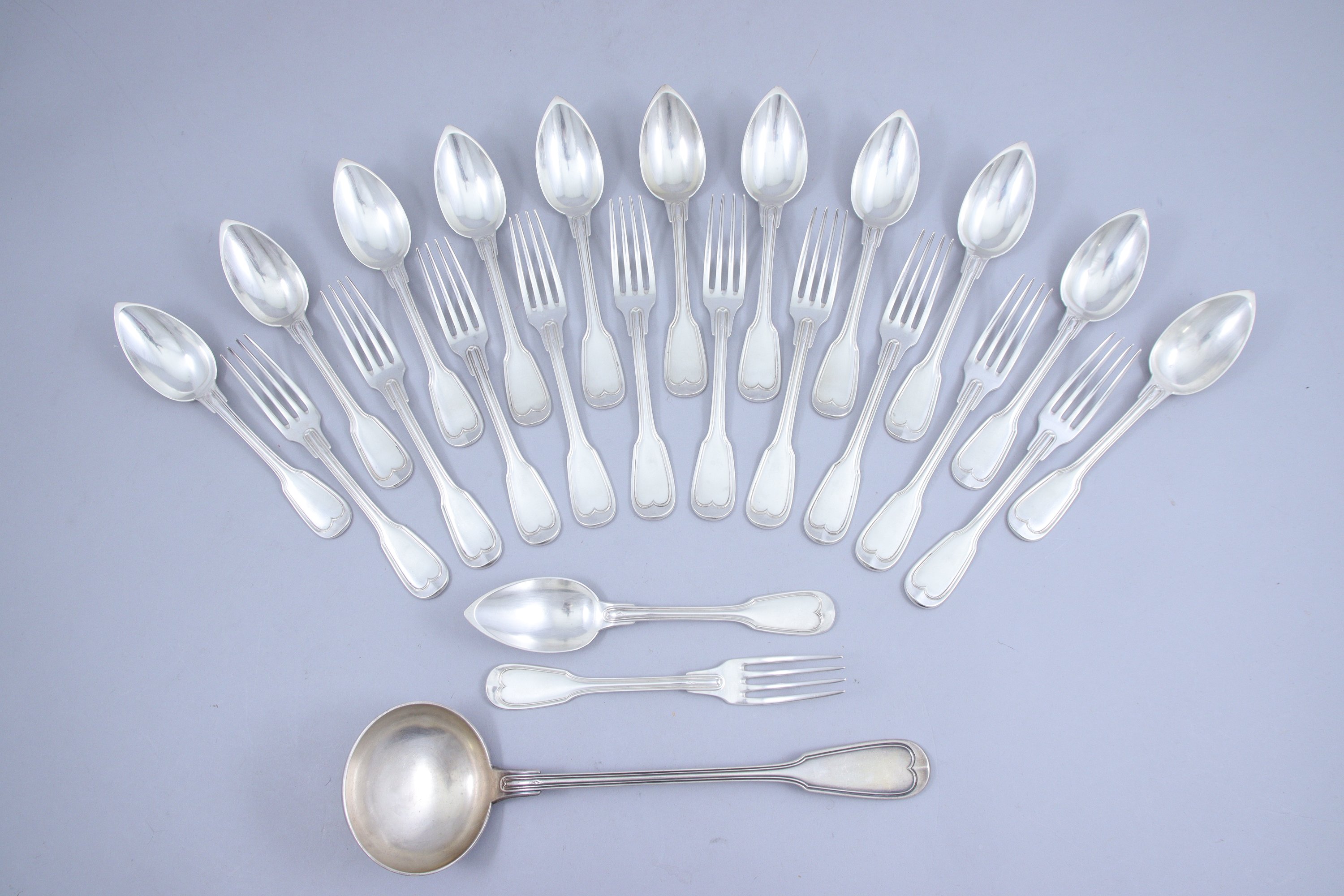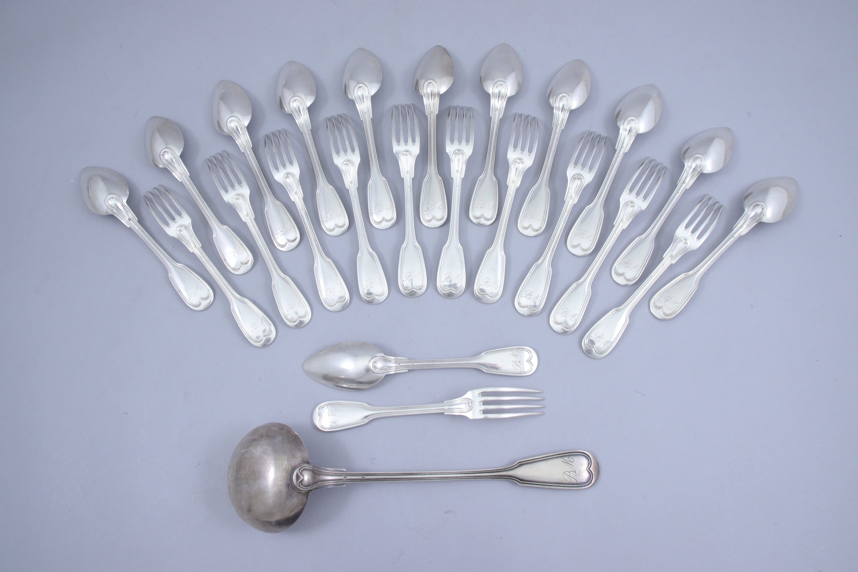 en argent de 24 pièces, modèle à filet, comprenant onze grands couverts et une cuiller supplémentaire, et une louche. Monogrammée "BM".