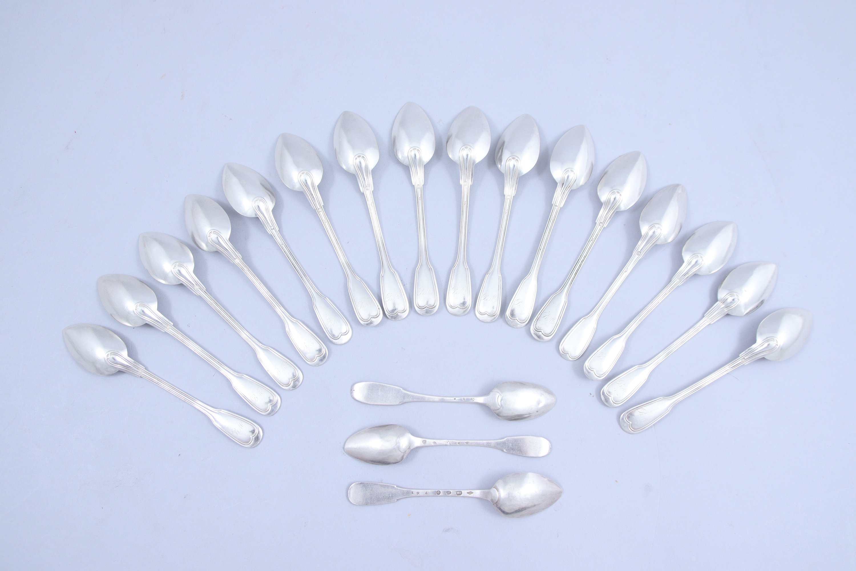 - Seize petites cuillers, modèle à filet. Monogrammées "BM". Minerve 1er titre. Orfèvre Ernest Comperé. Poids : 360 gr.