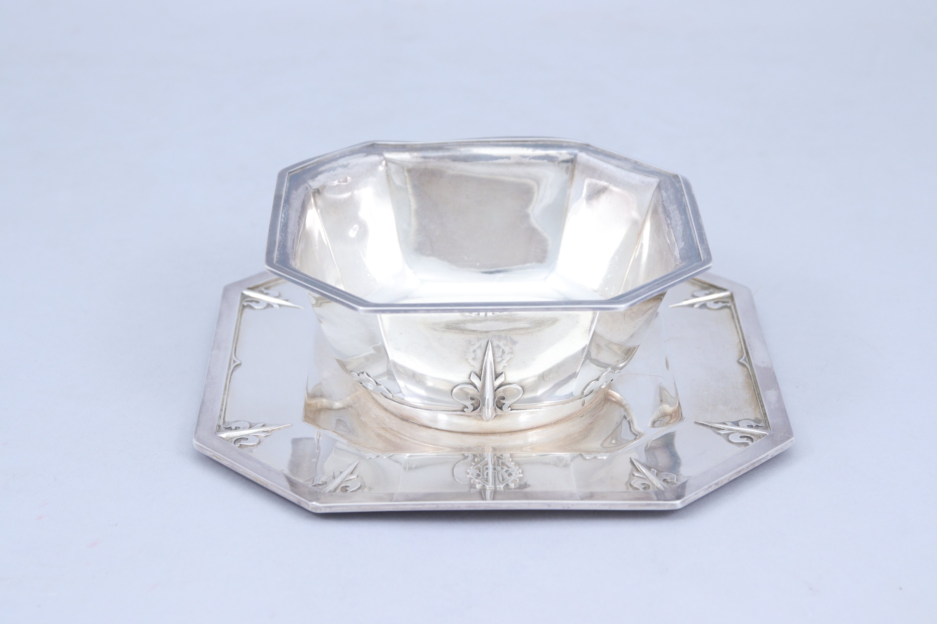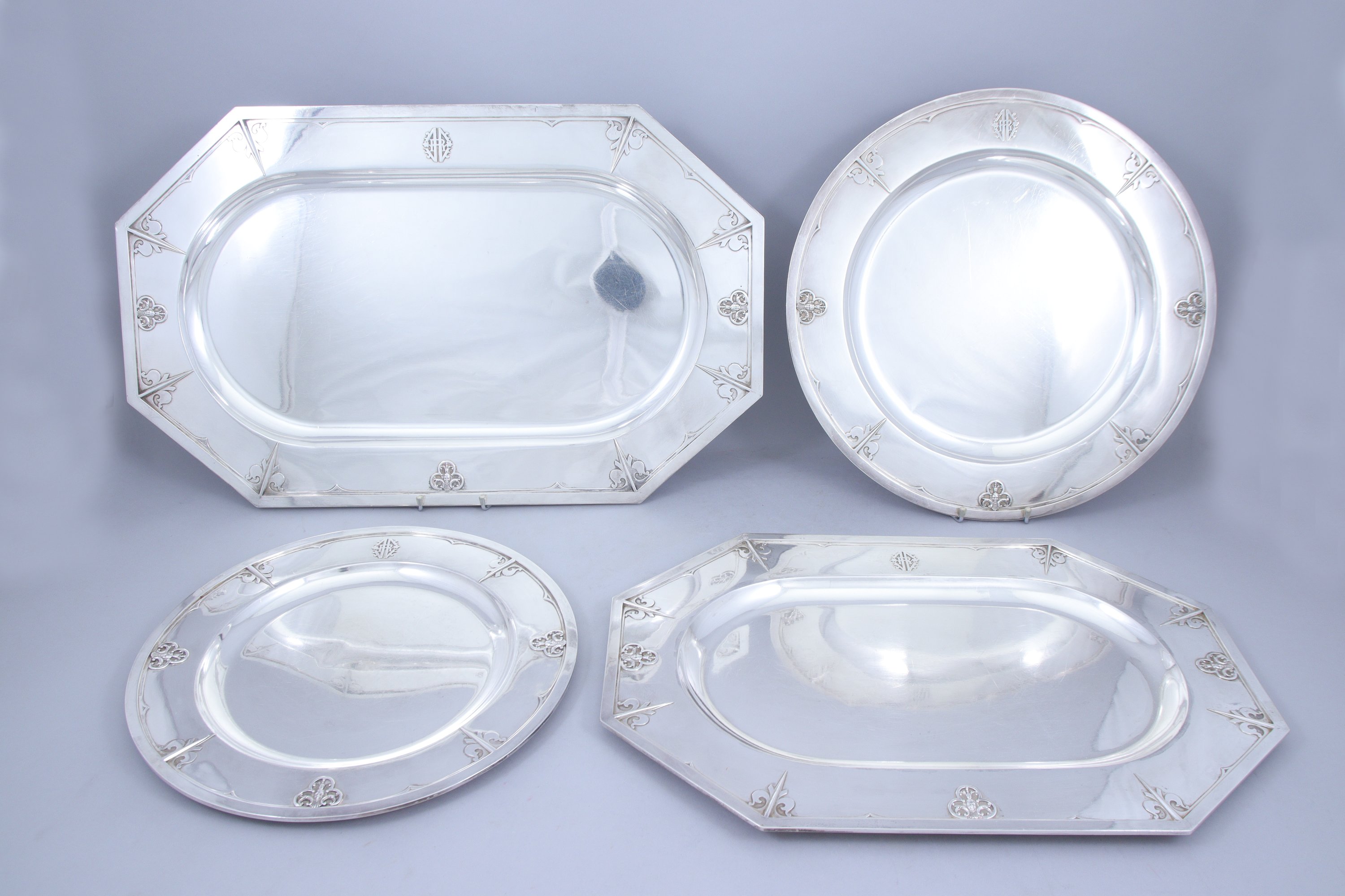 en argent, à décor en applique de fer et visage d'enfant dans un trilobe. Comprend deux plats ronds en deux tailles, deux plats à pans coupés en deux tailles et une saucière et son plateau fixe. Chiffré en relief "HR" (?).
