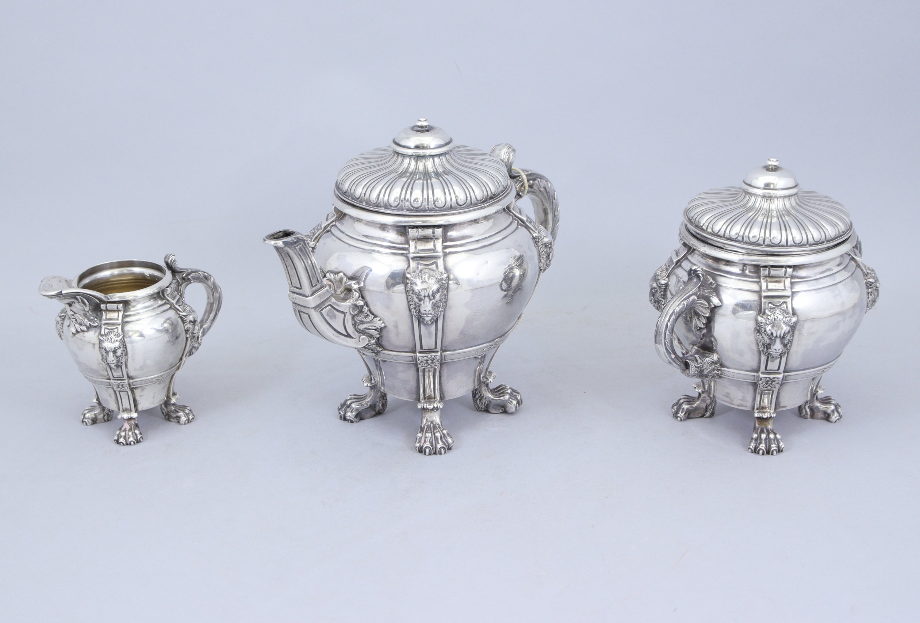 en argent, comprenant une théière, un pot à lait et un sucrier. Les couvercles coiffés de toupies et ornés de godrons. Les anses décorées de feuilles se terminent par des têtes de boucs. Les panses décorées de têtes de lion placées sur des pilastres surmontant des graines ouvertes. Chaque pièce repose sur quatre pieds en forme de patte de fauve. L'anse de la théière est garnie de deux petites rondelles d'os.