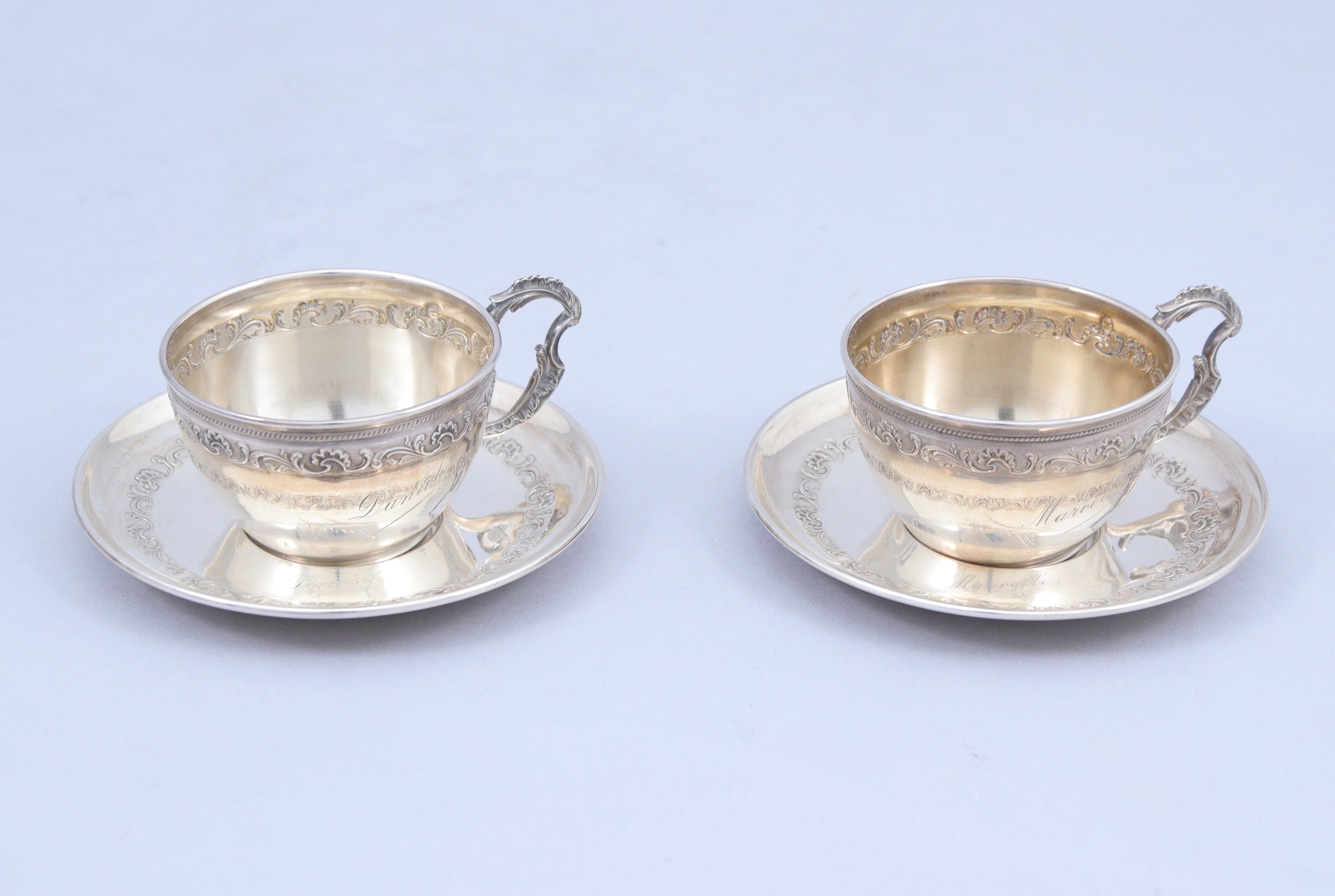 en argent à décor repoussé de frise d'agrafes et feuilles d'acanthe. Les sous-tasses gravées "Marcelle" et "Daniel".