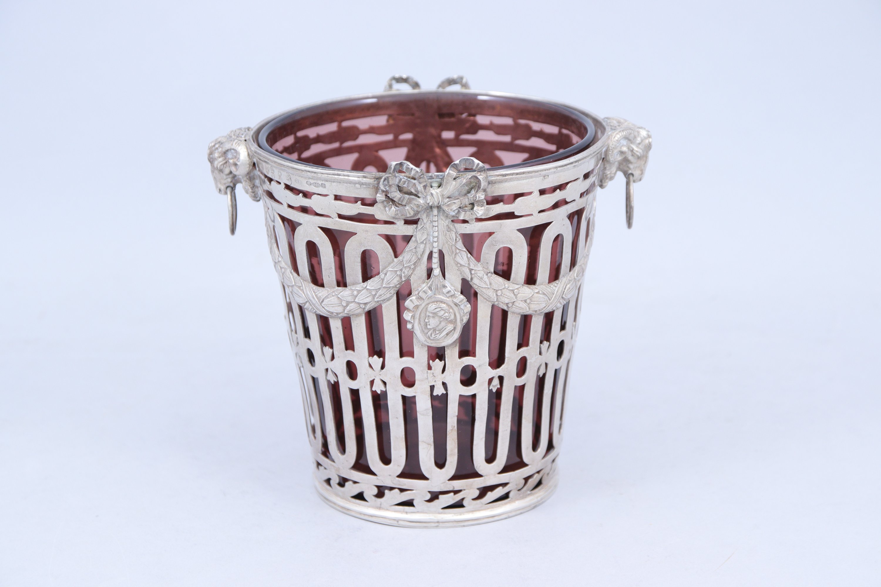 en argent, le réceptable en verre de couleur prune. Deux prises en forme de tête de bélier tenant chacune un anneau. Elles sont reliées par des guirlandes de lauriers et nuds soutenant des médaillons avec profil de femme. Le corps ajouré à motif de cannelures en alternance de perles simulées.