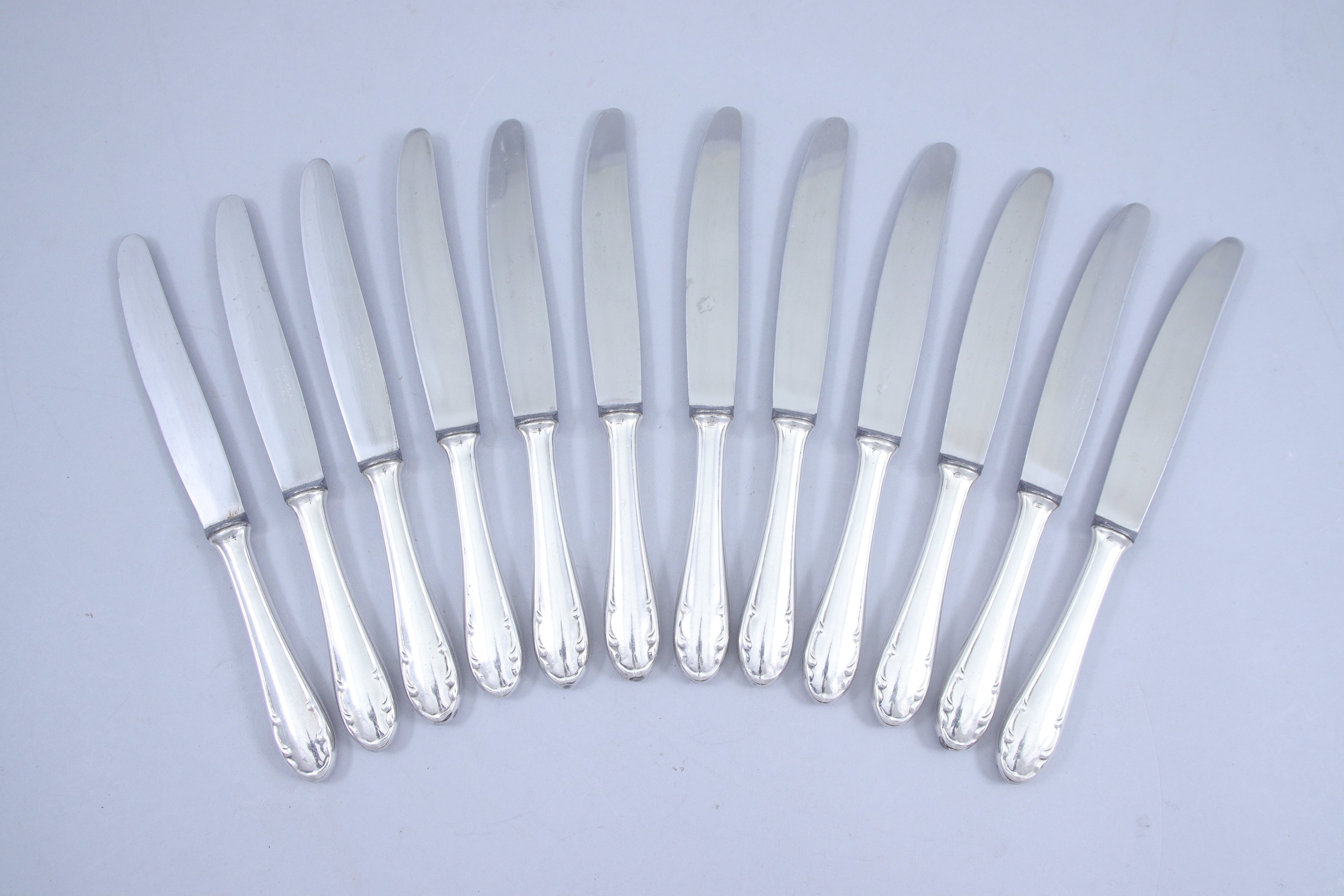 en argent, modèle à feuilles d'acanthe, de 28 pièces composée de huit fourchettes de table, douze grands couteaux de table à lame inox, et huit cuillers à entremets.