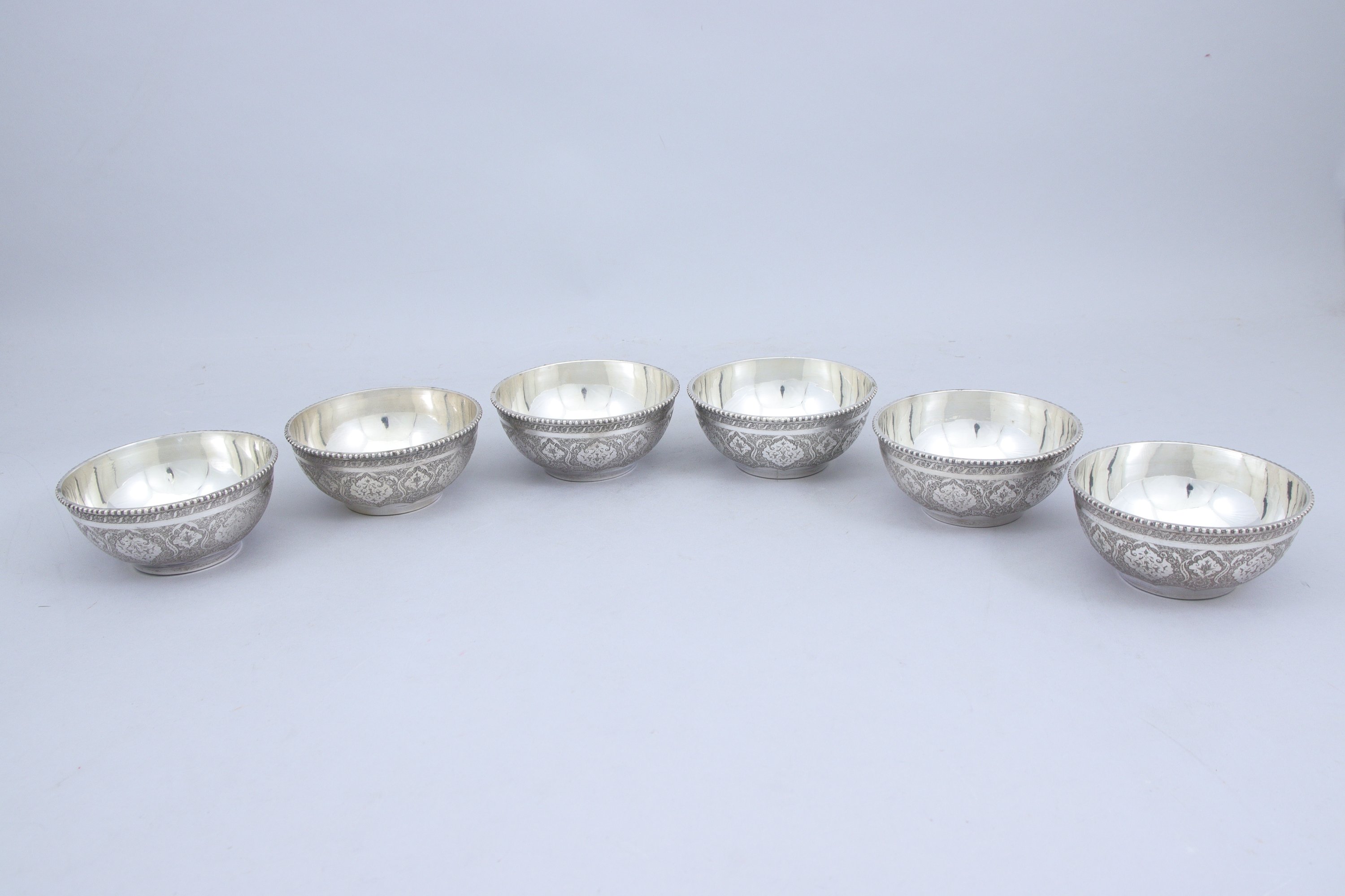en argent. La lèvre soulignée d'un rang de perles surmontant une frise de fleurettes épanouies. La panse est finement gravée de motifs végétaux formant des réserves .