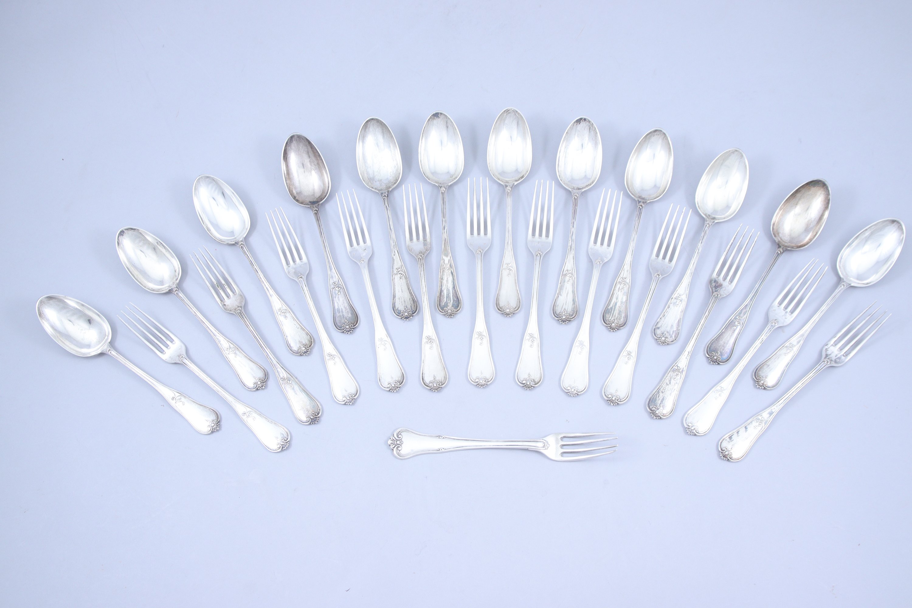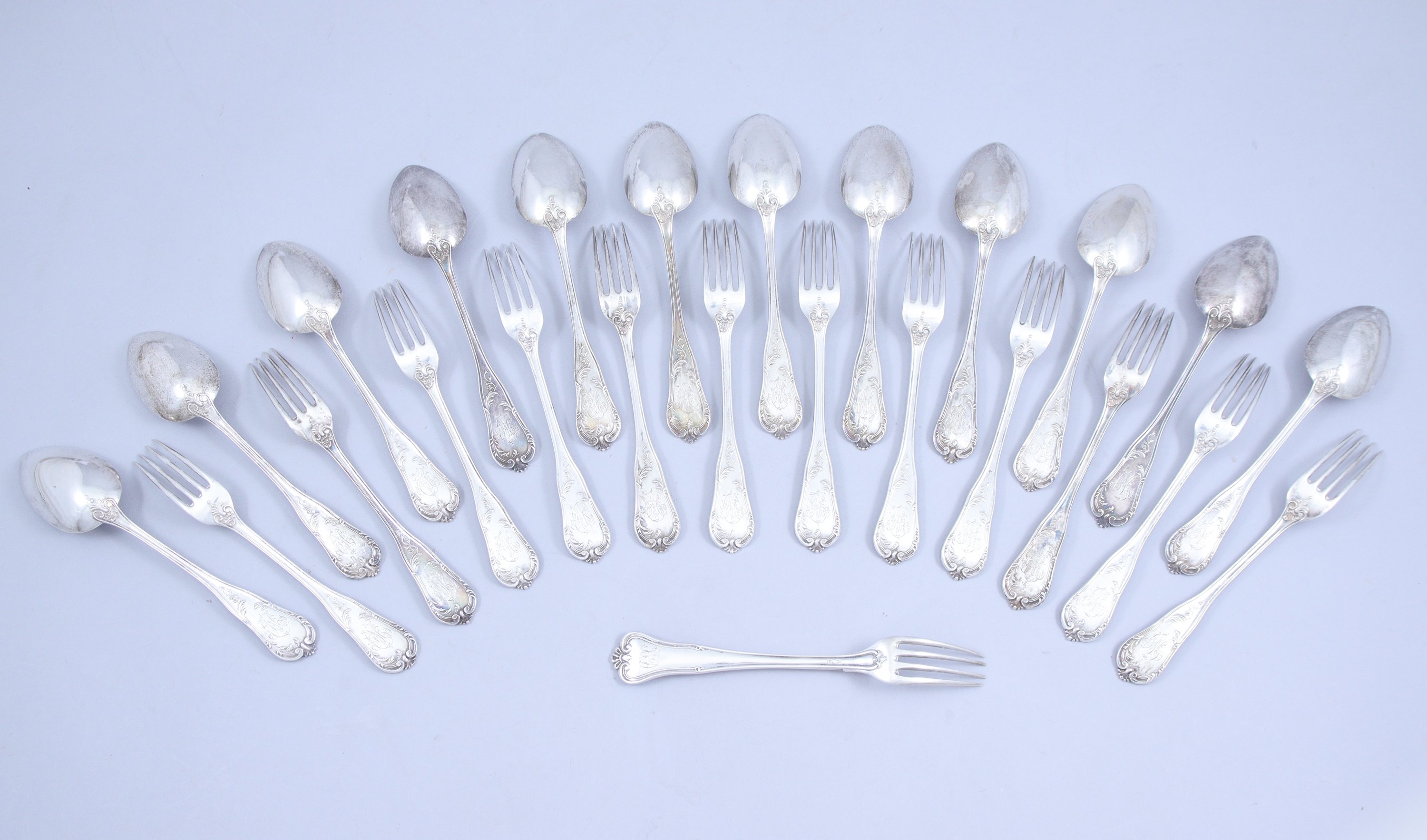 en argent, et une treizième fourchette, modèle festonné et feuillagé.