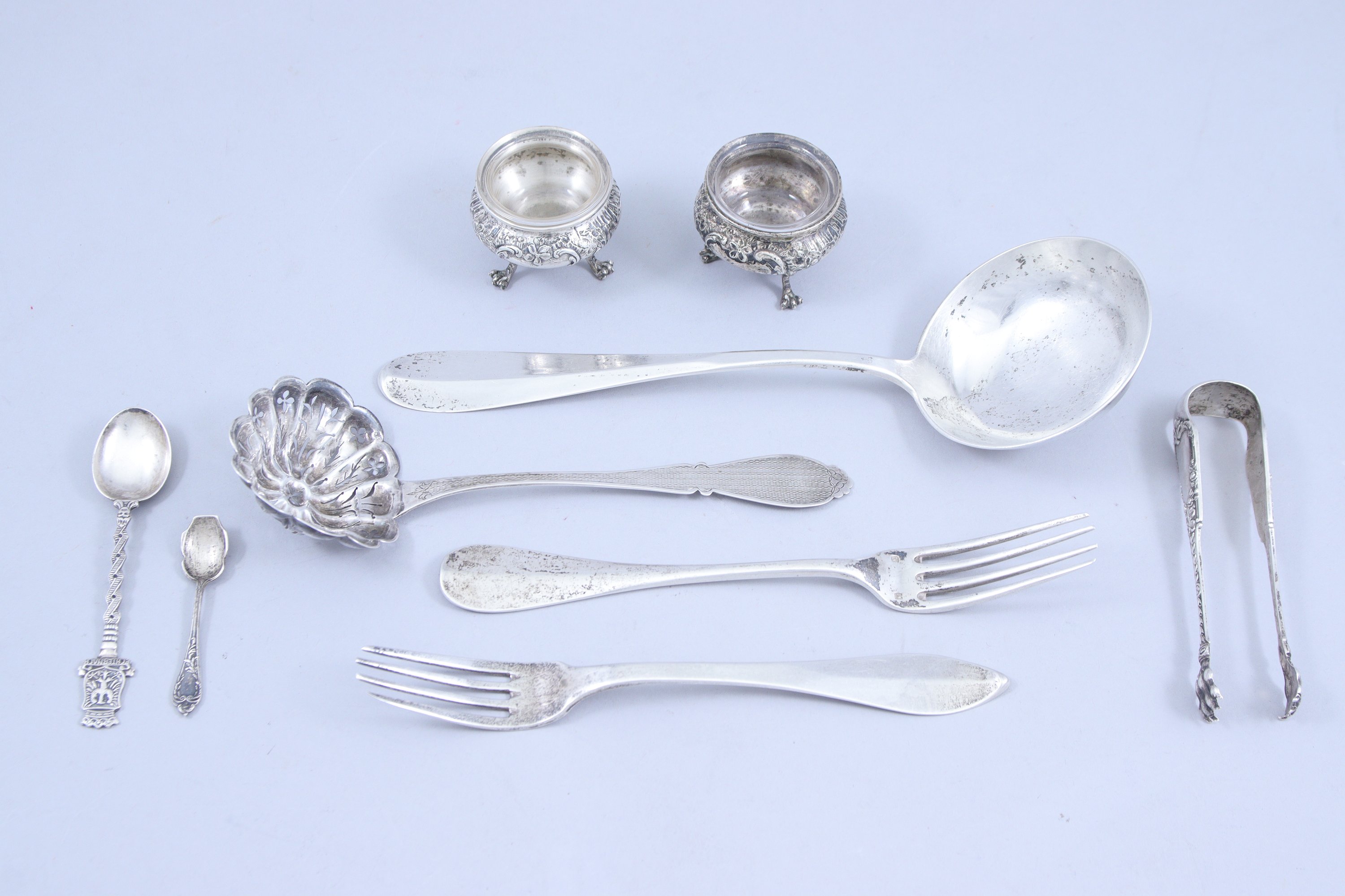 Joint : une louche, une pince à sucre et une paire de salerons en argent (poinçons de titre étranger) ainsi qu'une cuiller à saupoudrer en argent (poinçon Minerve) et deux fourchettes (Poids : 380 gr), et deux cuillers en métal.