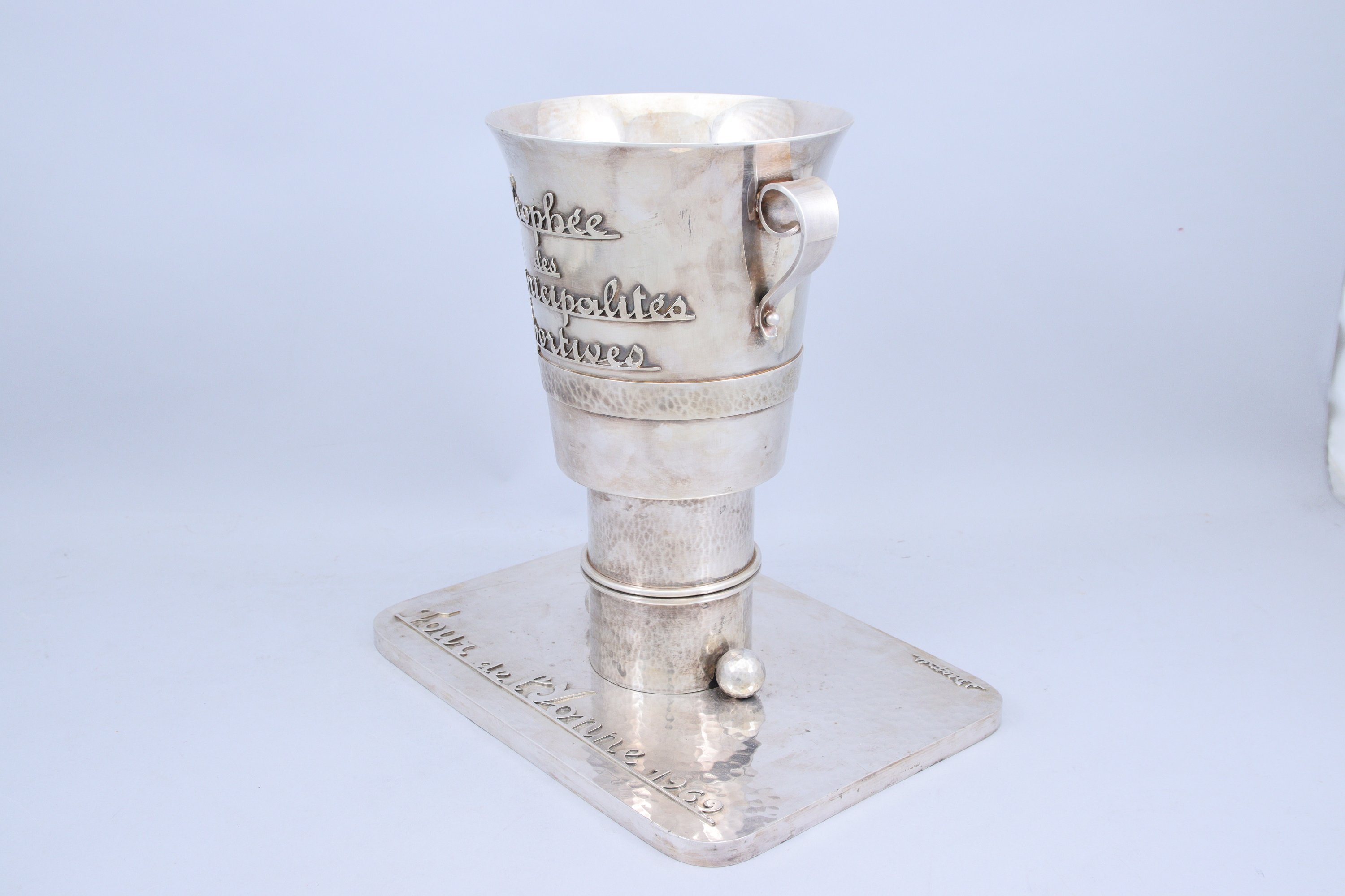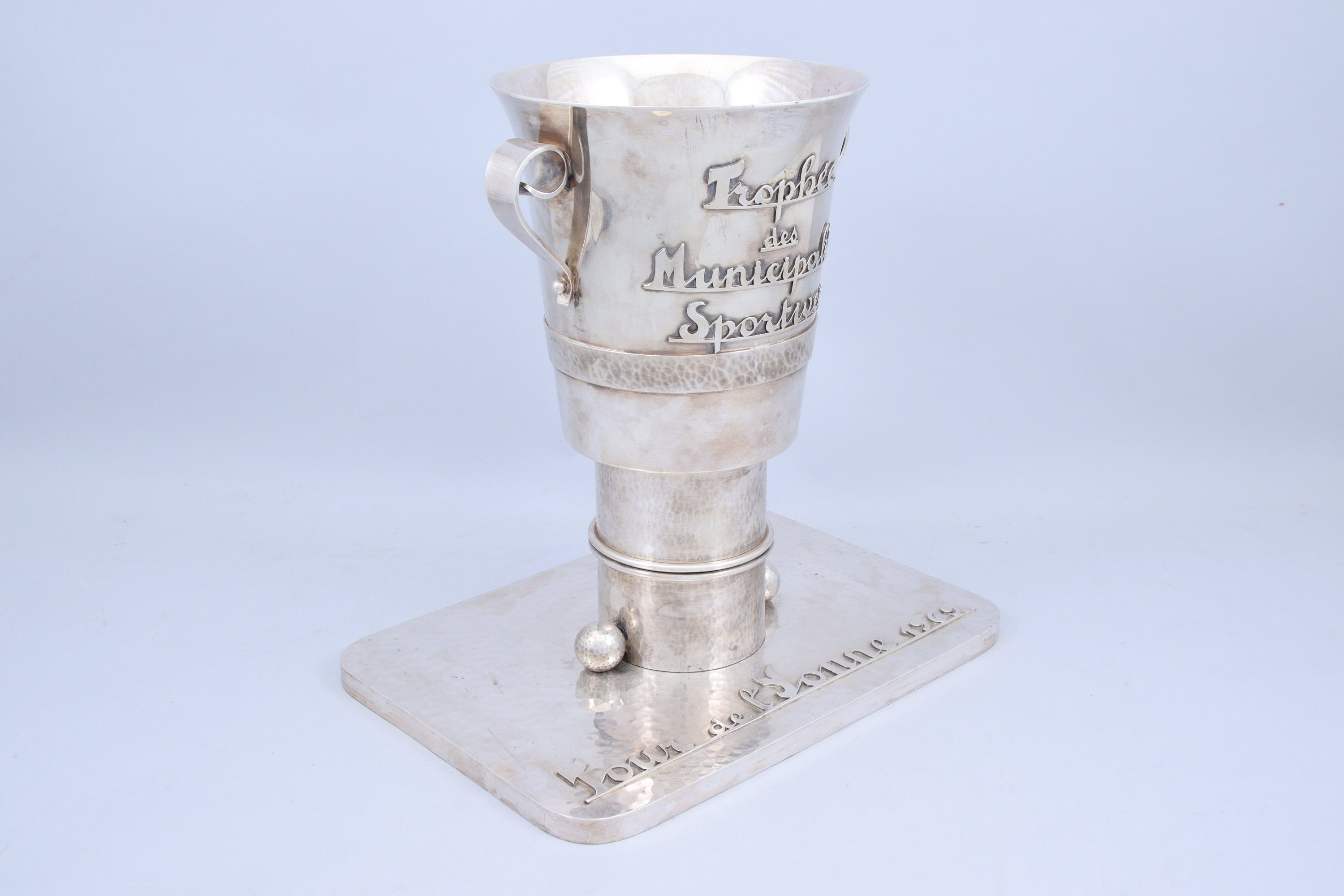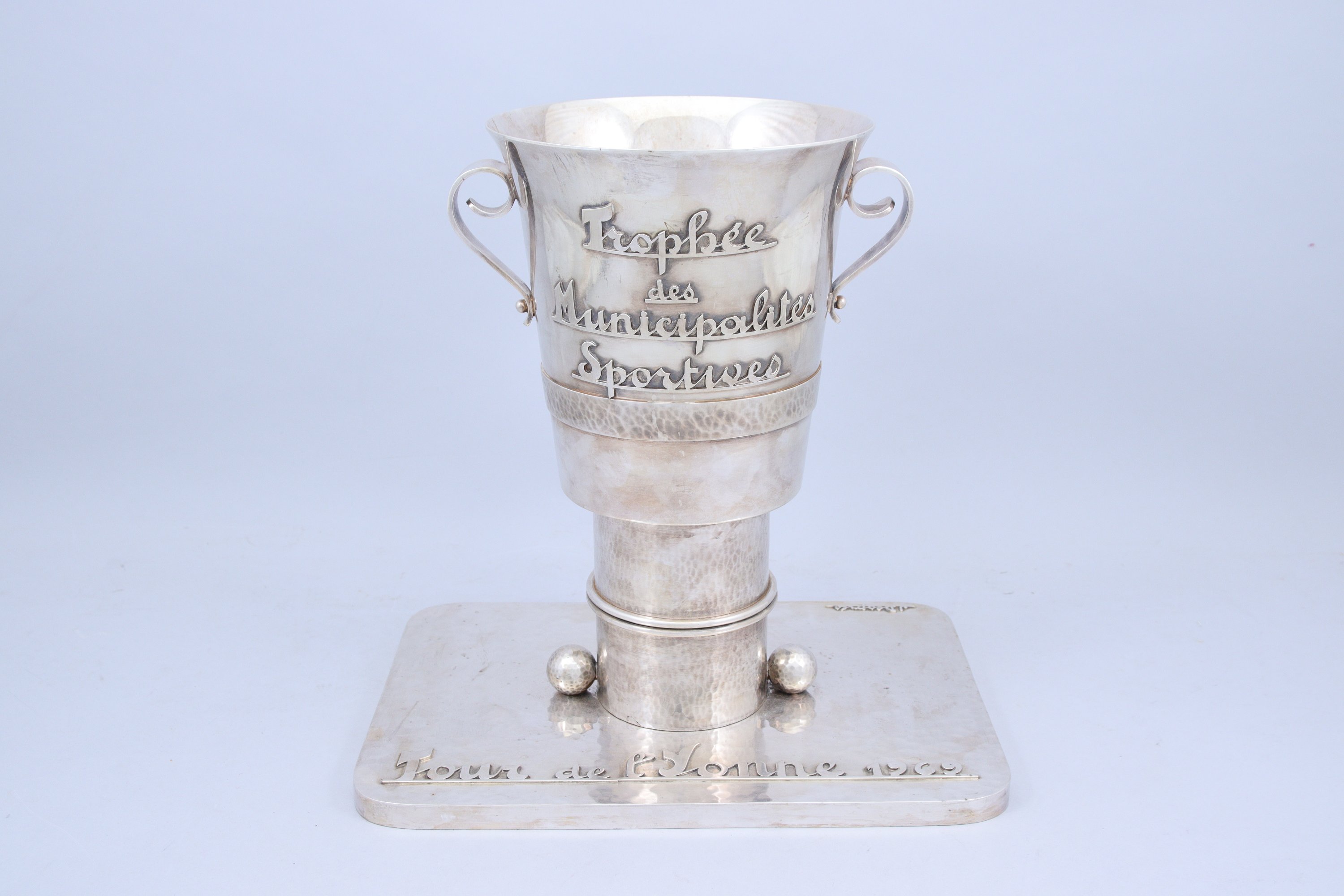 en métal argenté, soudé et martelé. La coupe de forme évasée présente deux anses terminées par une boule entourant la mention "Trophée des municipalités sportives". Deux boules épaulent le pied sur un socle de forme rectangulaire aux angles arrondis.