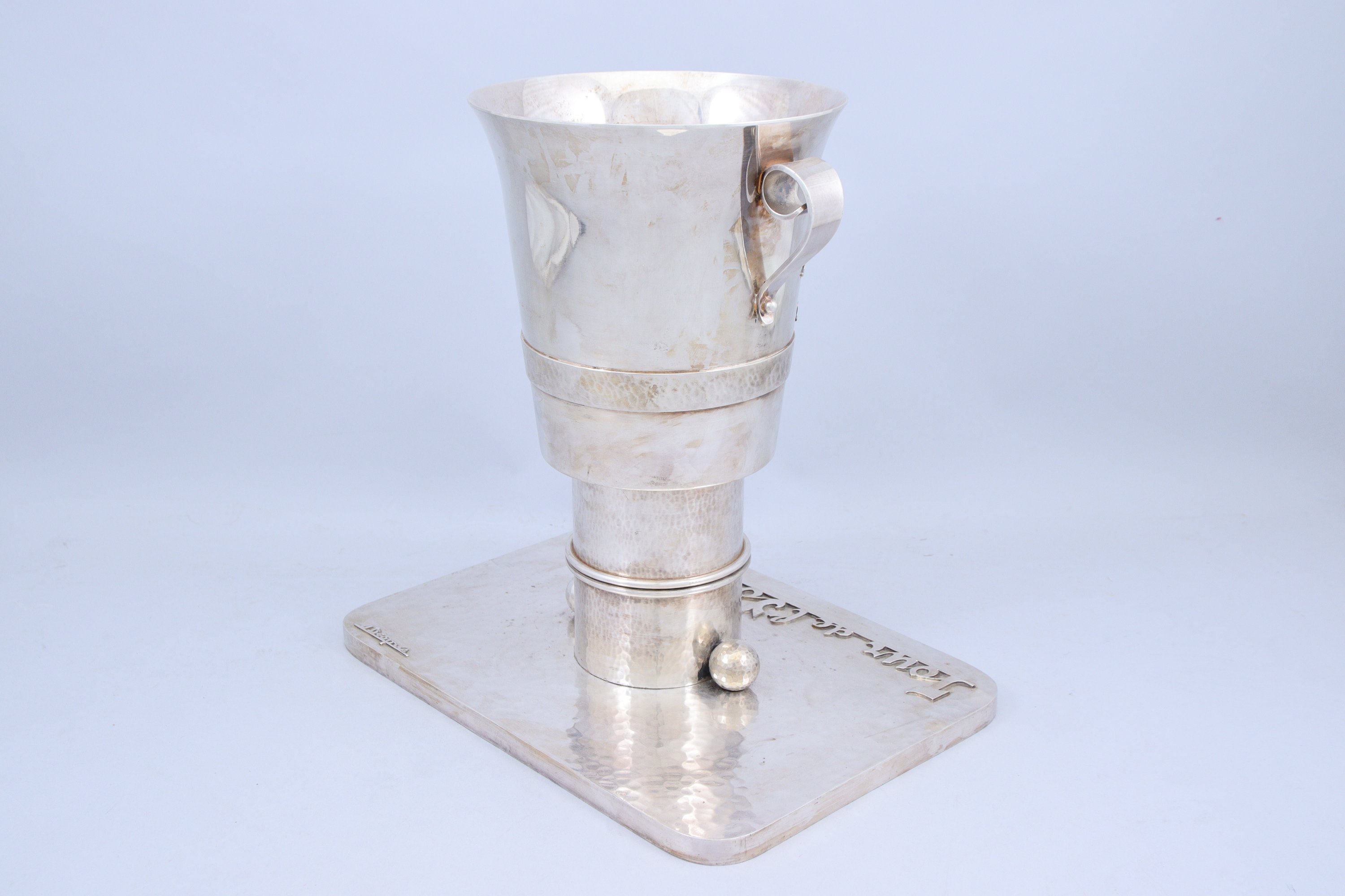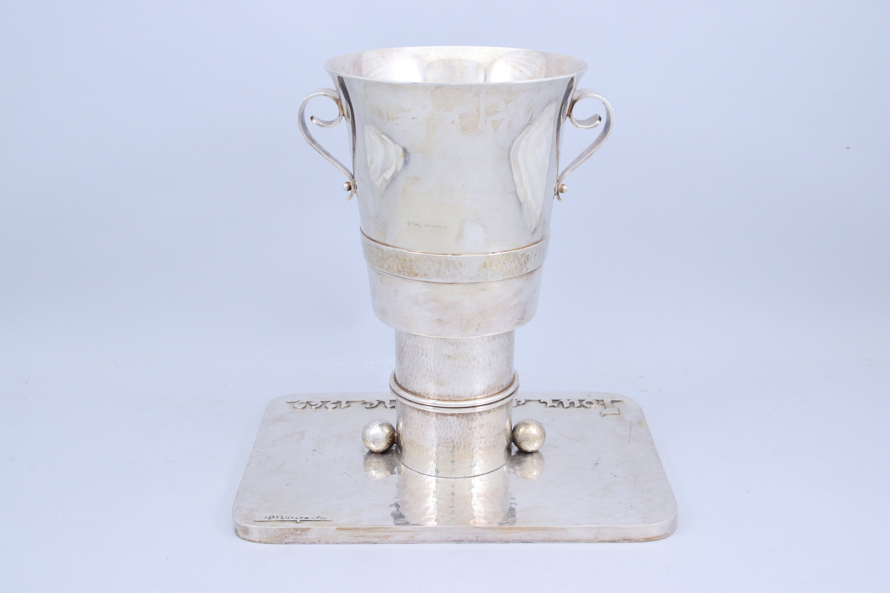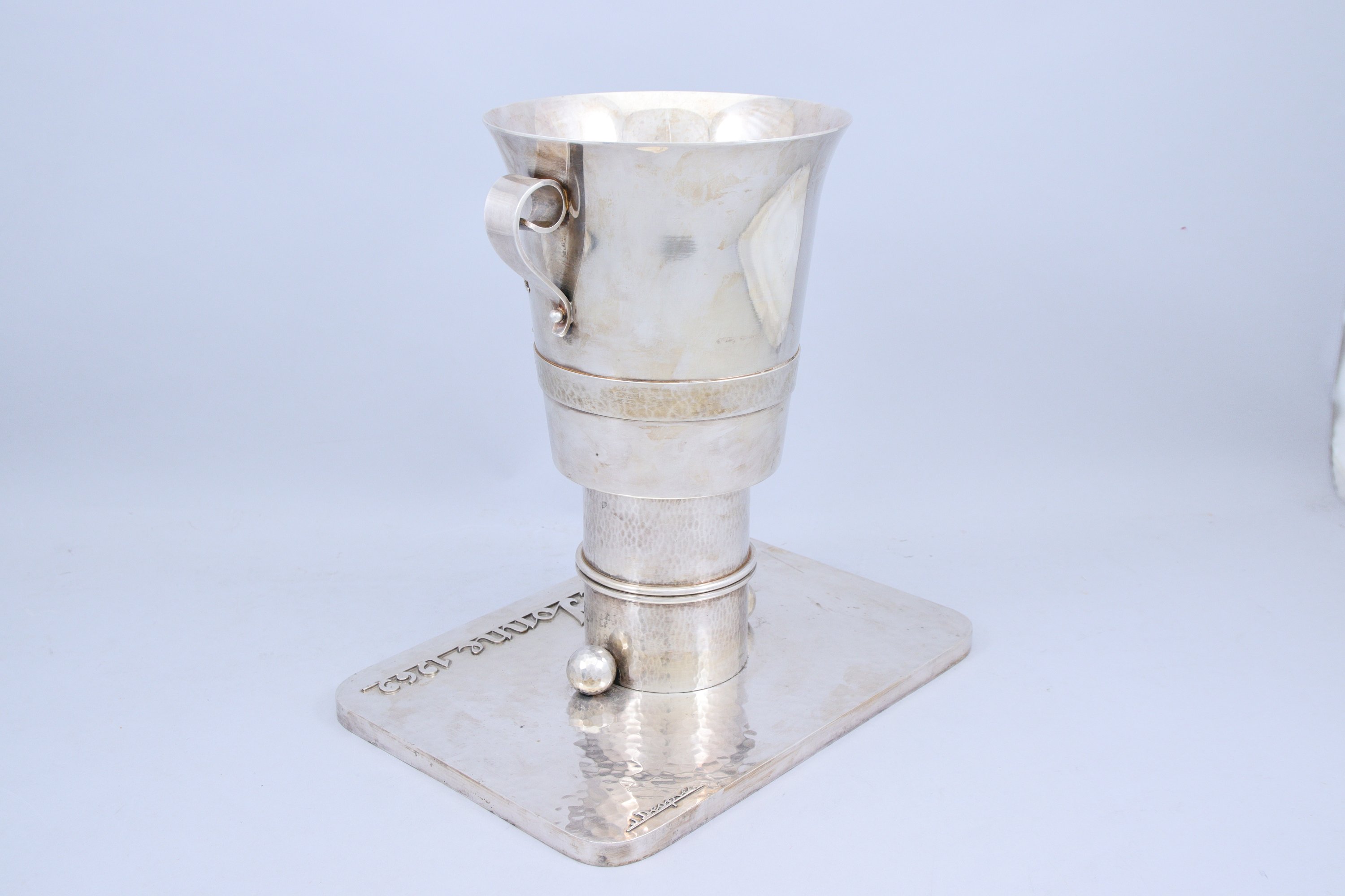 en métal argenté, soudé et martelé. La coupe de forme évasée présente deux anses terminées par une boule entourant la mention "Trophée des municipalités sportives". Deux boules épaulent le pied sur un socle de forme rectangulaire aux angles arrondis.