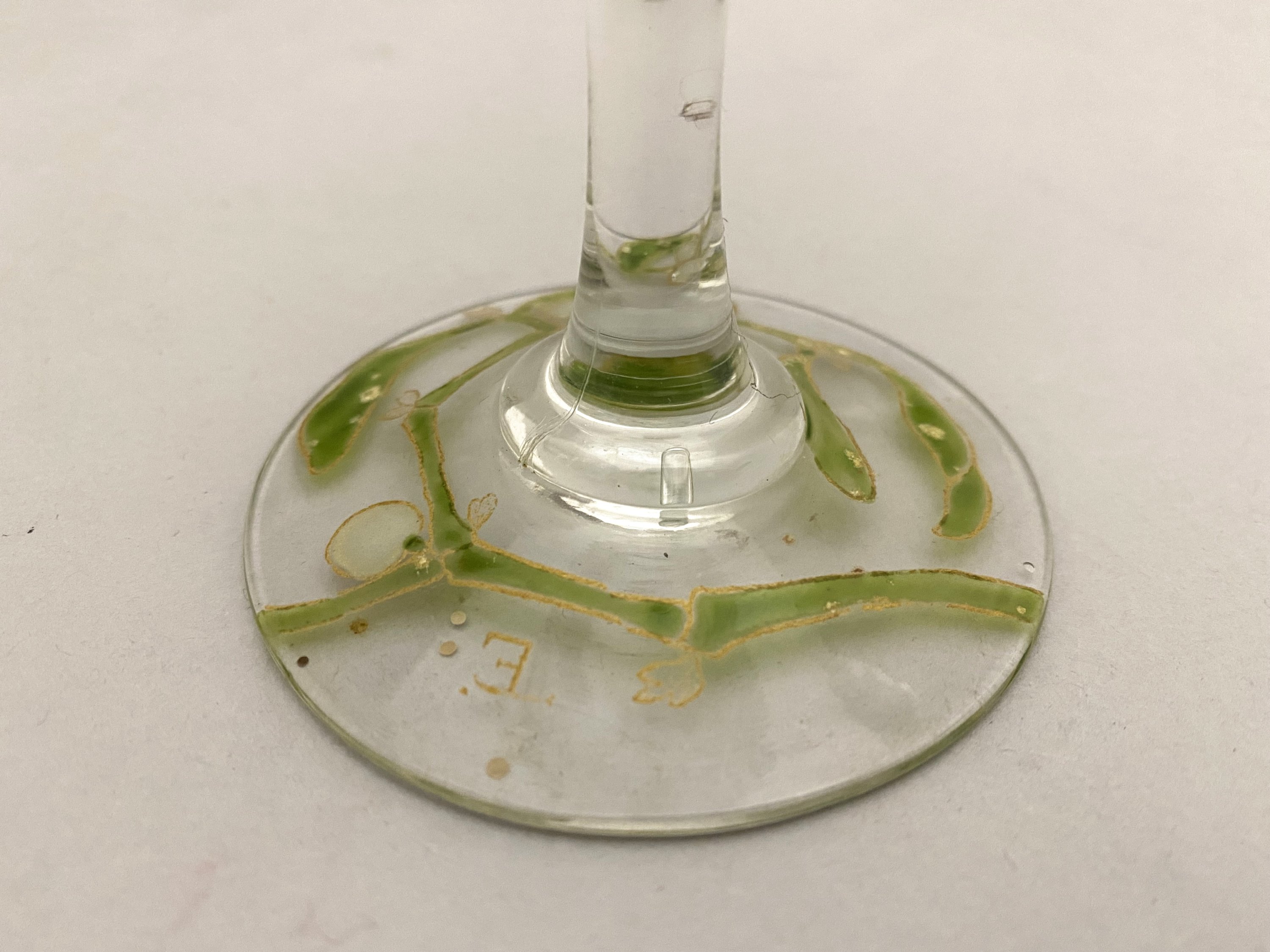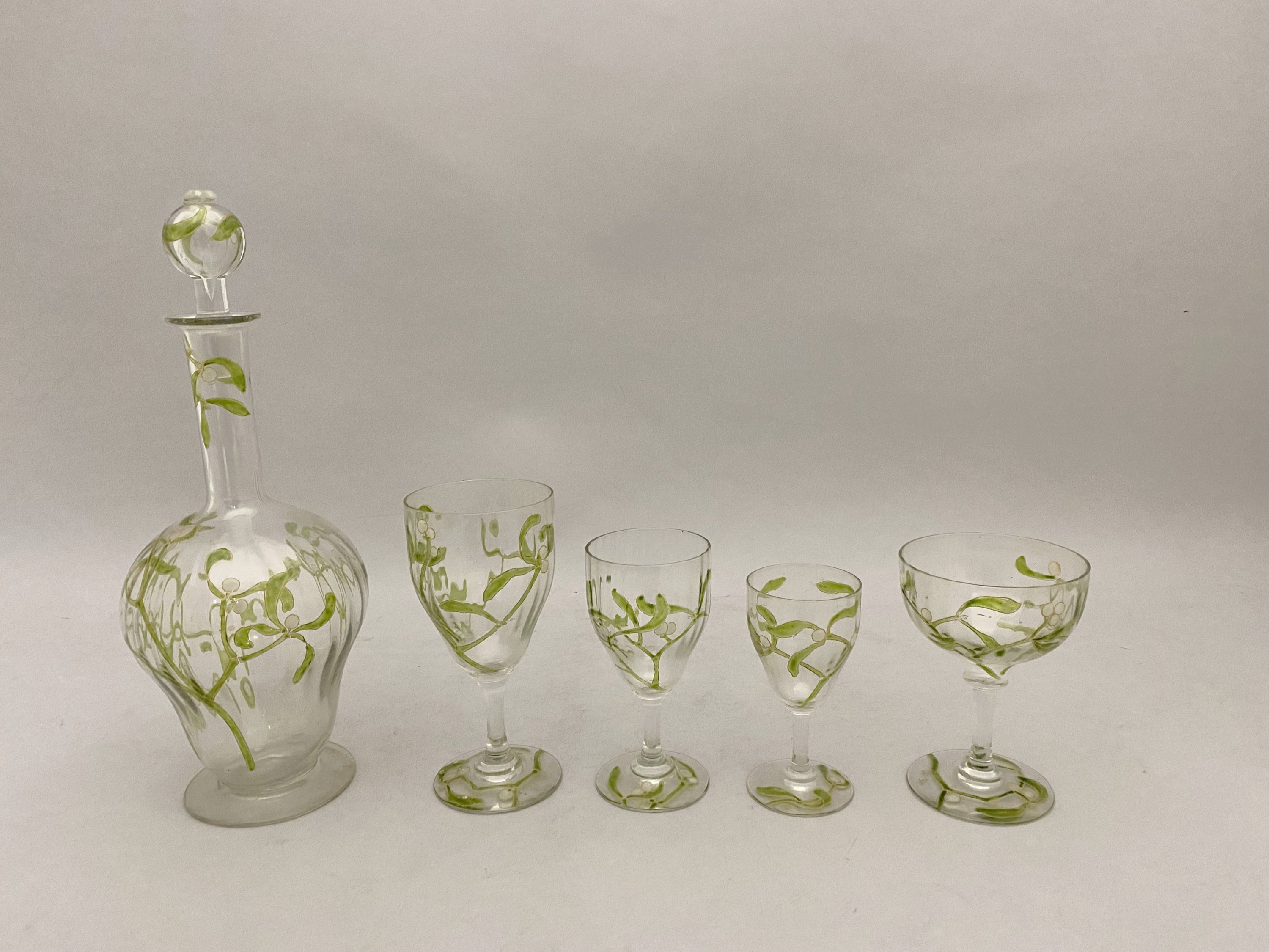 seize pièces en verre soufflé, émaillé, doré, signé ou monogrammé comprenant deux carafes, trois verres à eau, trois verres à vins, trois verres à madères et cinq coupes à champagne.