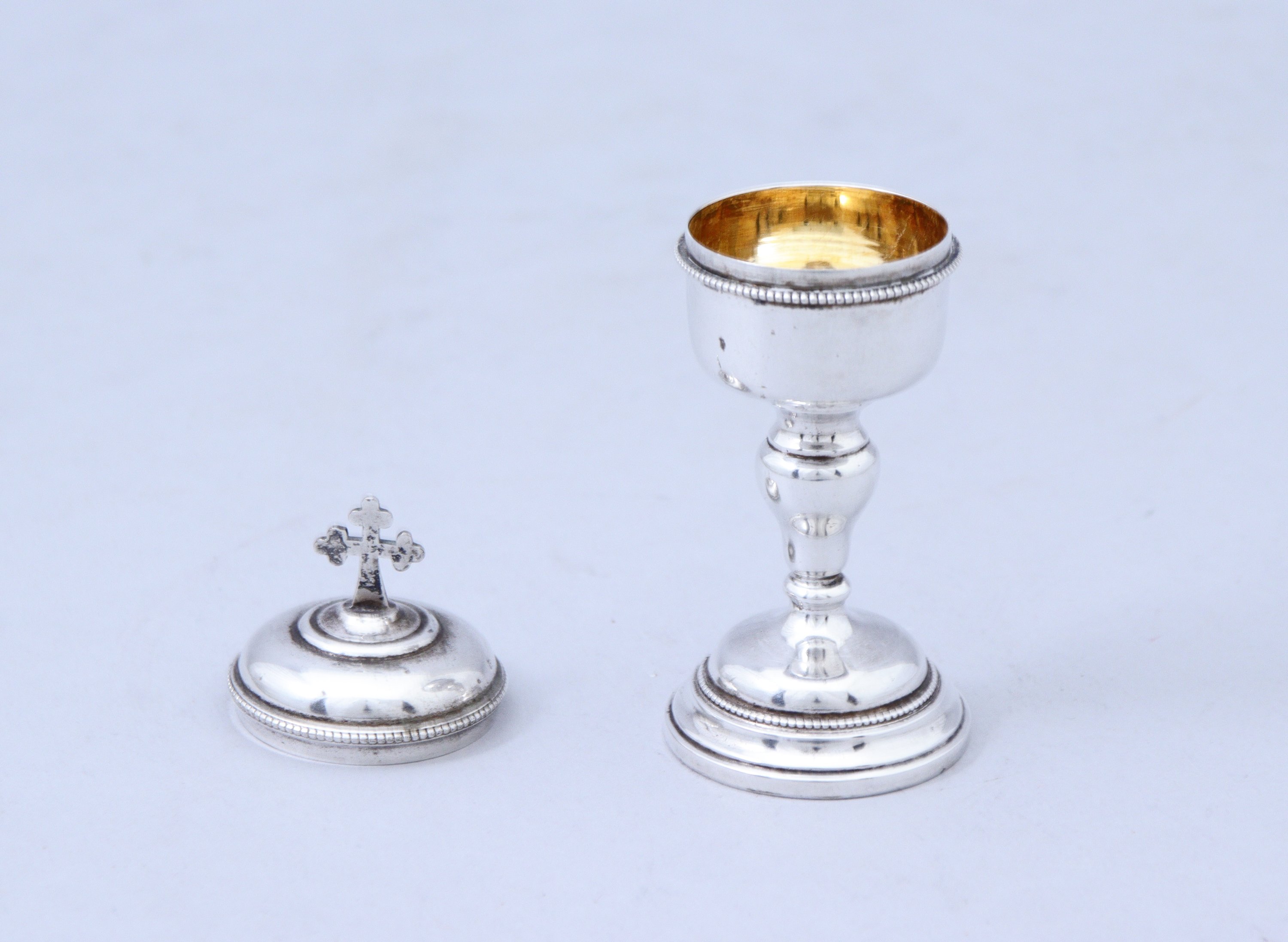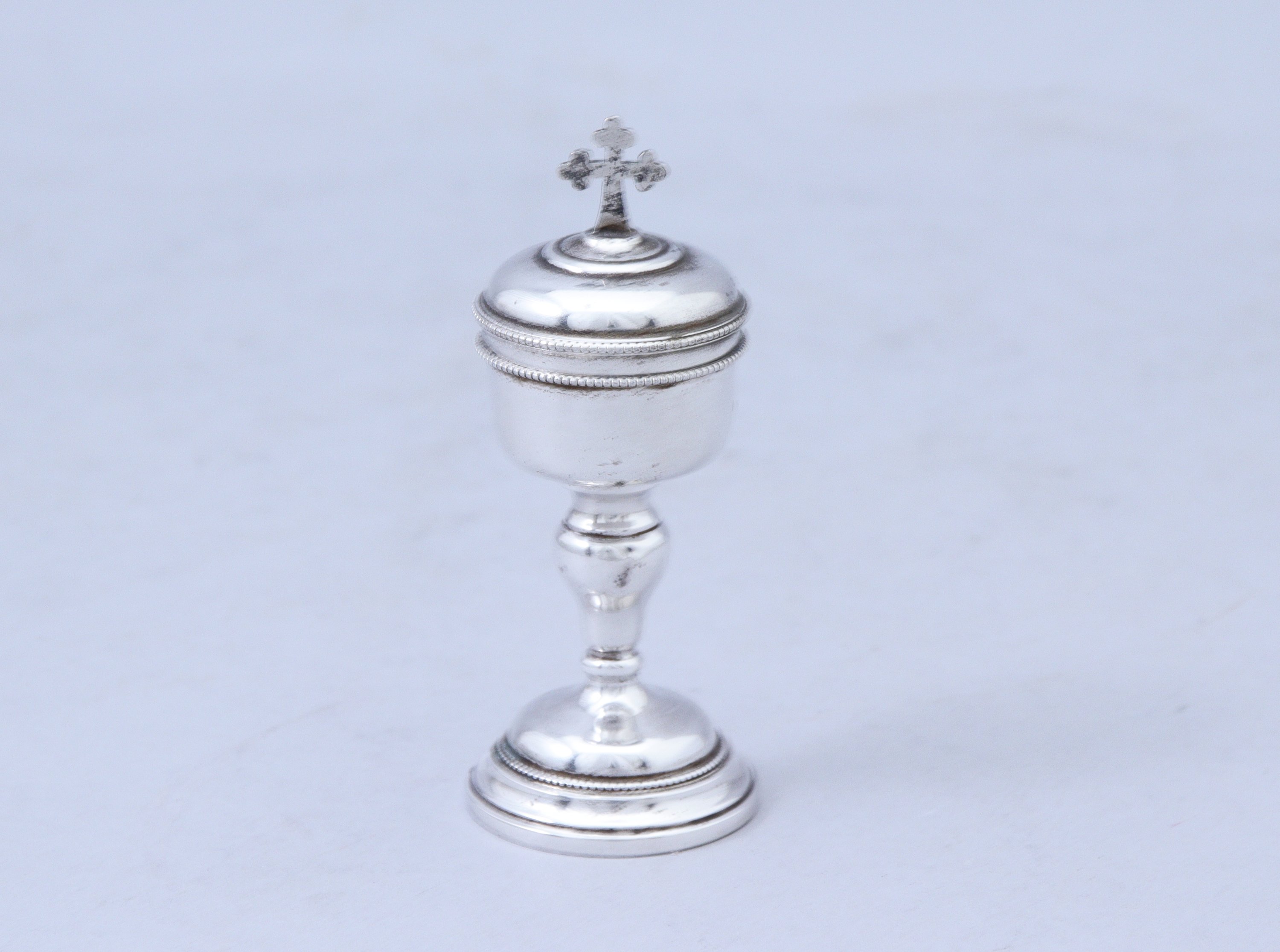 en argent, l'intérieur doré. Le couvercle coiffé d'une croix, le pied balustre, la base circulaire soulignée d'une frise de perles.
