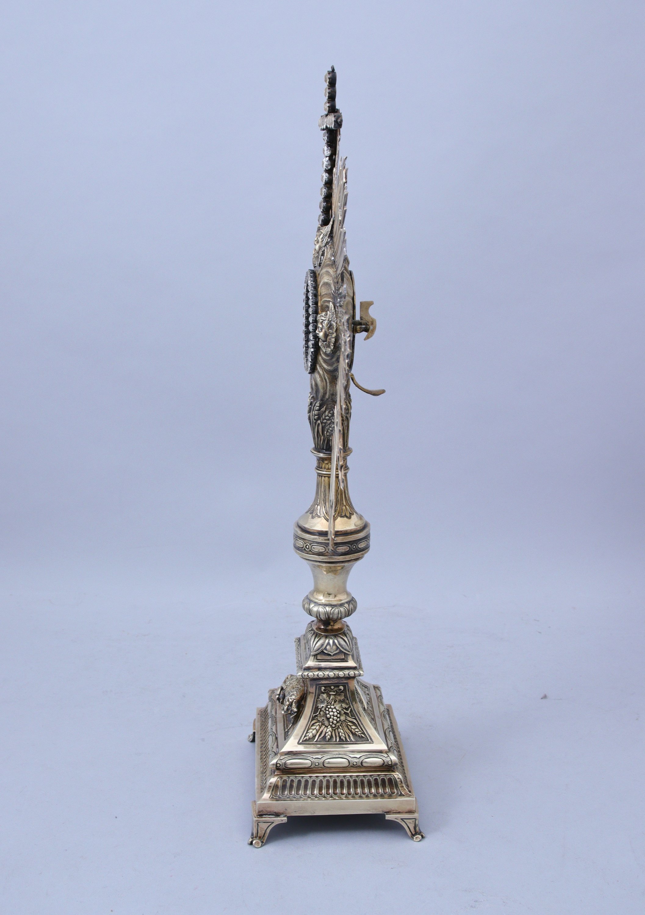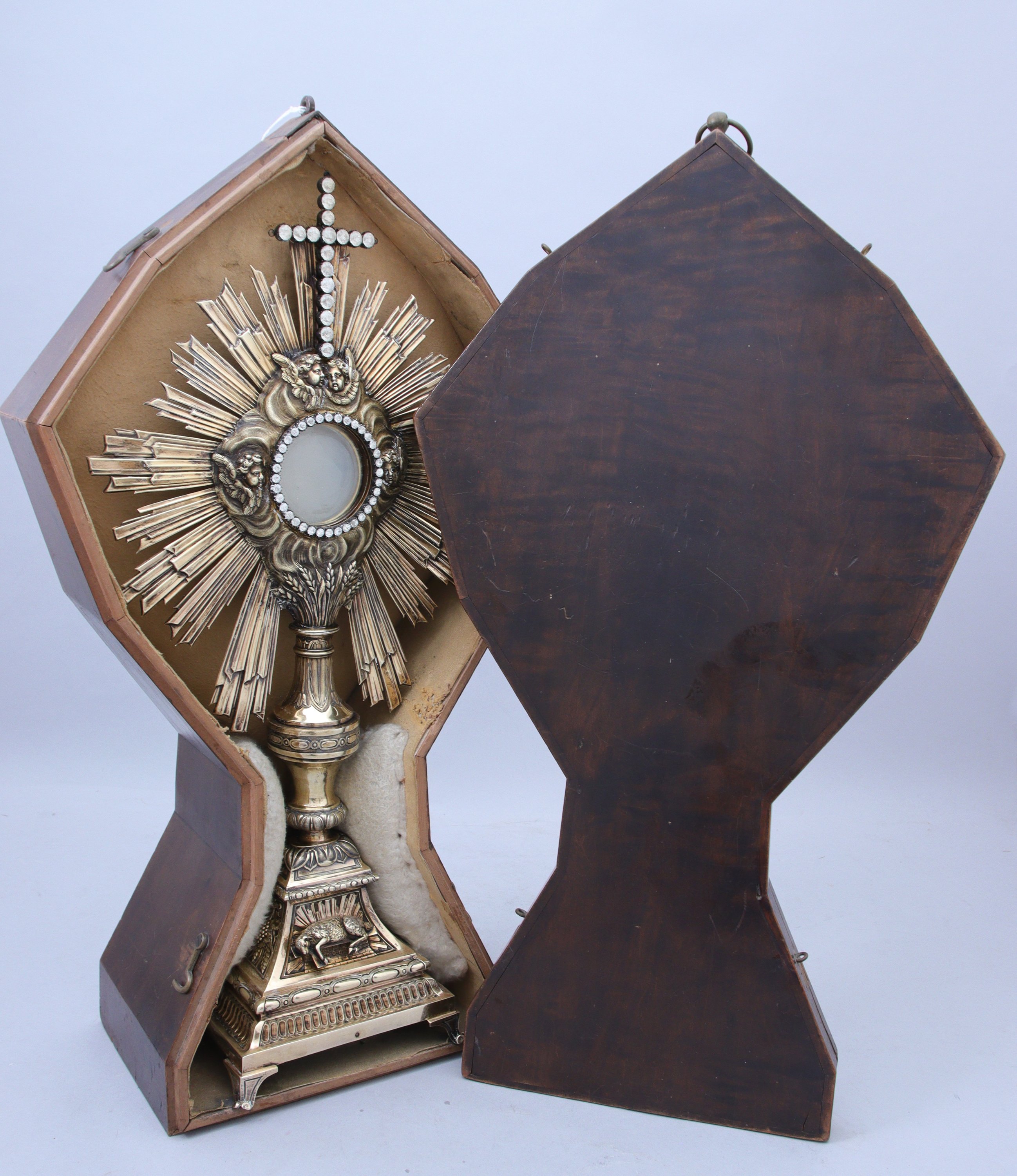 en vermeil, à décor en repoussé. Une croix sertie de pierres blanches surmonte la monstrance rayonnante entourée de pierres et visages d'angelots dans des nuées. Le pied en forme de fagot de blé, la base rectangulaire ornée de l'agneau mystique, de pampres et d'épis de blé. Il repose sur quatre pieds en enroulement.
