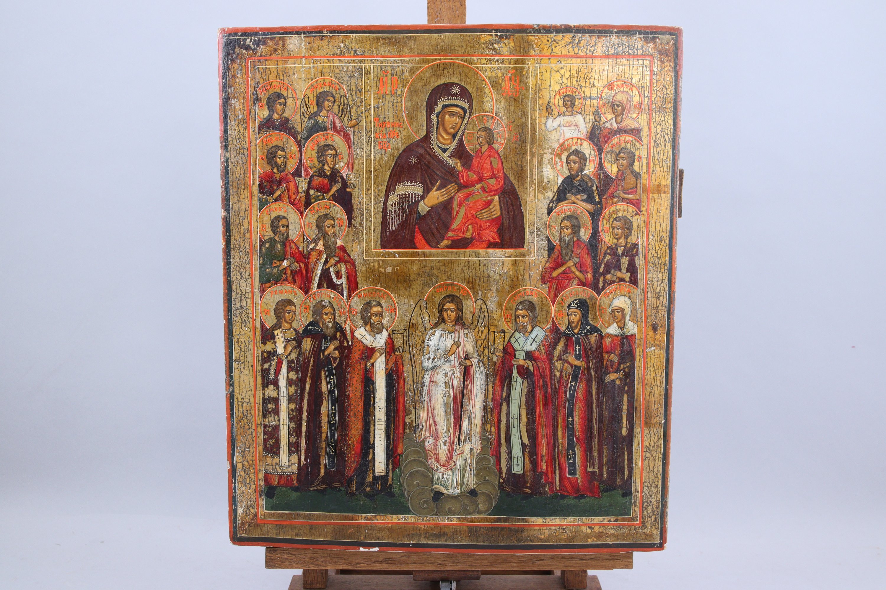 Icône de la cathédrale de la Mère de Dieu de Tikhvine, entourée de saints et de larchange protecteur.