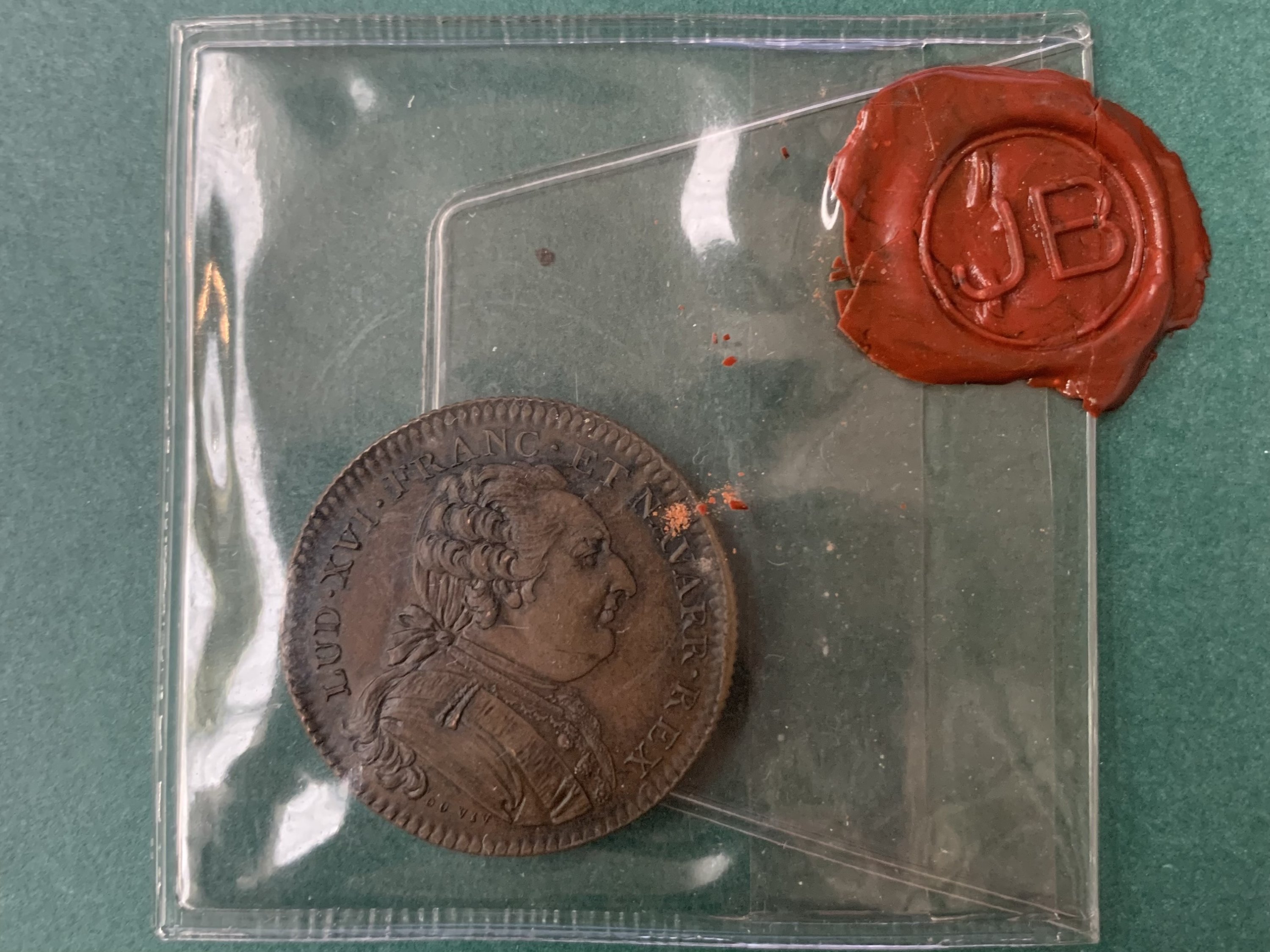 Avers du jeton royal et revers d’un essai utilisé pour Louis XVII. Cf Gad (1989)40 ; VG 248 var.