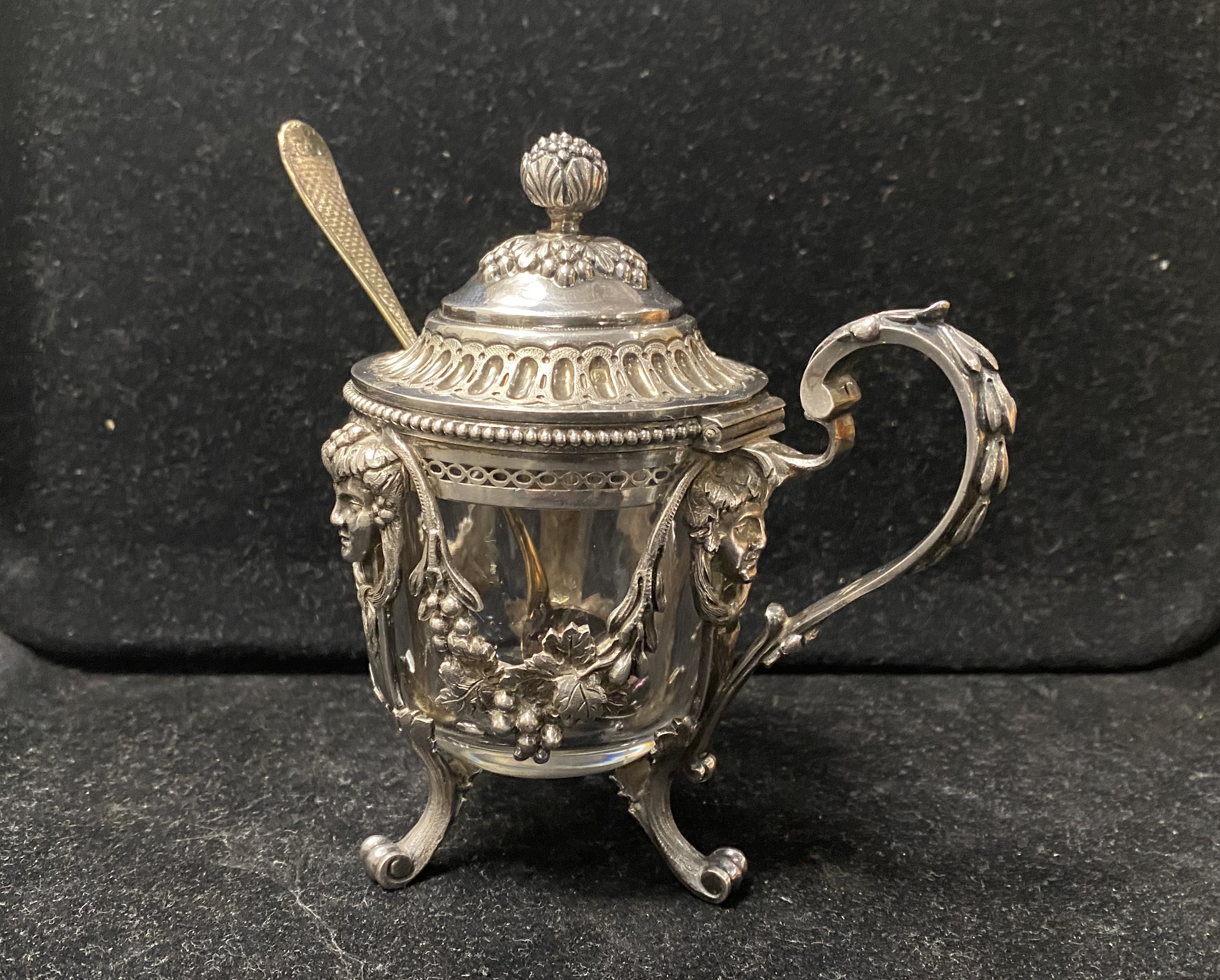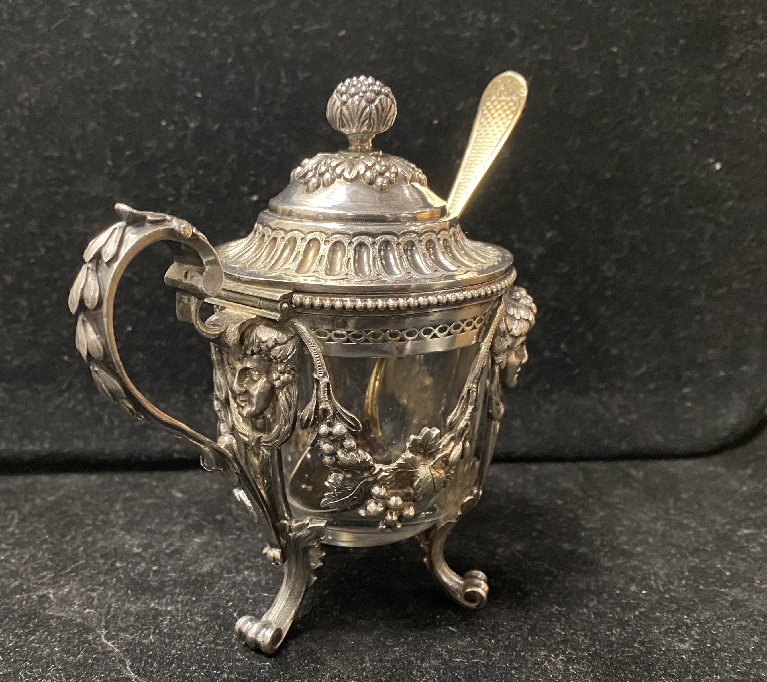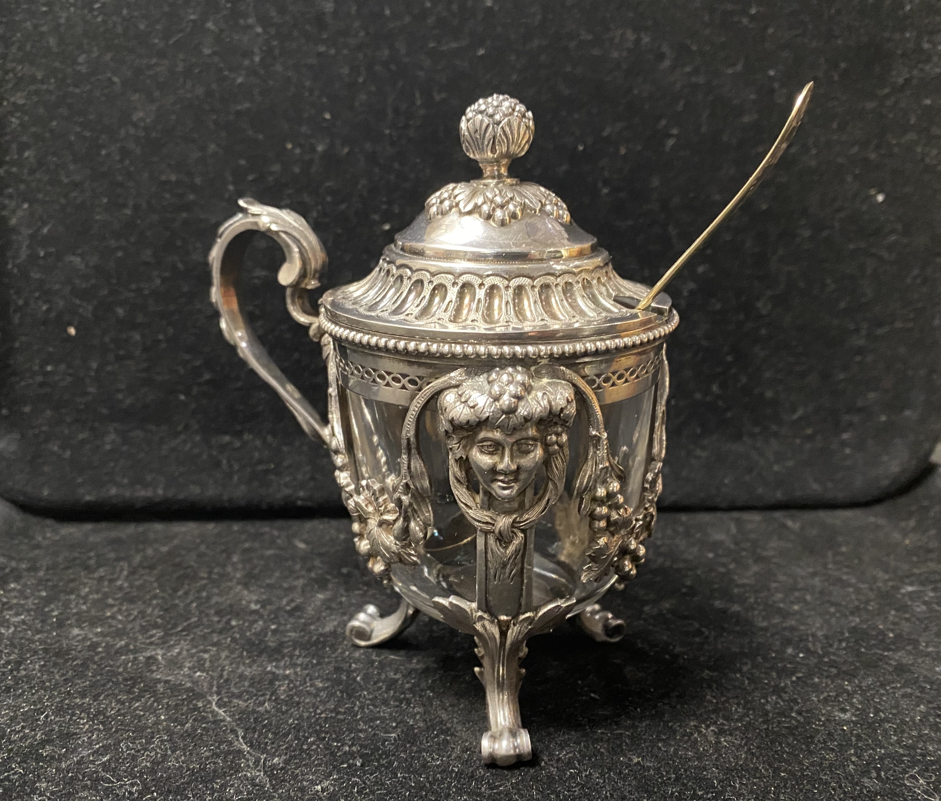 en argent reposant sur trois pieds en enroulements surmontés de mascarons réunis par des guilrandes fleuris. Anse feuillagées et prise en pomme de pin. Réceptacle en cristal et petite louche en vermeil monogrammaé RP.