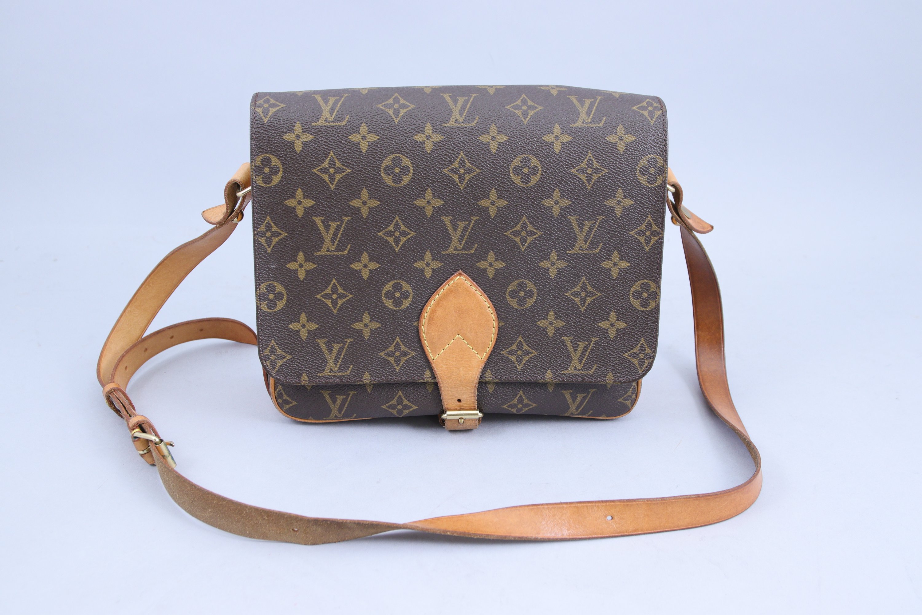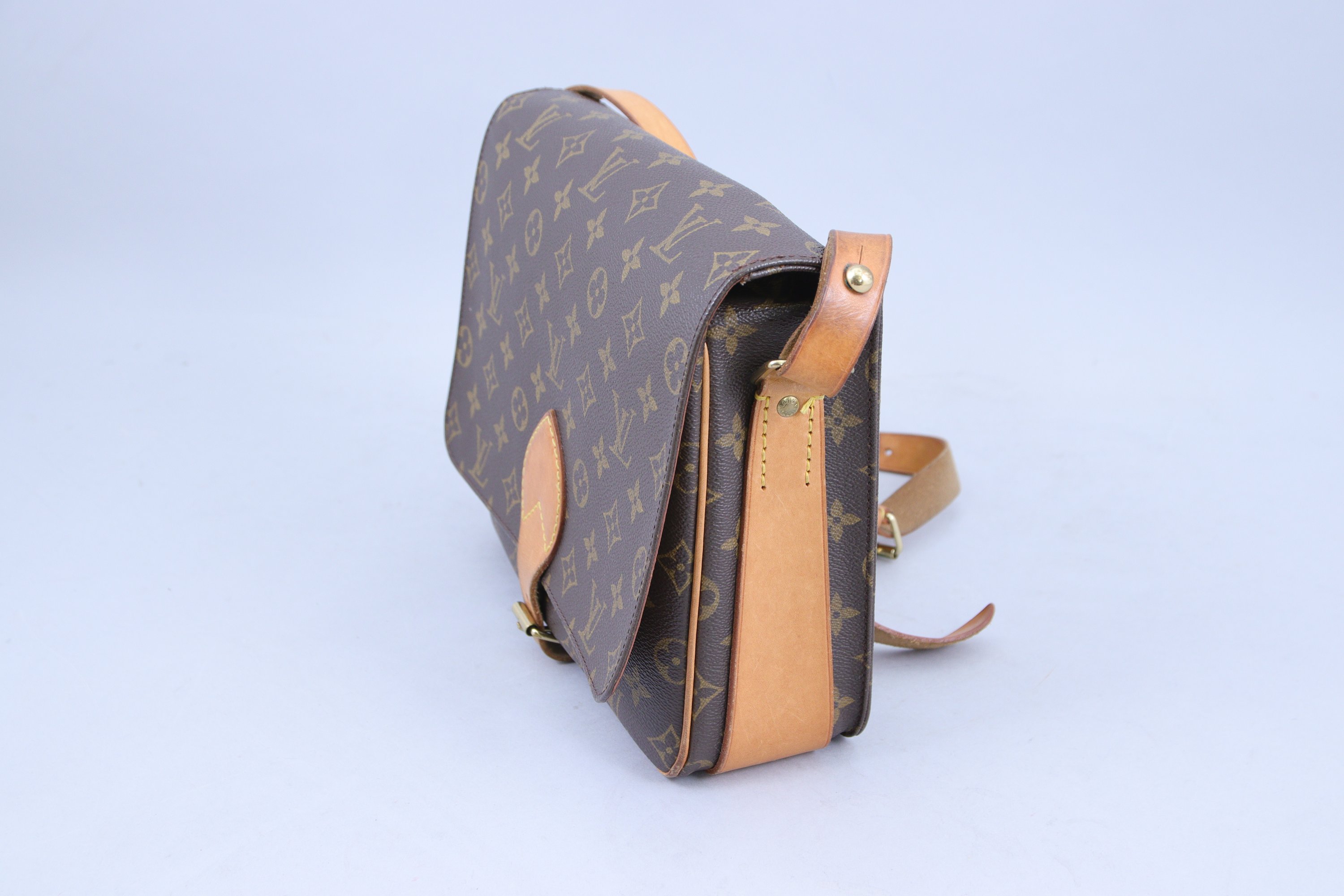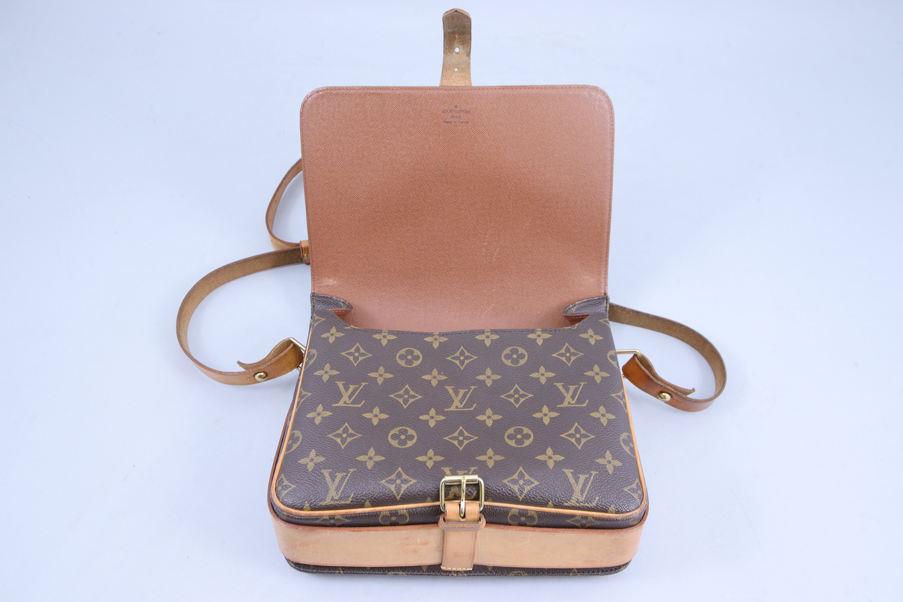 Sac cartouchière en cuir monogramme, l'intérieur et la bandoulière gold, surpiqure jaune sur le fermoir.