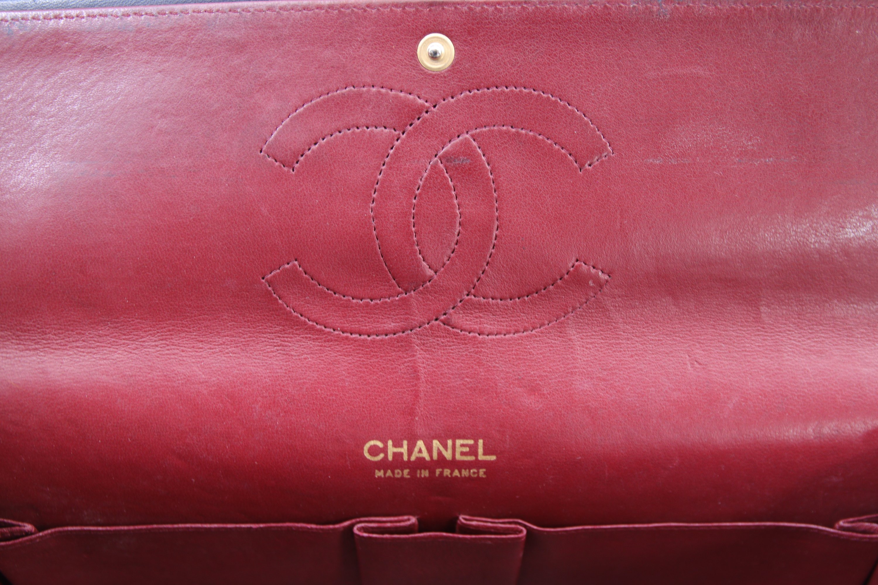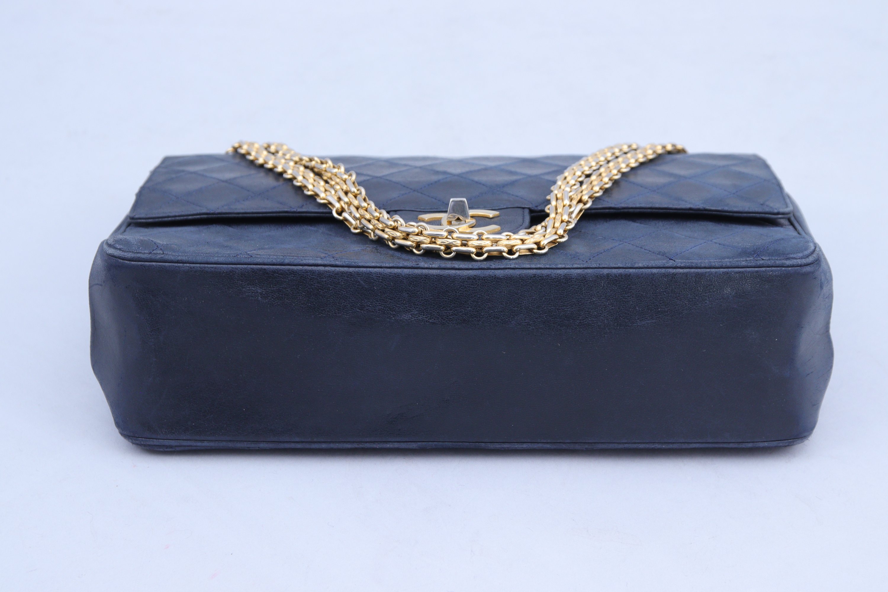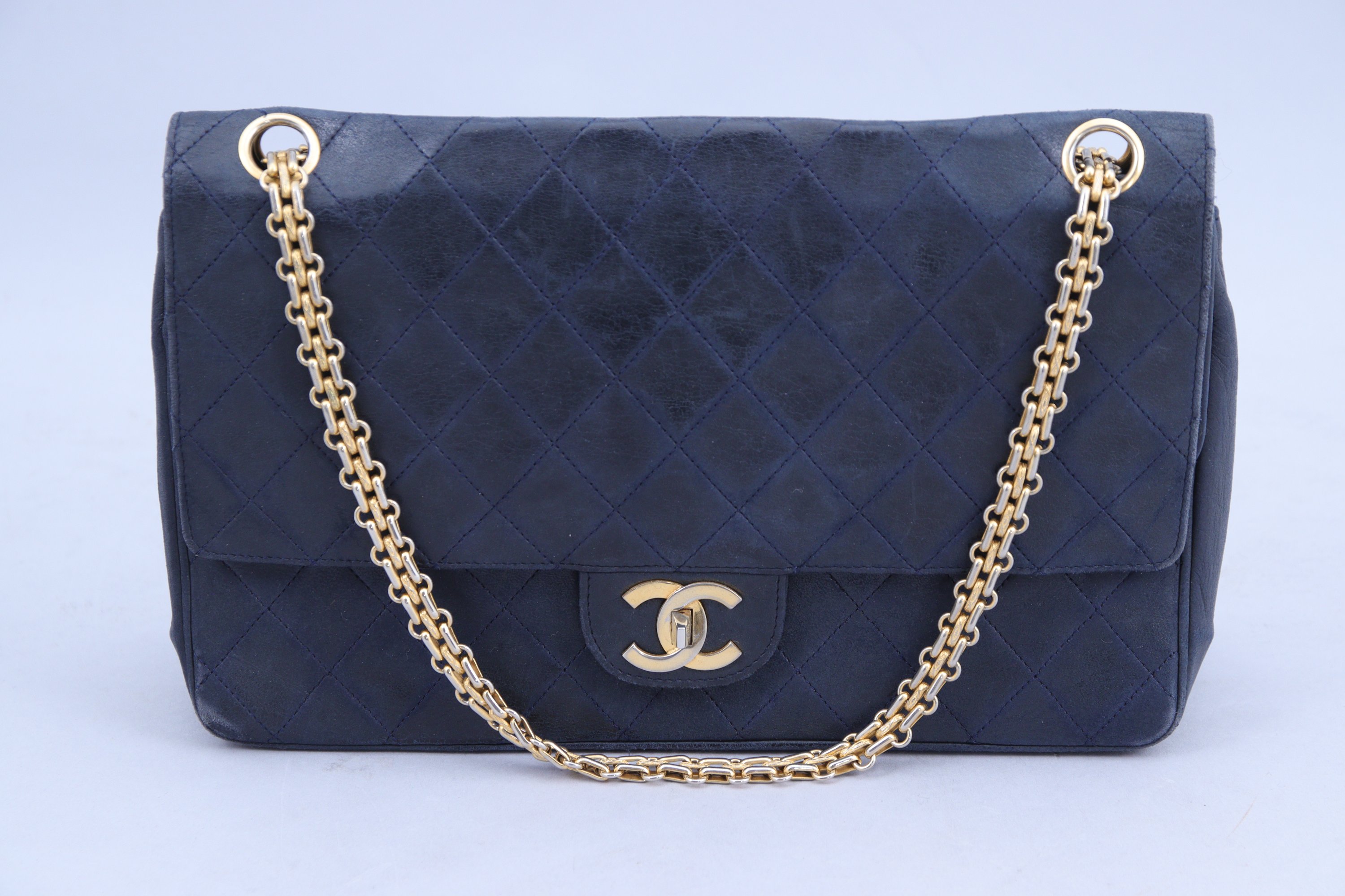 en cuir d'agneau teinté bleu, doublure intérieure bordeaux, fermoir siglé aux C entrelacés. Pochette zippée dans le rabas, et pochette extérieure au dos. Bandoulière Timeless en maillons de métal doré.