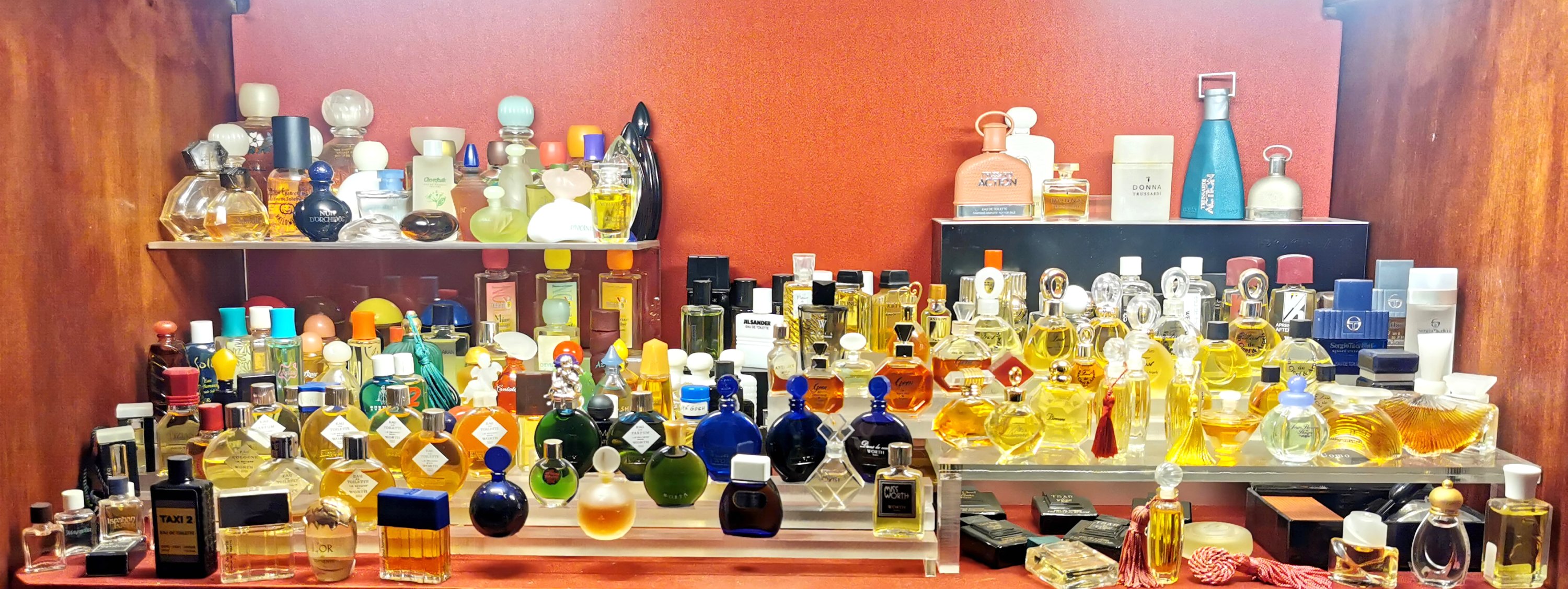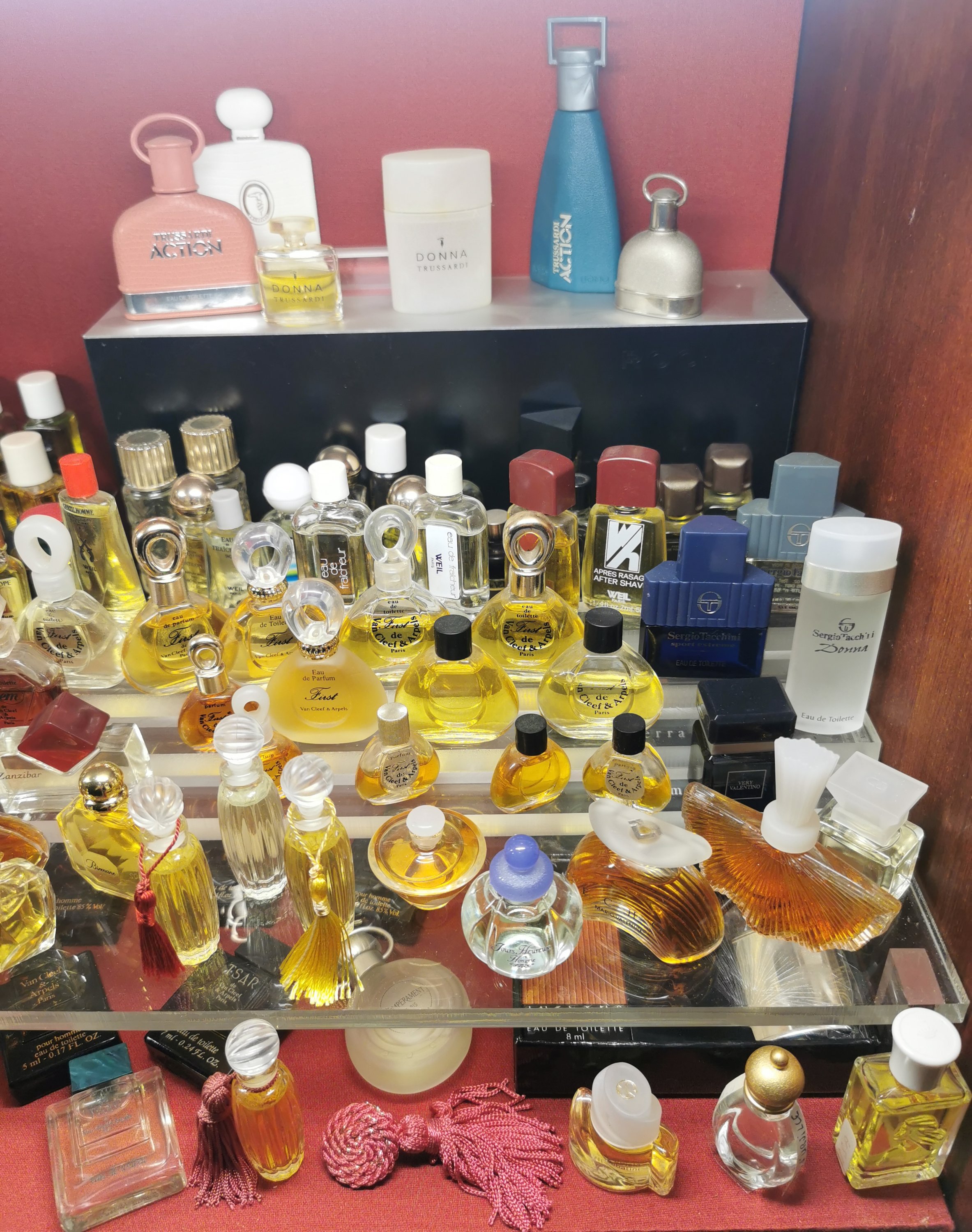 Assortiment d’environ 150 diminutifs parfums ou échantillons de parfums, la plupart avec leur étui carton titré.
