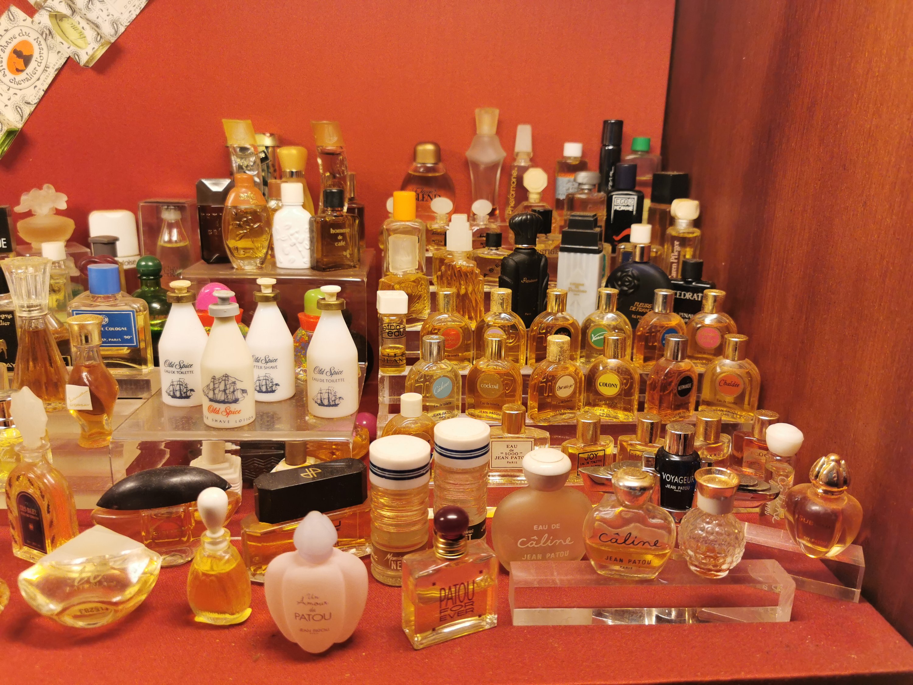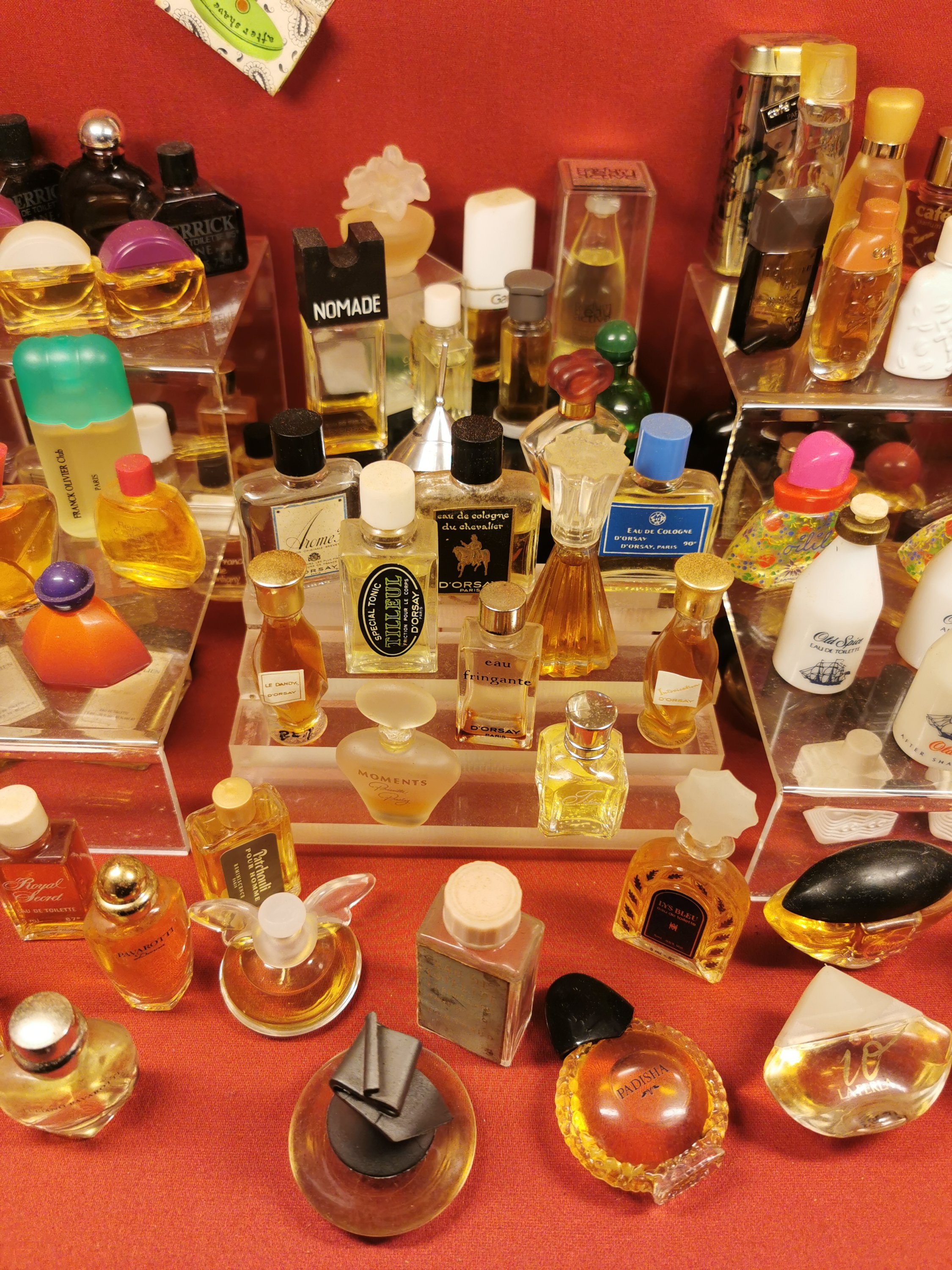Assortiment d’environ 180 diminutifs parfums ou échantillons de parfums, la plupart avec leur étui carton titré.