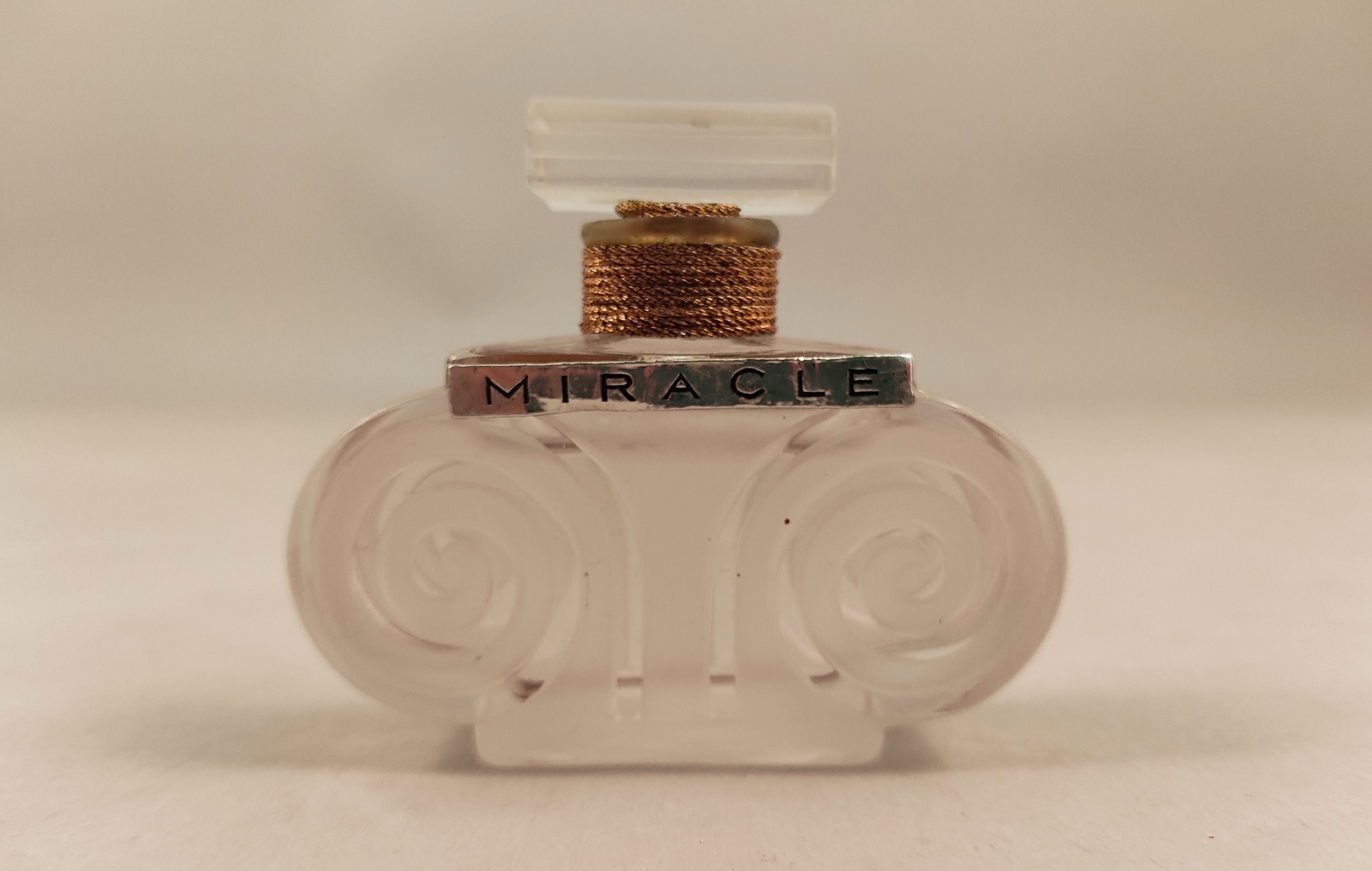 Flacon en verre incolore dépoli figurant un chapiteau de colonne ionique.
