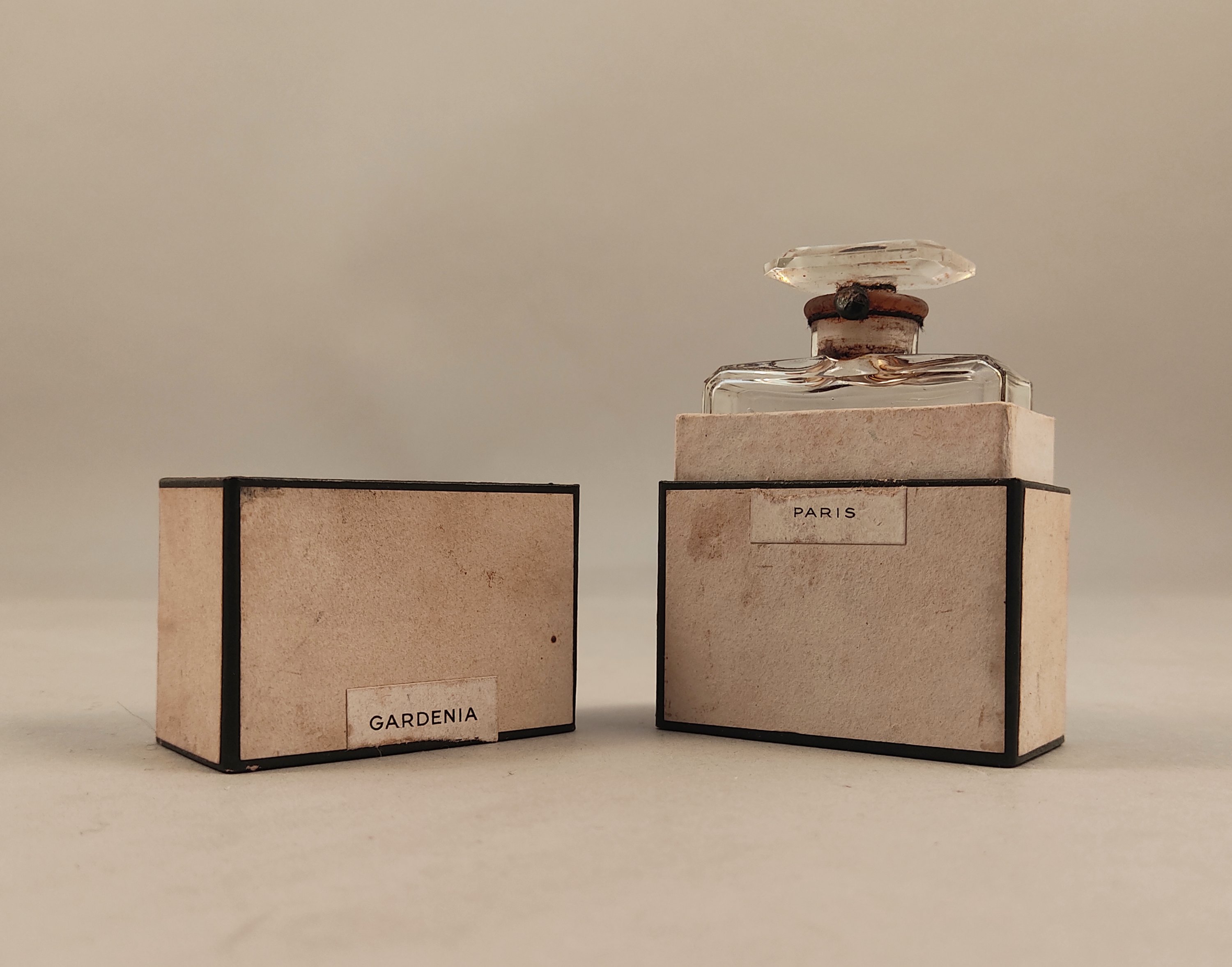 Flacon en verre incolore modèle carré Malevitch avec son étiquette et du parfum dorigine.