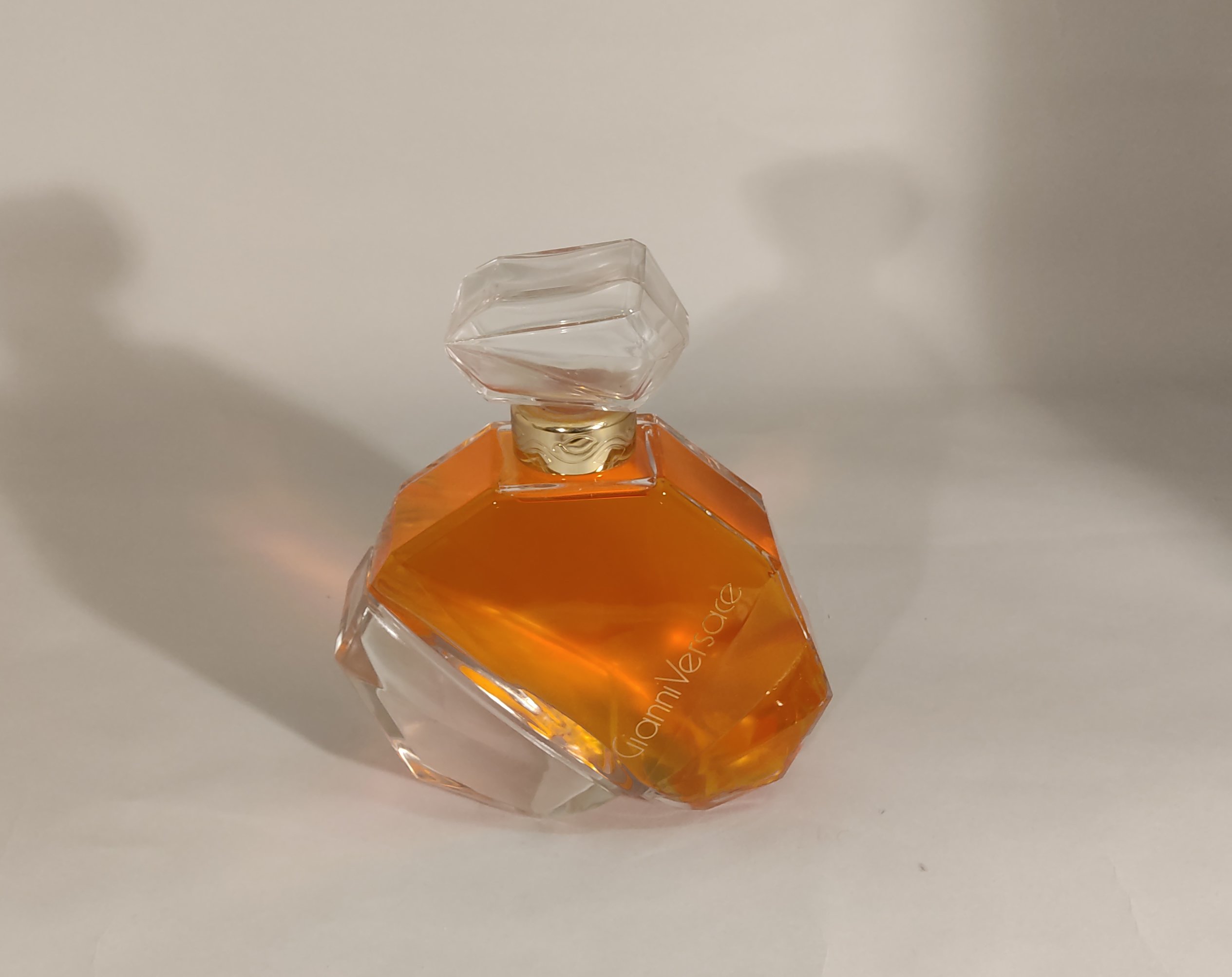 Flacon publicitaire décoratif en verre incolore pressé moulé.