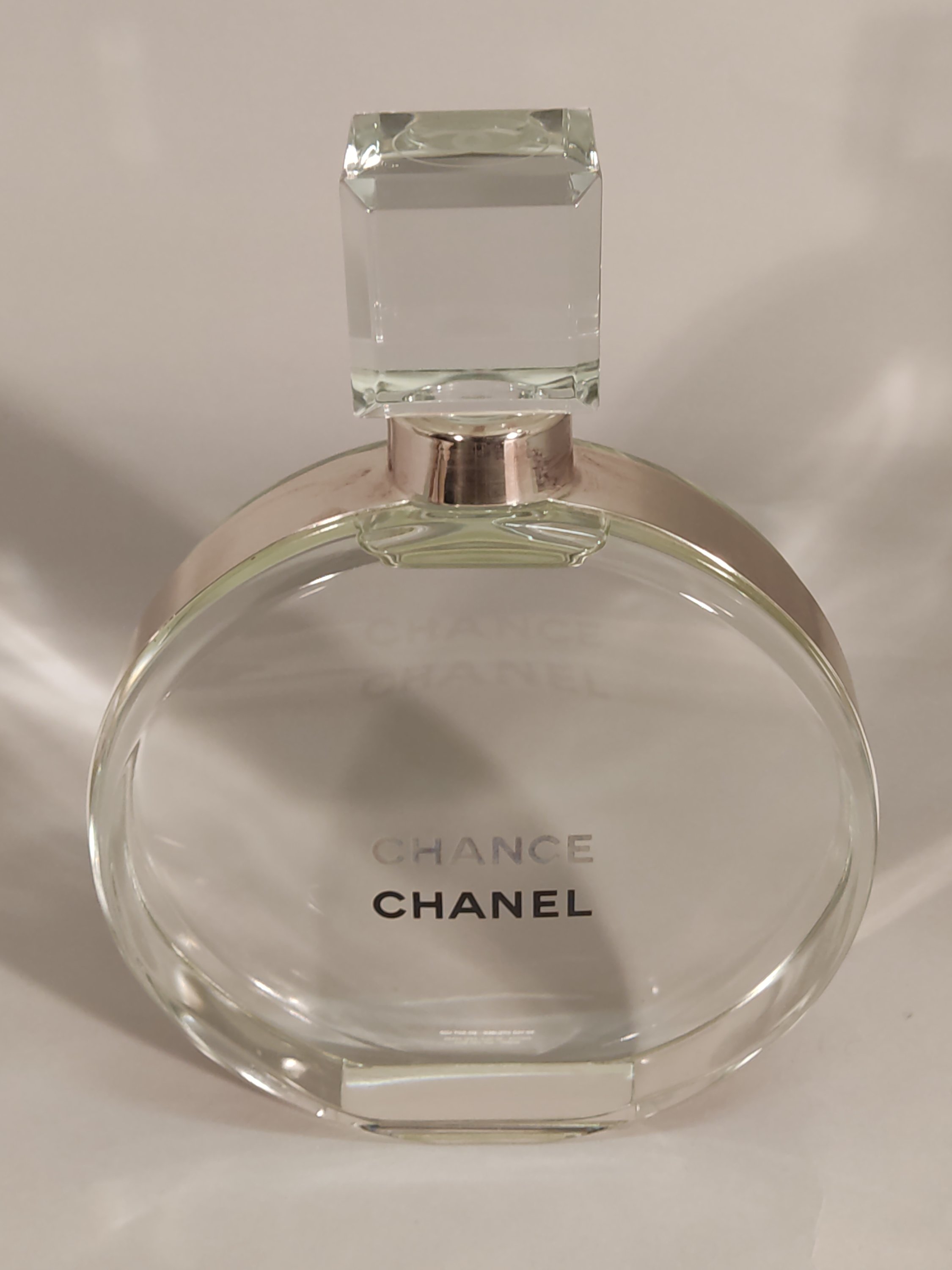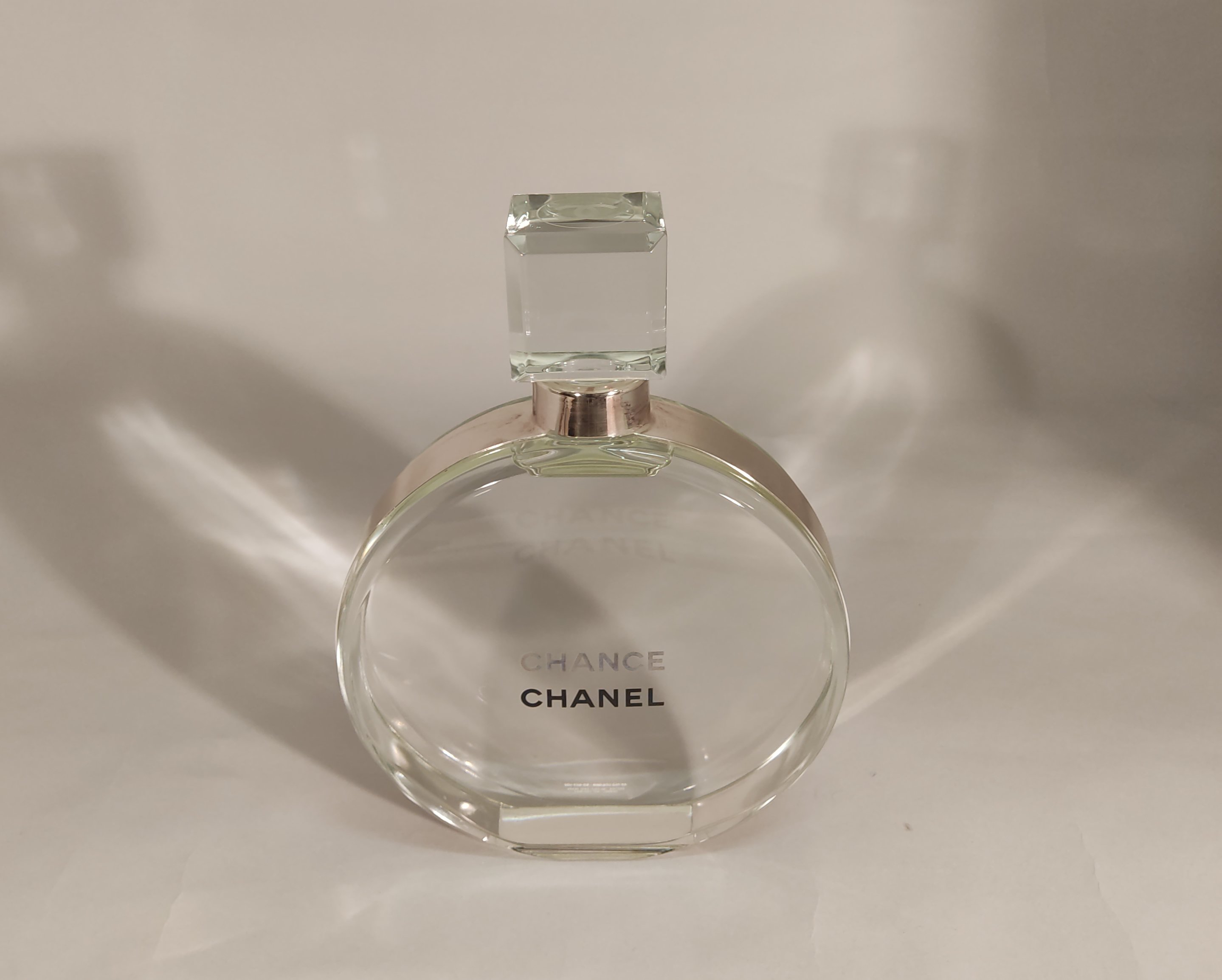 Flacon publicitaire décoratif en verre incolore pressé moulé.