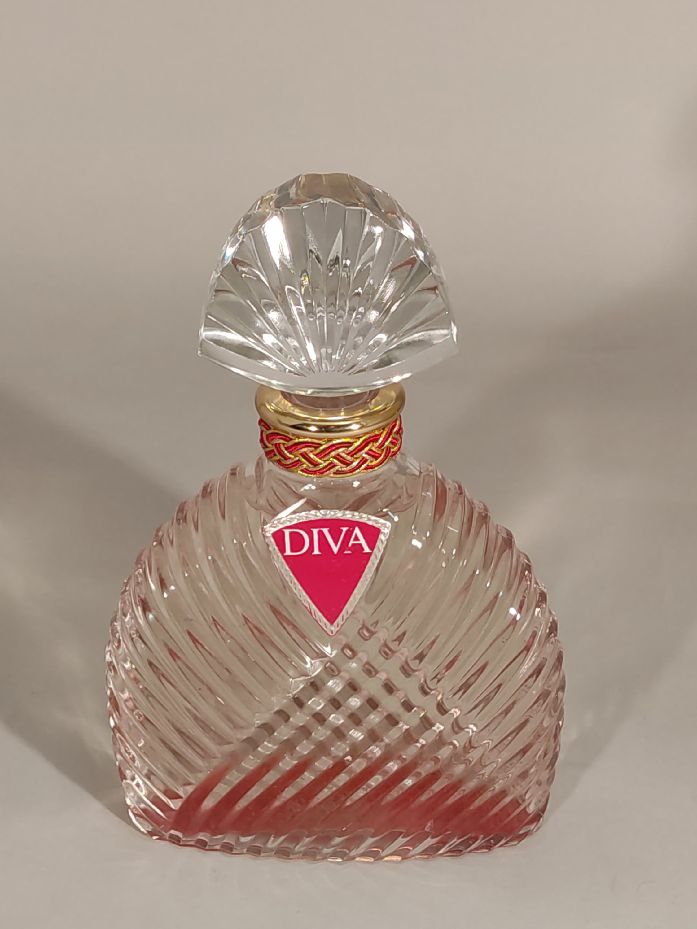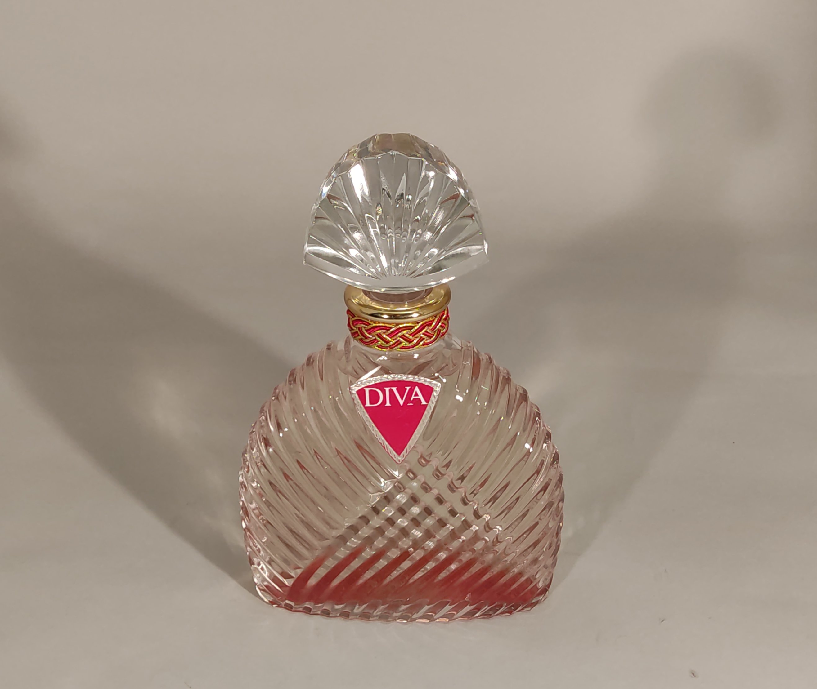 Flacon publicitaire décoratif en verre incolore pressé moulé, à décor moulé de draperies, coiffé de son bouchon rayonnant assorti, avec son étiquette.