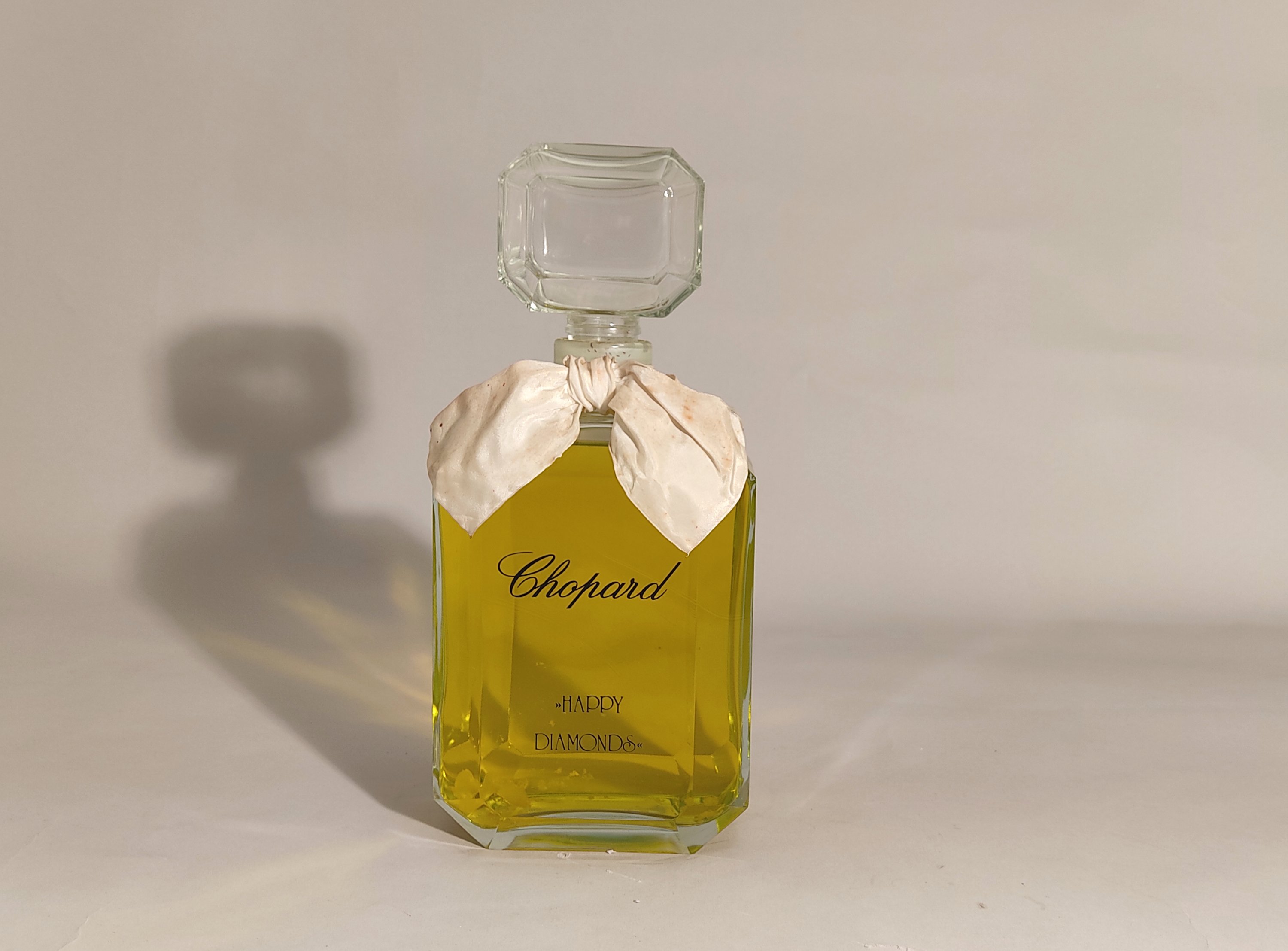 Flacon publicitaire décoratif en verre incolore pressé moulé, avec son bouchon facetté et son ruban.