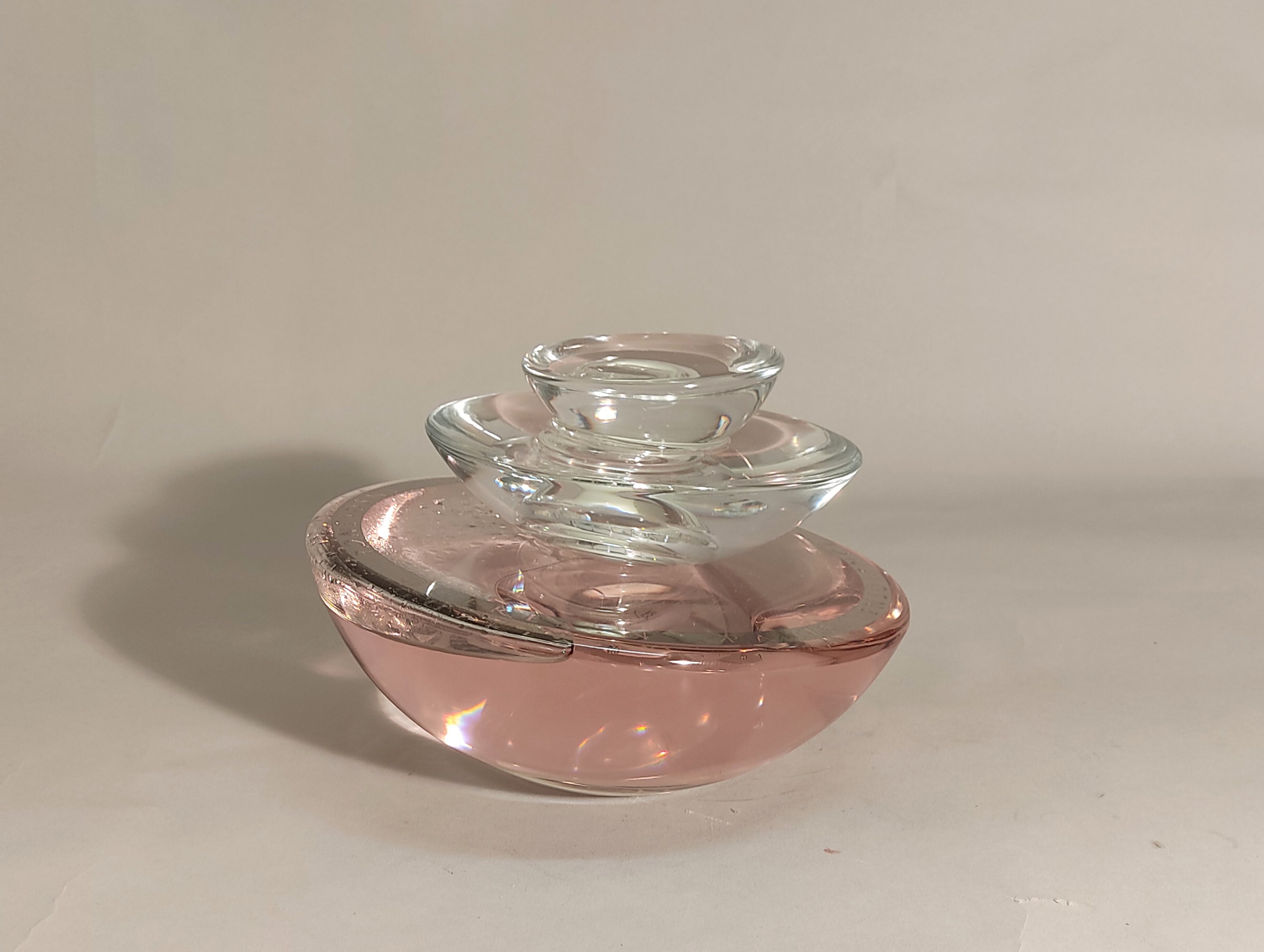 Flacon publicitaire décoratif en verre massif incolore pressé moulé dessiné par Serge Mansau (1930-2019).