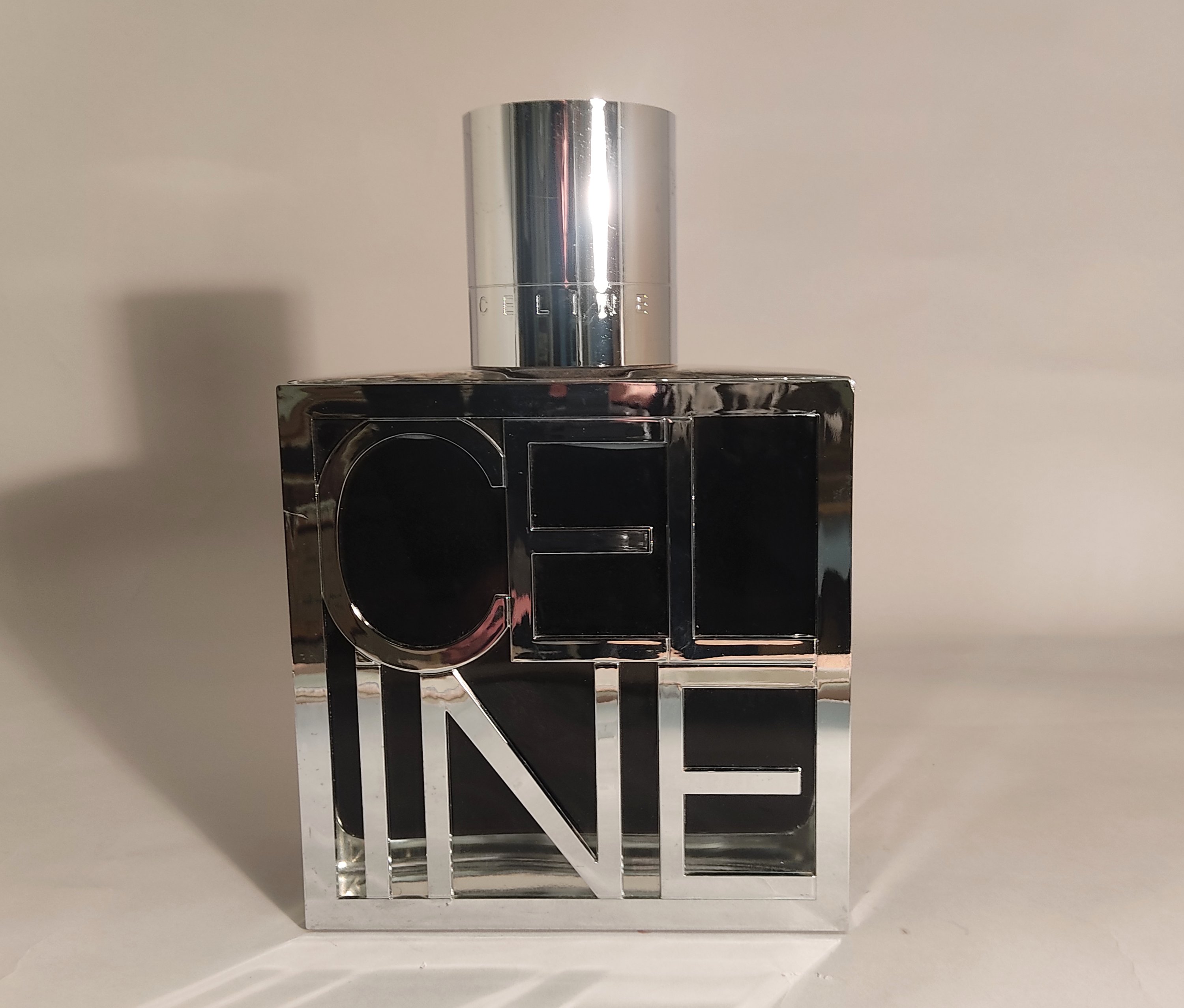 Flacon publicitaire décoratif en verre incolore pressé moulé habillé de Surlyn argent, dessiné par Federico Restrepo.