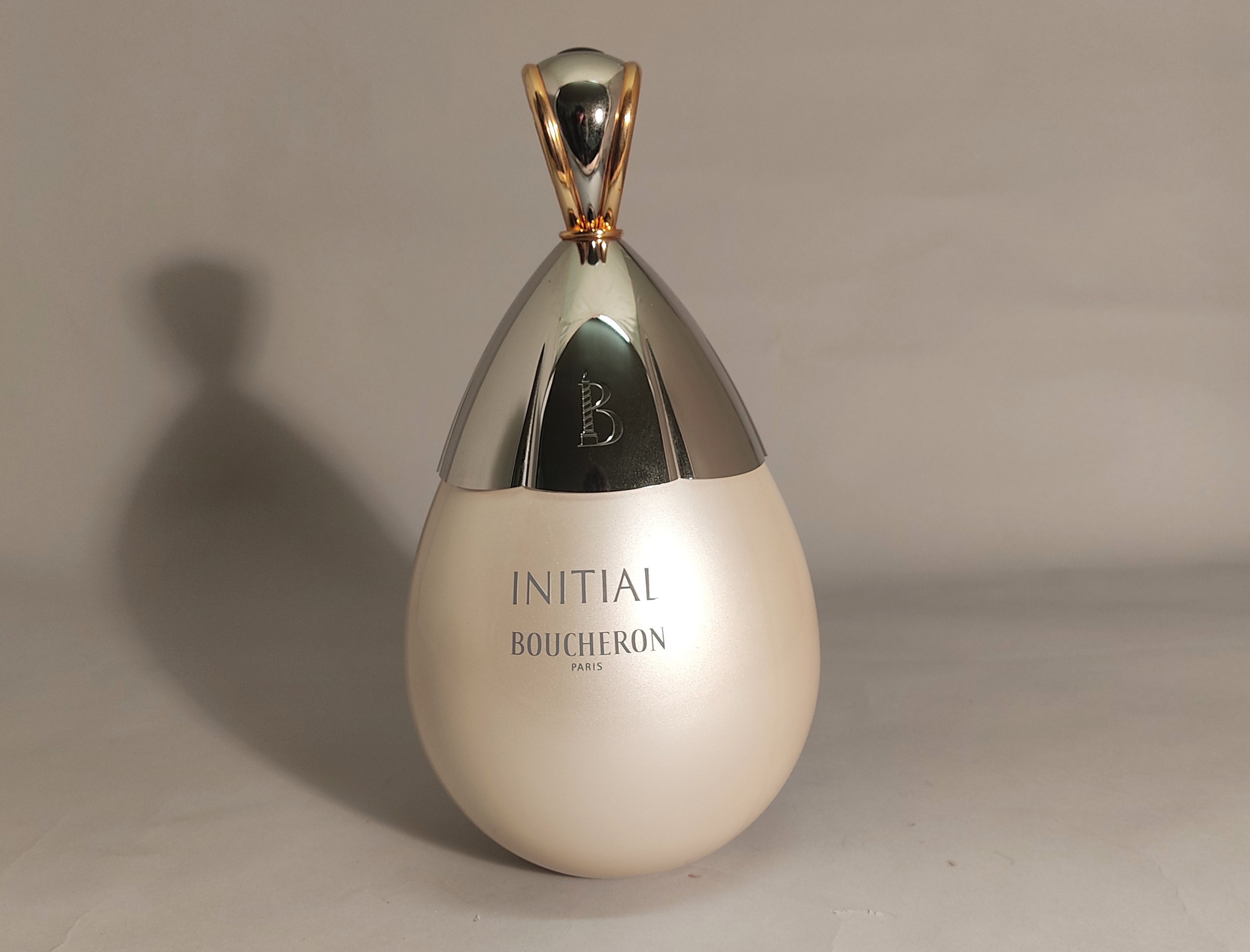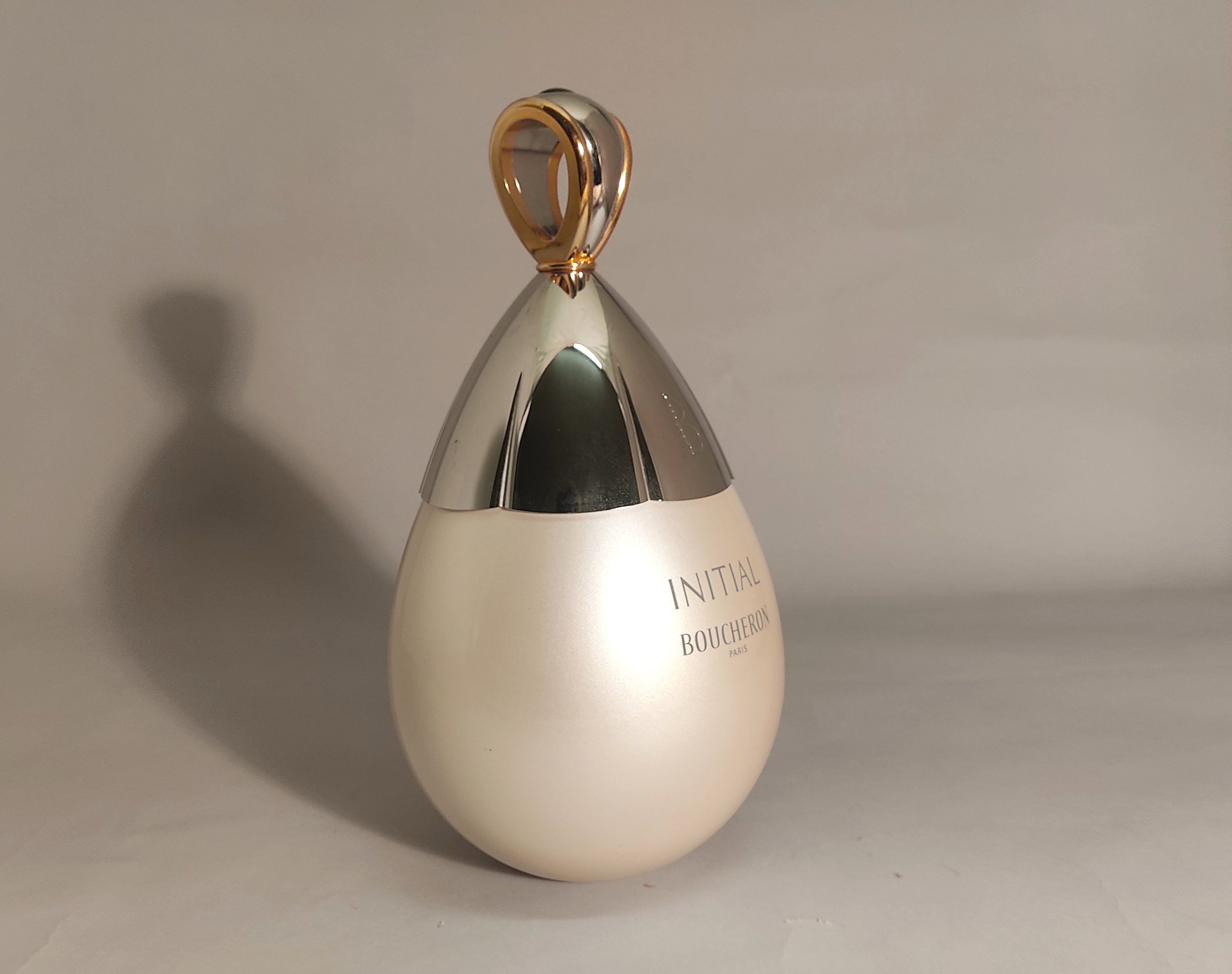 Flacon publicitaire décoratif en verre laqué blanc irisé figurant une perle en pampille imitant une boucle d'oreille.
