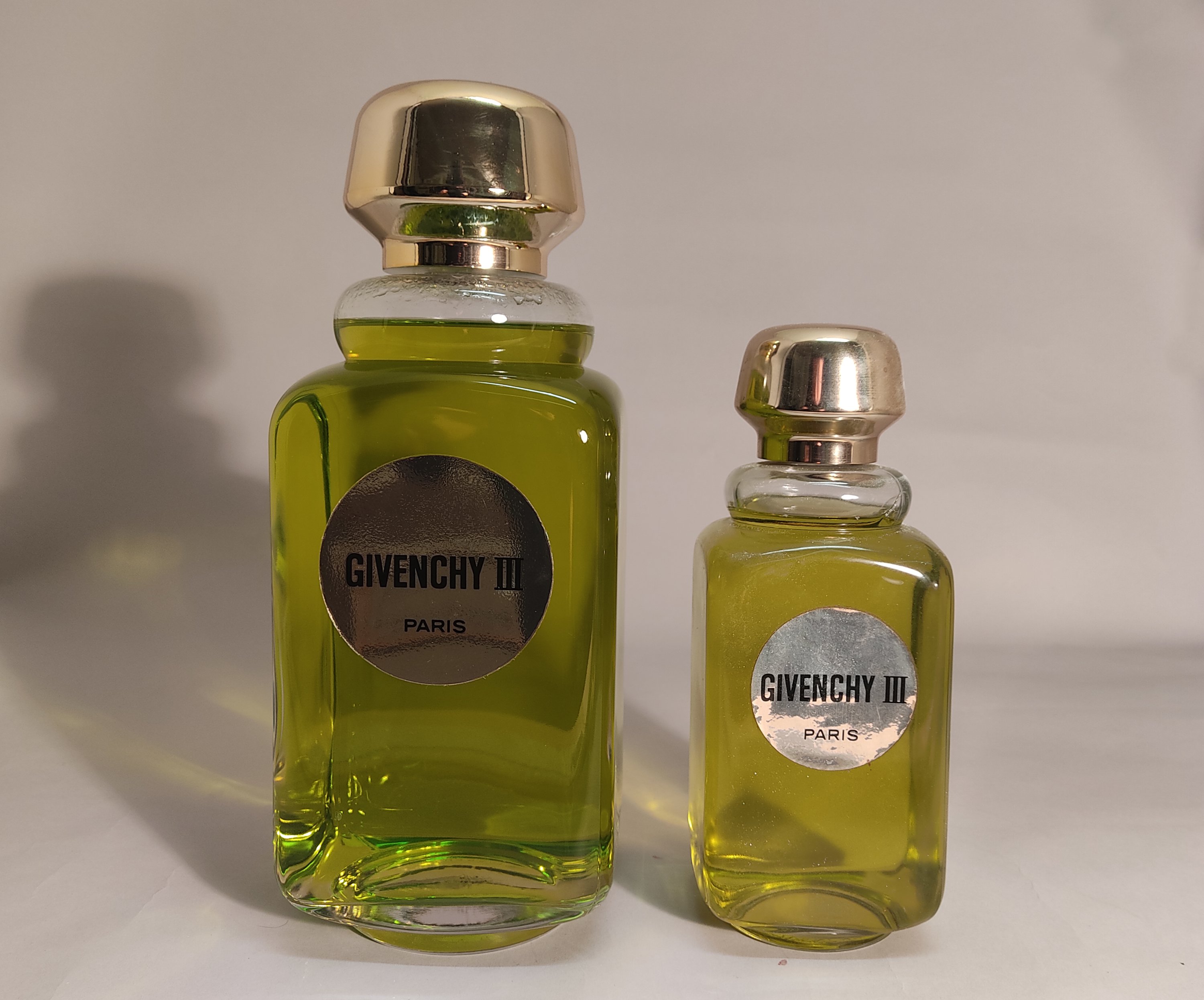 Deux flacons publicitaires décoratifs en verre incolore pressé moulé, avec capsule en résine dorée et leur étiquette assortie.