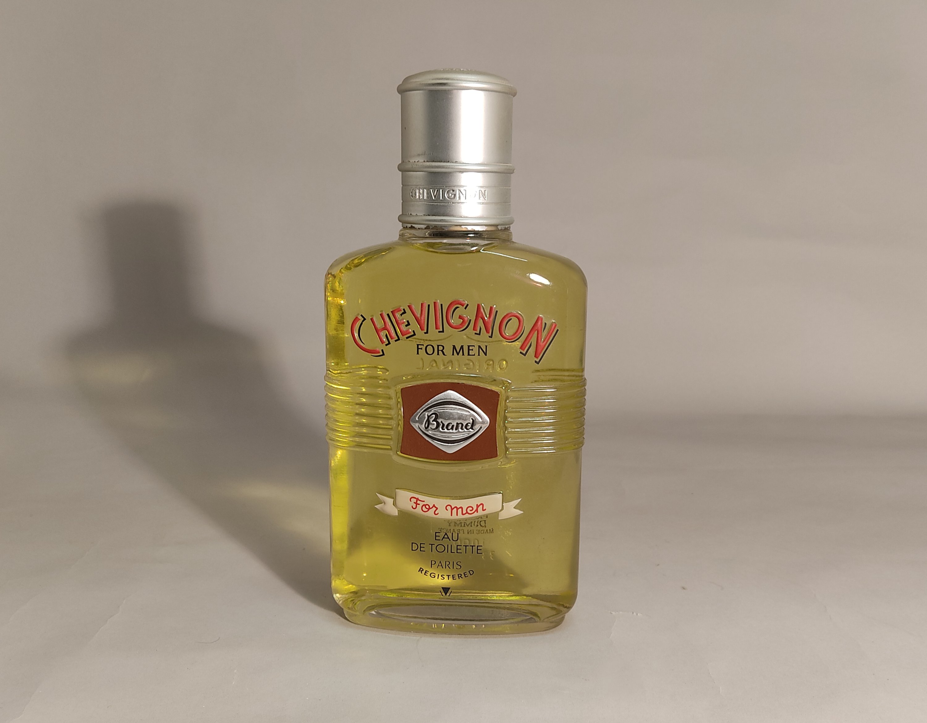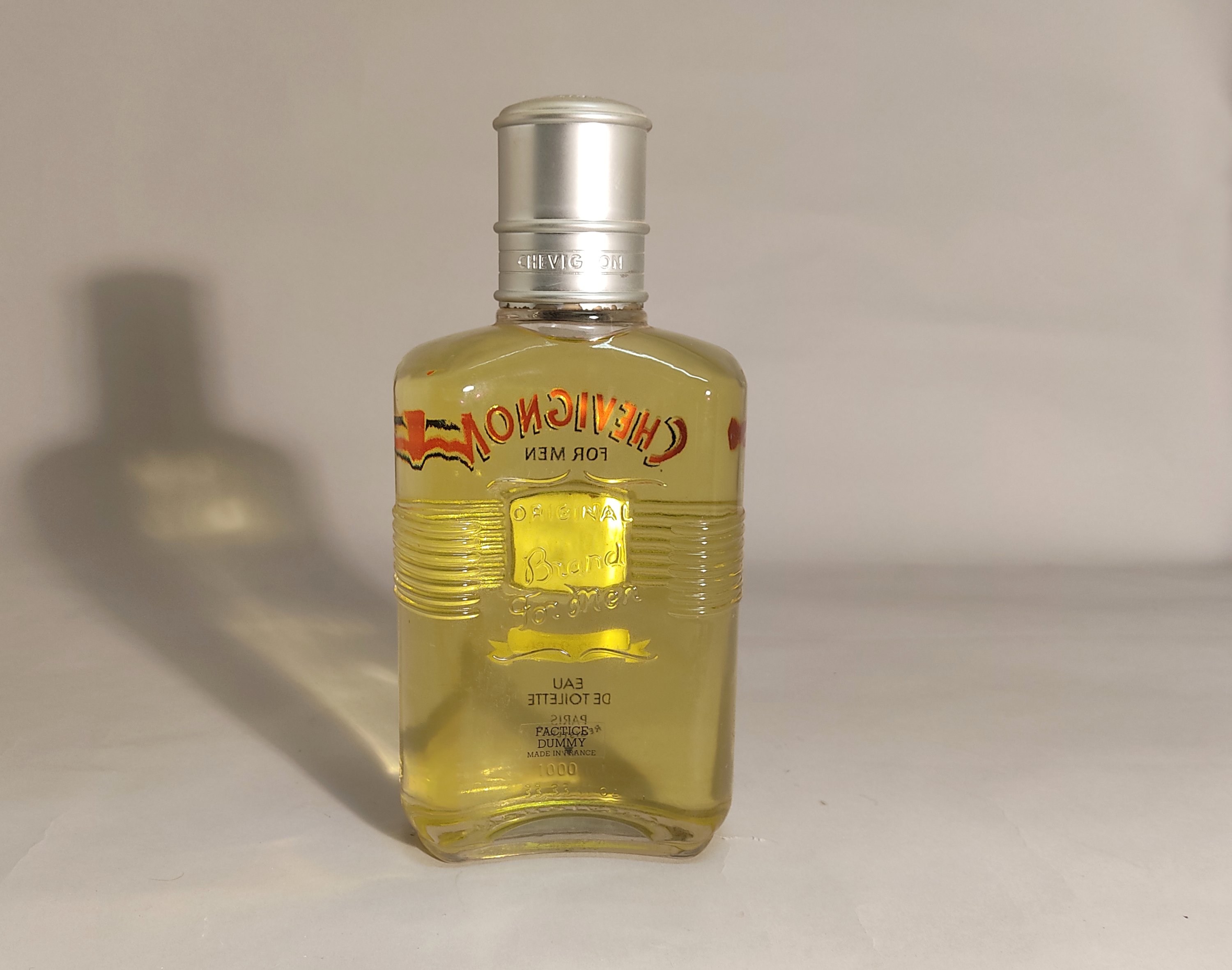 Flacon publicitaire décoratif en verre incolore pressé moulé, titré, avec capsule en métal.