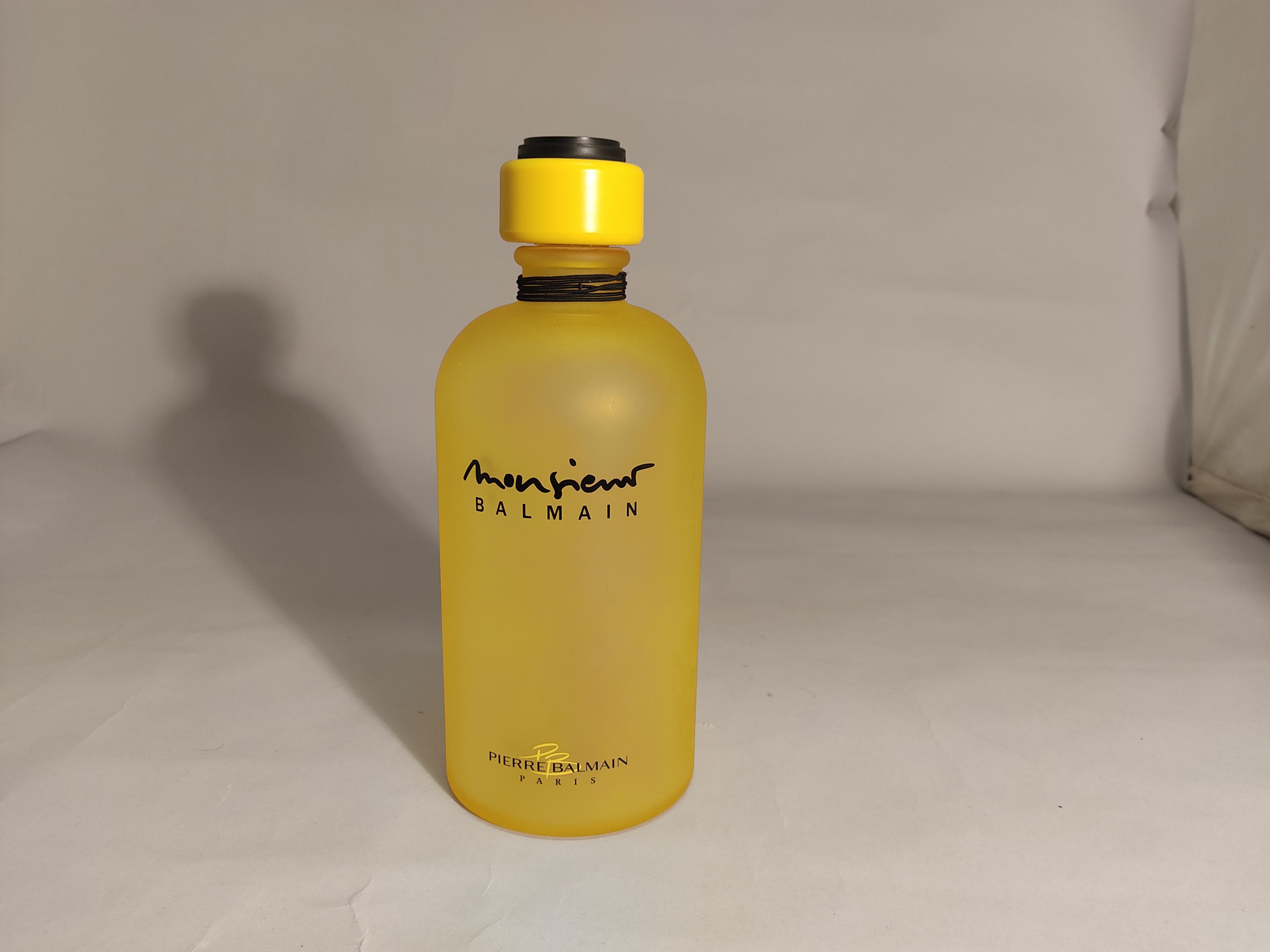 Flacon publicitaire décoratif en verre laqué jaune, titré, coiffé de sa capsule assortie.