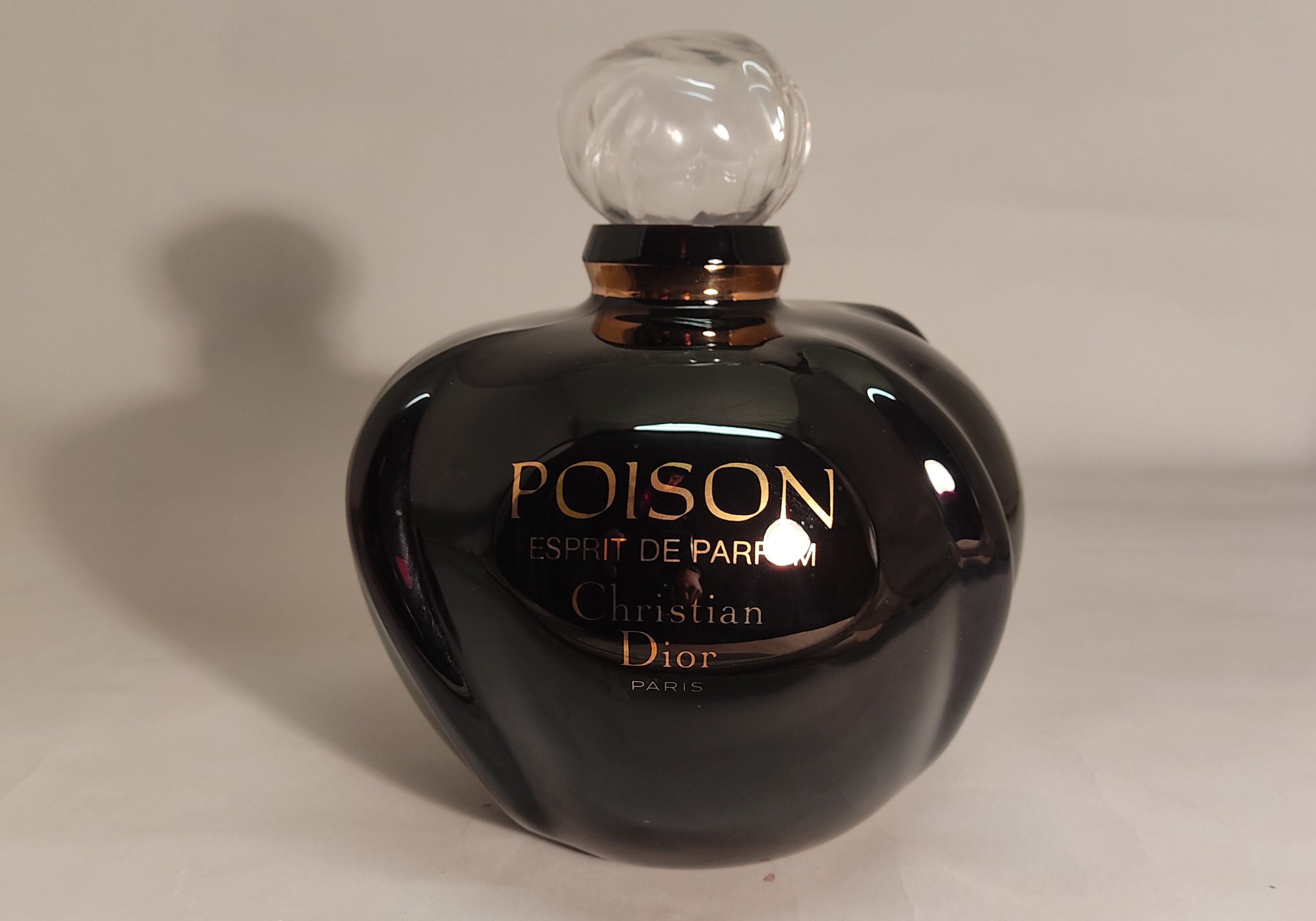 Flacon publicitaire décoratif en verre pressé moulé teinté améthyste, titré, figurant une pomme stylisée, dessiné par Véronique Monod.