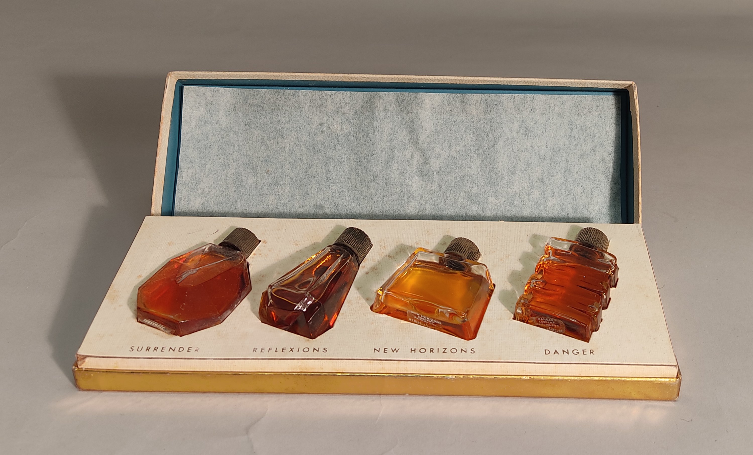 Coffret en carton gainé de papier titré contenant quatre diminutifs parfums : "Danger", "New Horizons", "Reflexions" et " Surrender".