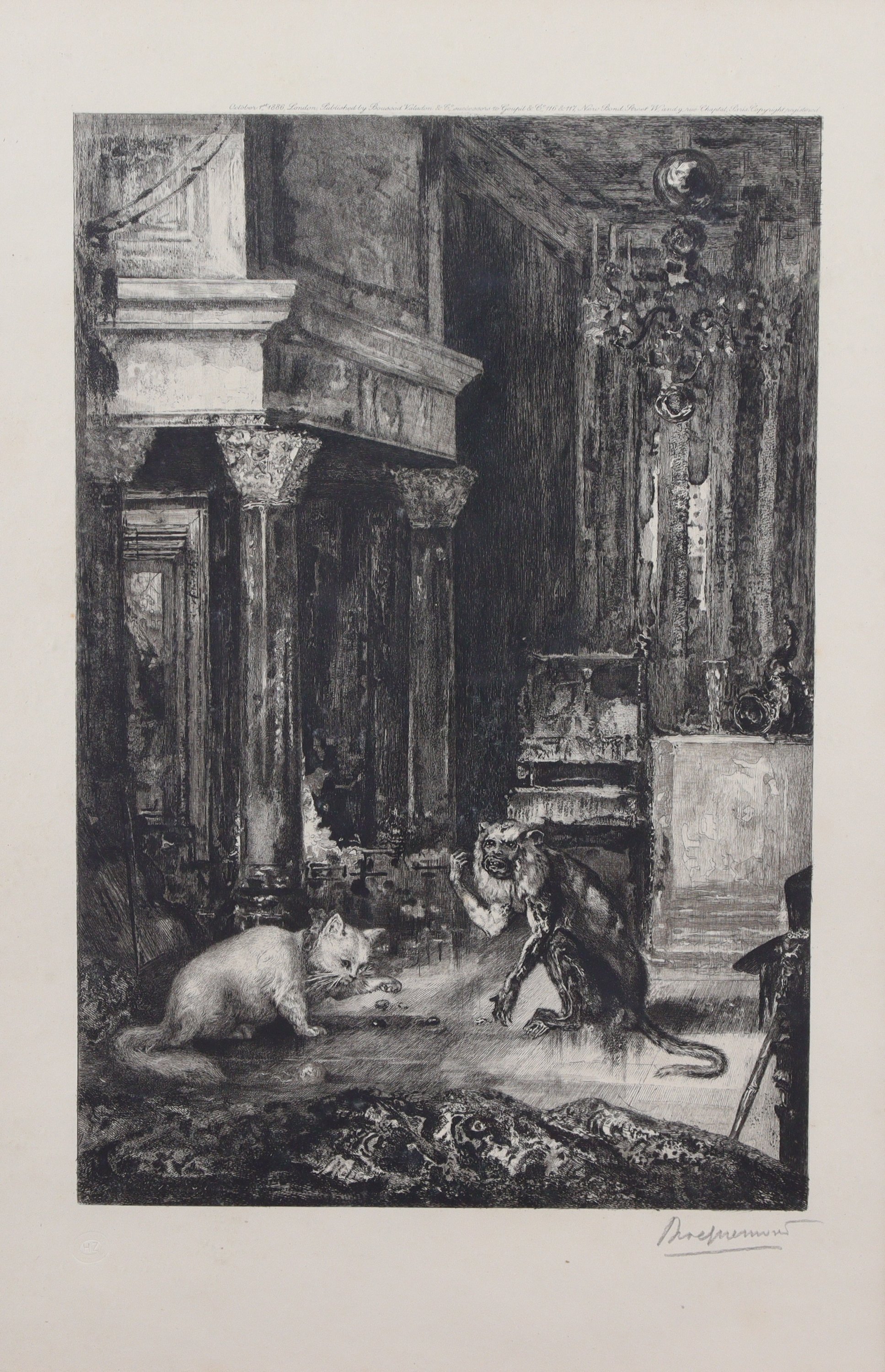 Lorsqu'Antoni Roux (1833-1914) commande une suite des fables de la Fontaine au peintre symboliste Gustave Moreau, il n'imagine pas le succès que cette entreprise rencontrera. Une première suite de 25 feuilles est réalisée pour l'exposition de 1881. En 1885-1886, le mécène commande au graveur Félix Bracquemond d'interpréter certains de ses chefs d'oeuvres qui seront exposés dans la galerie Goupil à Paris, puis au Salon de 1887.