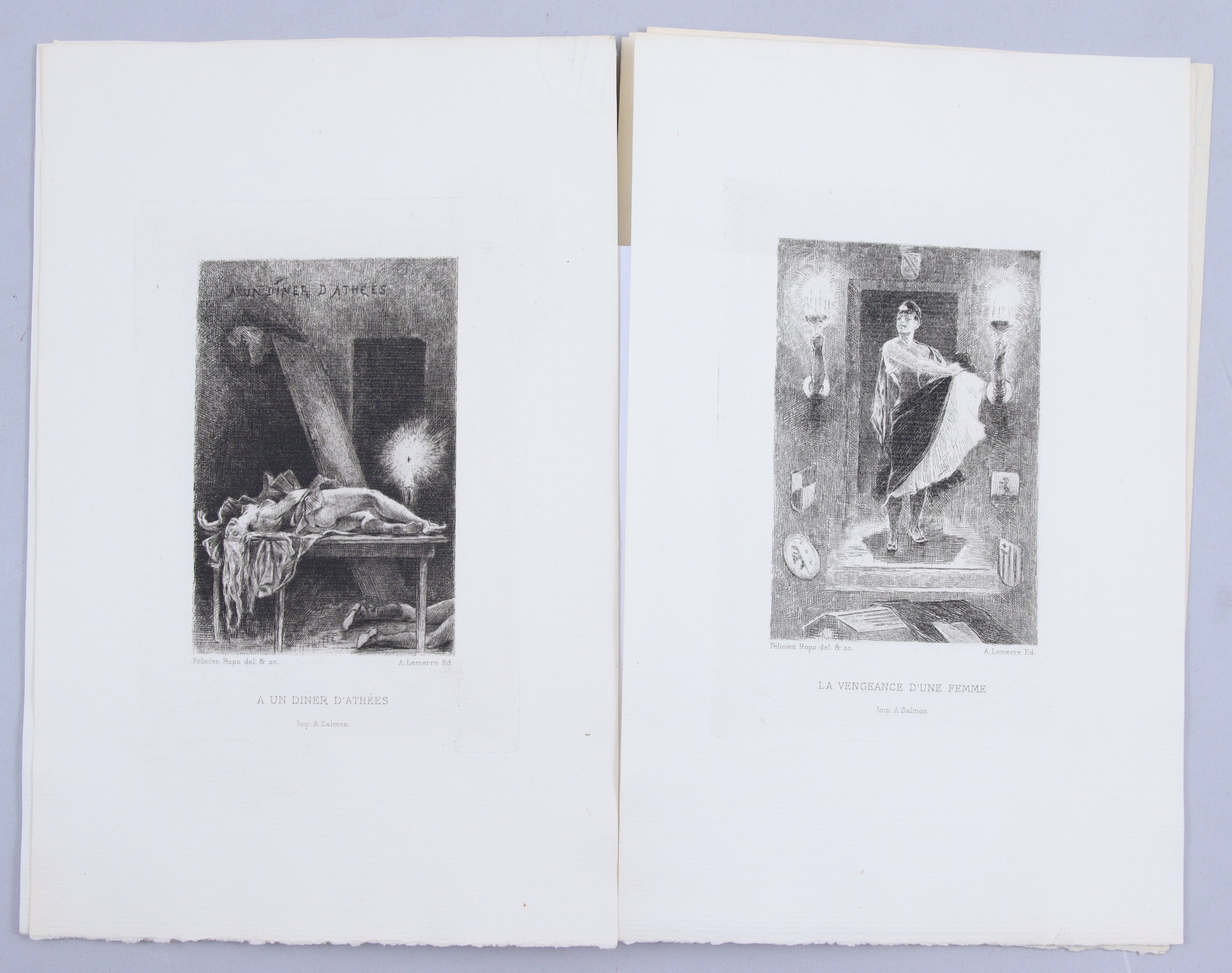"Alphonse Lemerre commanda Félicien Rops de réaliser des illustrations pour accompagner une réédition des Diaboliques. Ces illustrations ne firent pas l'objet d'une collaboration entre Barbey et Rops. Ce n'est qu'en 1886, lors de la deuxième vague de la réédition que les illustrations de Rops accompagneront le livre, toutefois sans en faire partie intégrante, pour qui voudra bien les acheter."