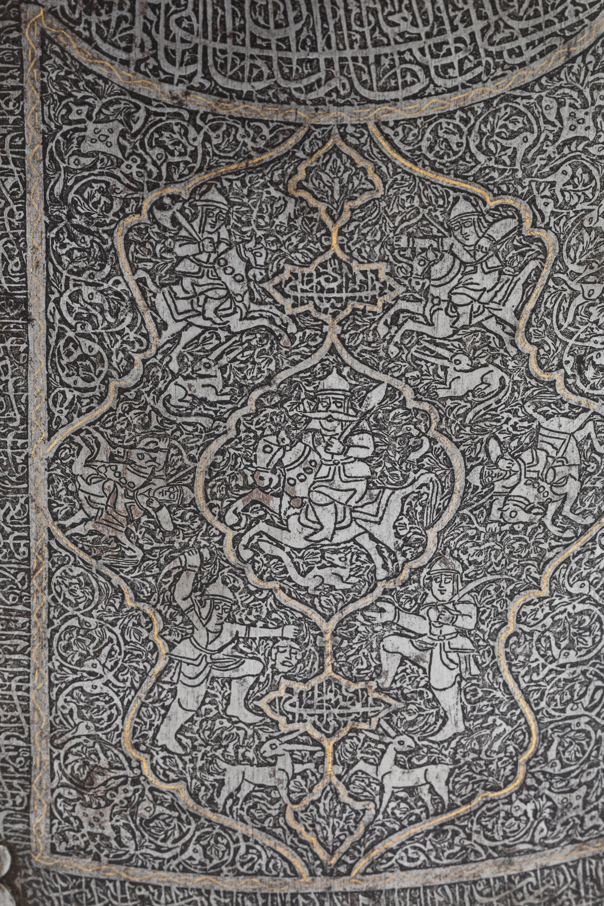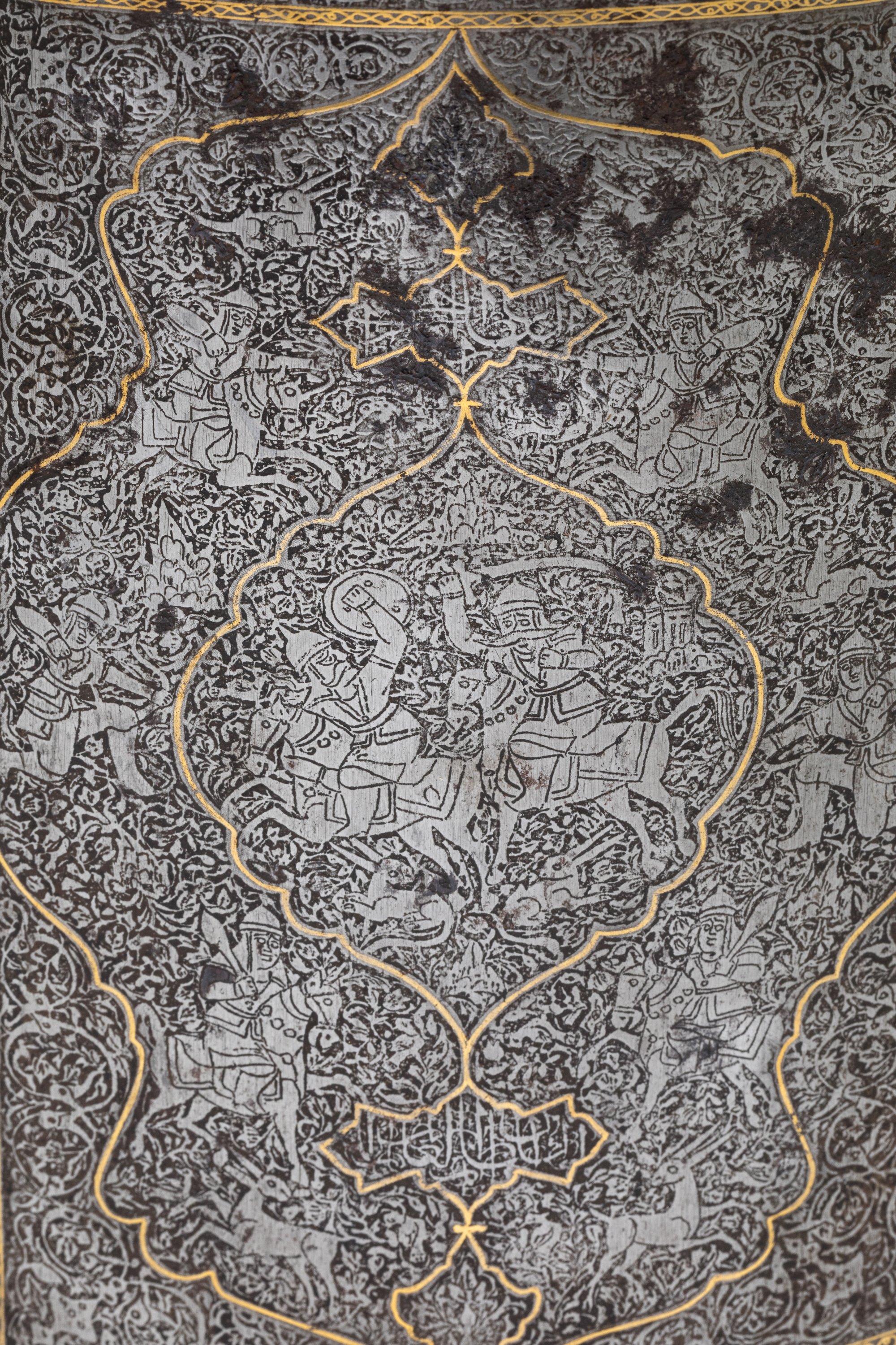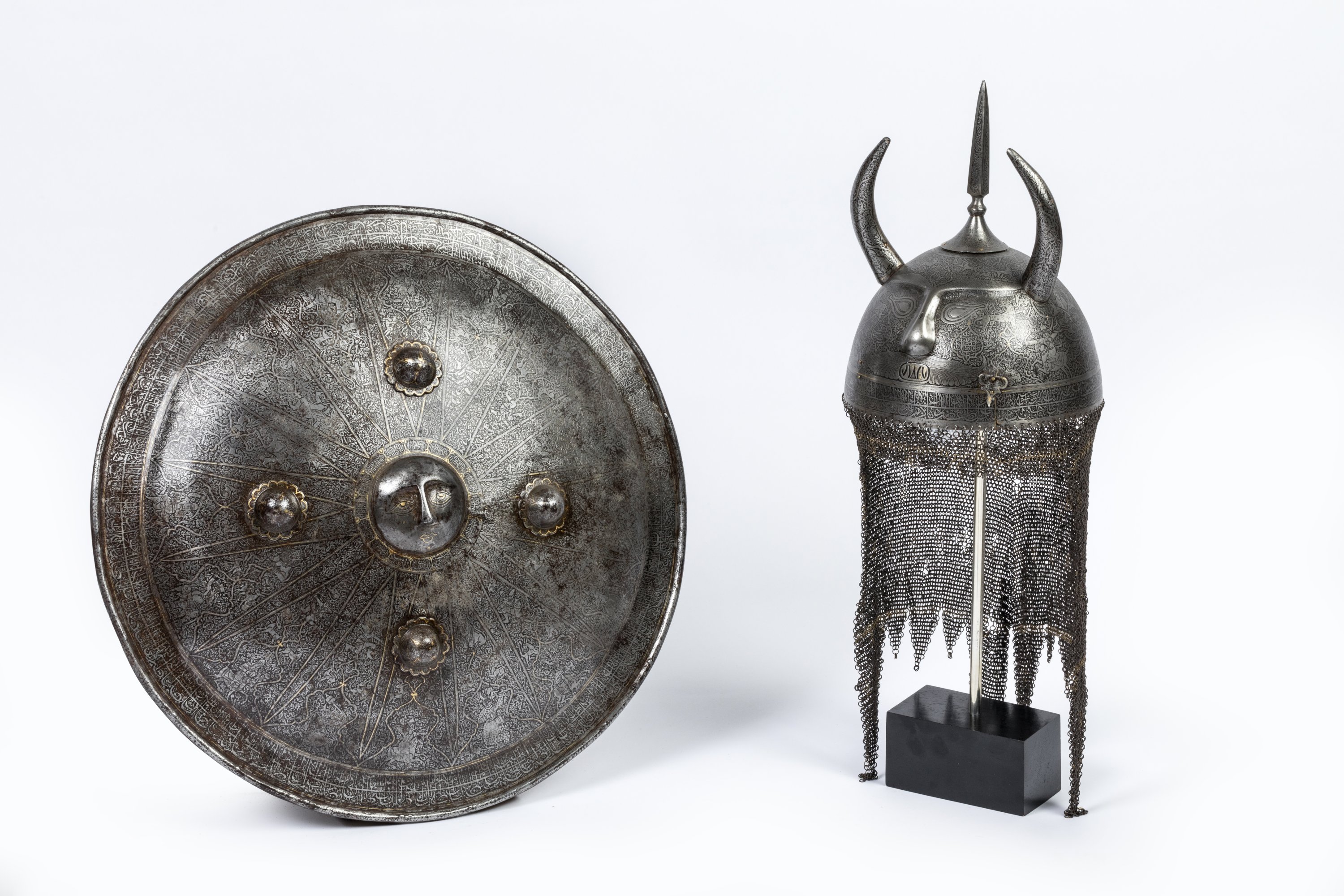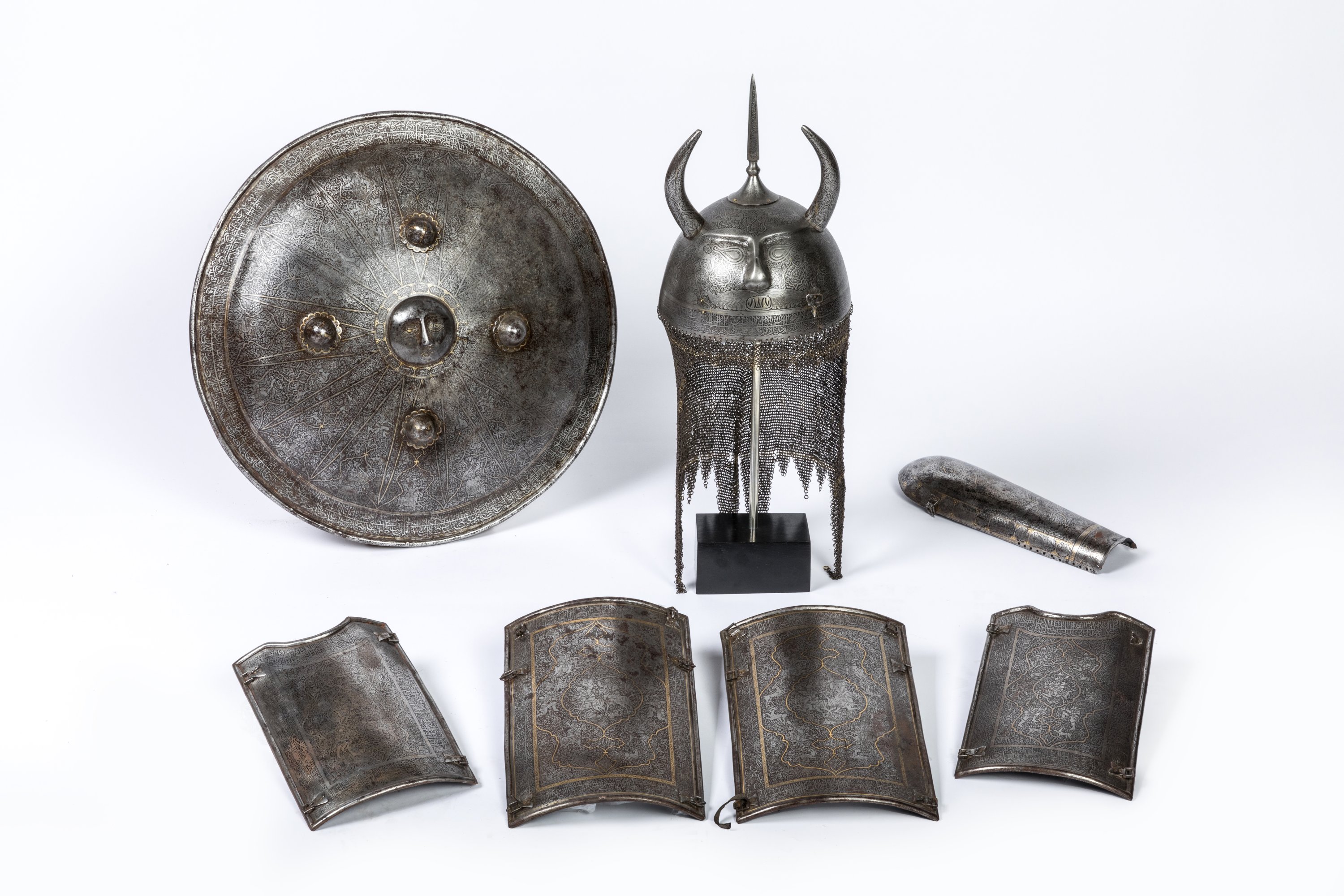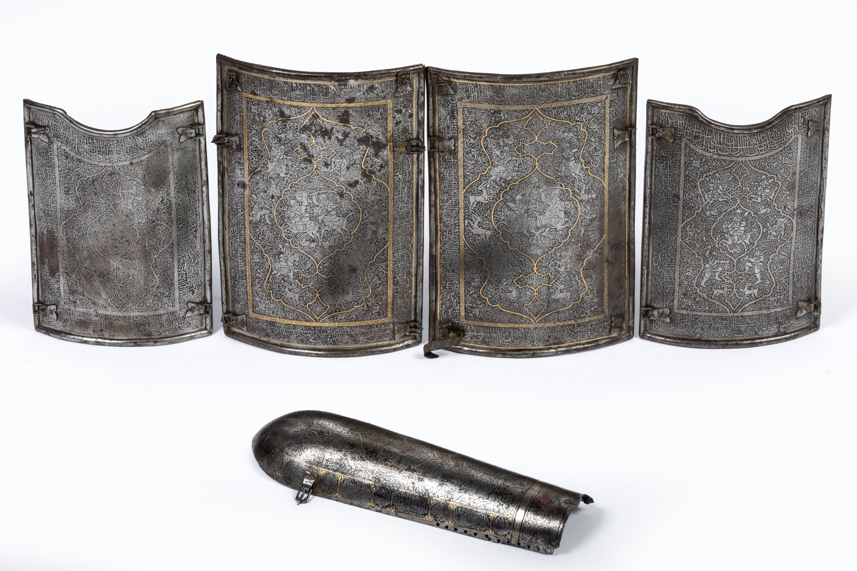 Iranian (Qajar), 19th century. A rare suit of armour comprised of a spiked helmet, a roundel, an armour, and an armlet made of steel inlaid with silver and gold threads and engraved with medallions depicting Shahnameh's fights. Calligraphy on the borders; enhanced with gilding.