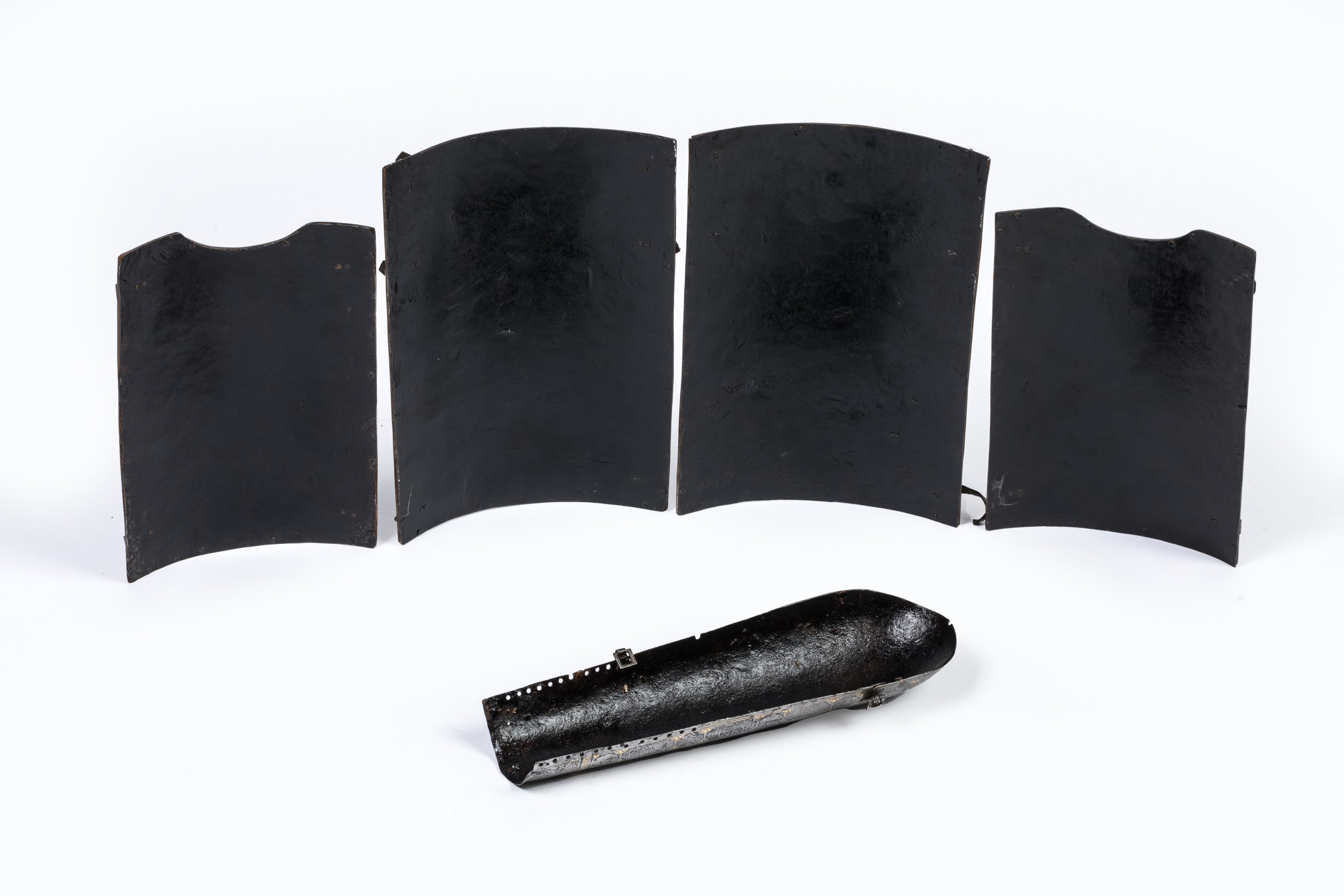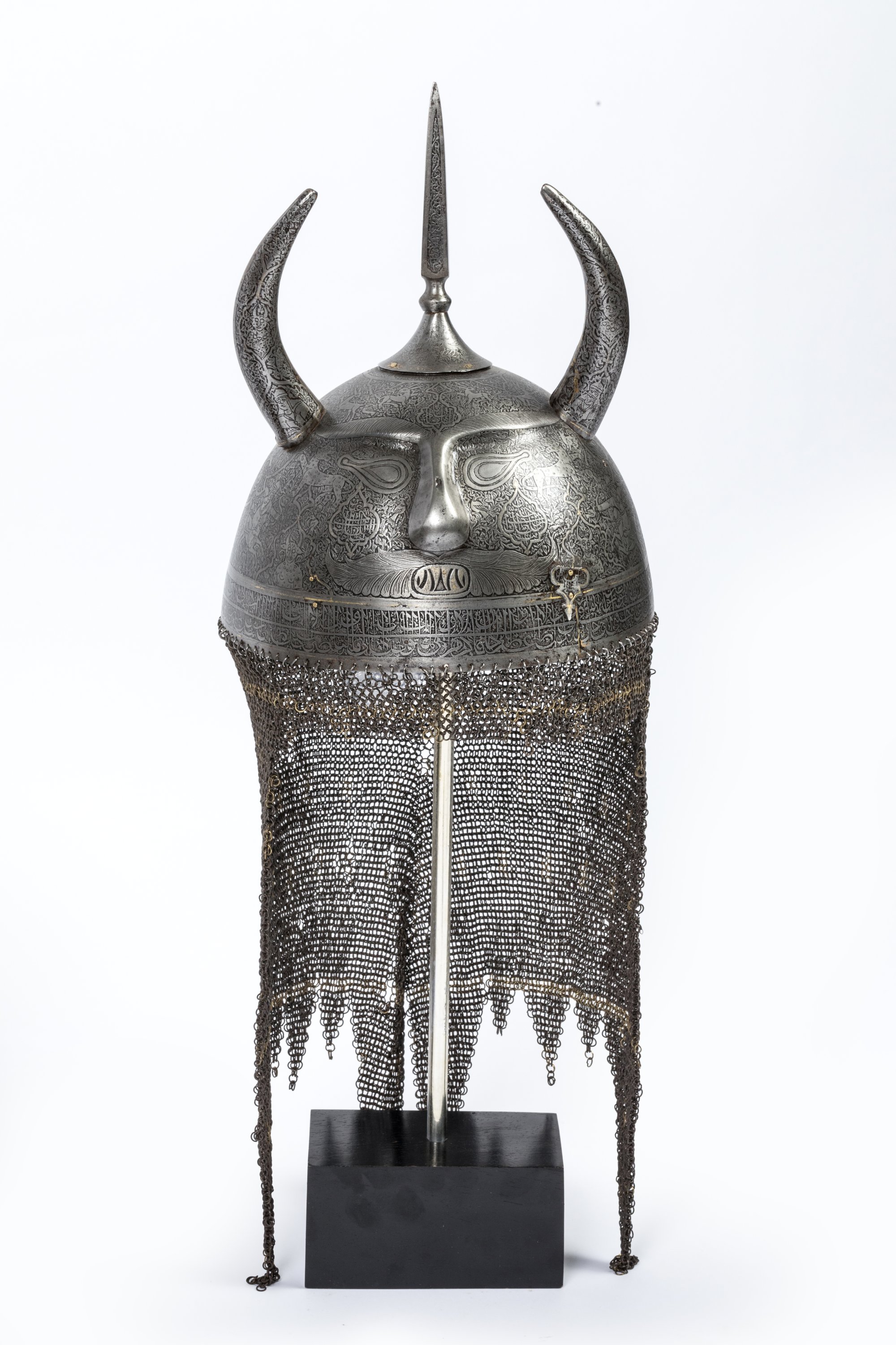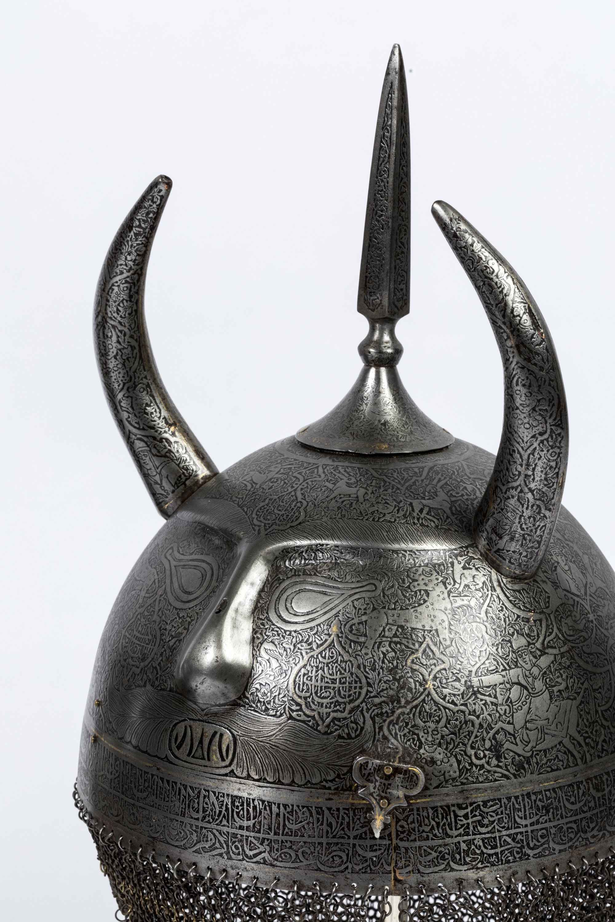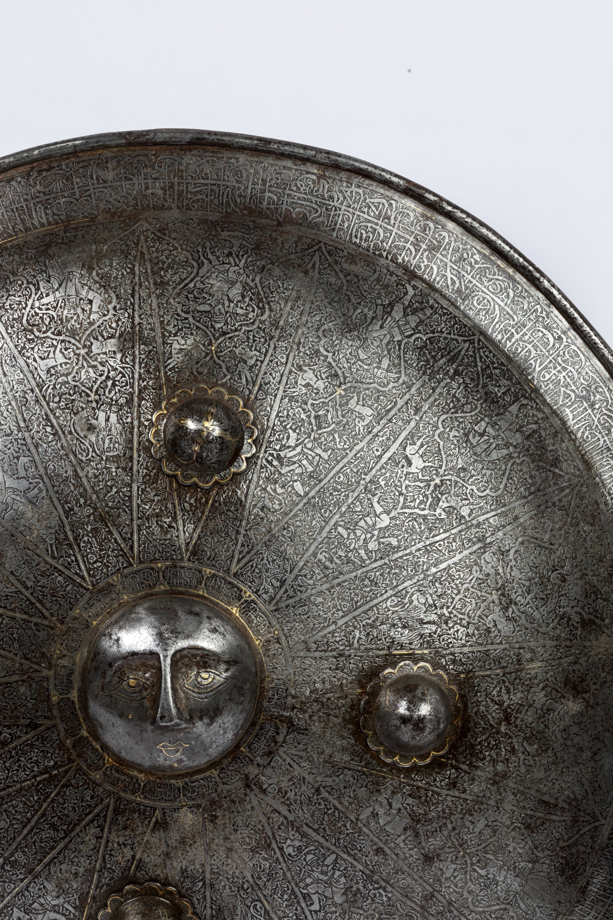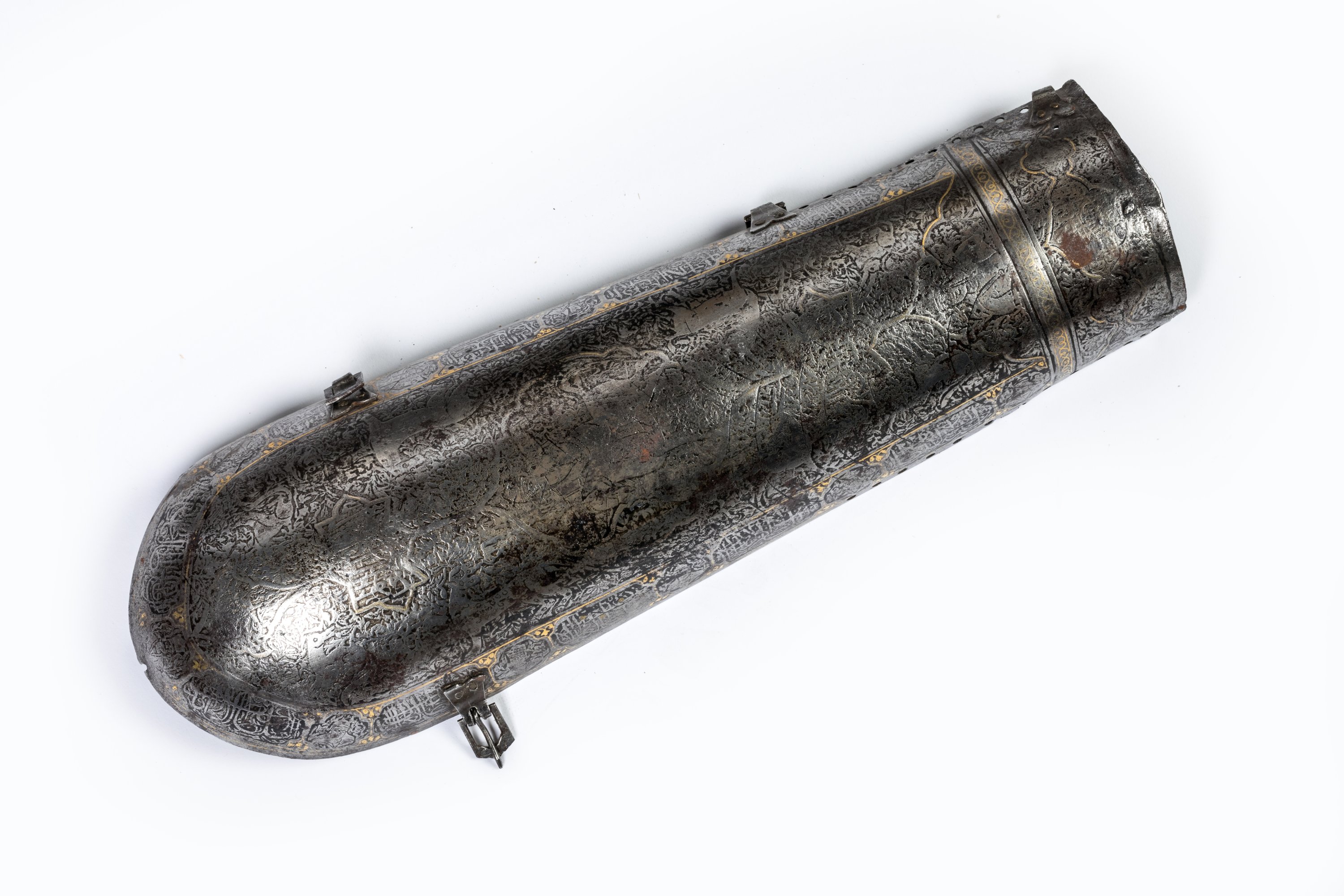 Iranian (Qajar), 19th century. A rare suit of armour comprised of a spiked helmet, a roundel, an armour, and an armlet made of steel inlaid with silver and gold threads and engraved with medallions depicting Shahnameh's fights. Calligraphy on the borders; enhanced with gilding.