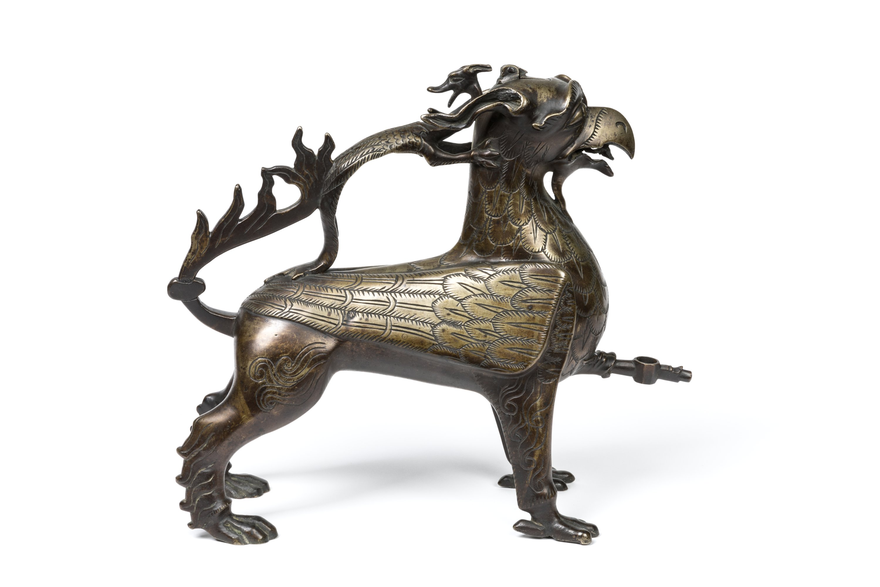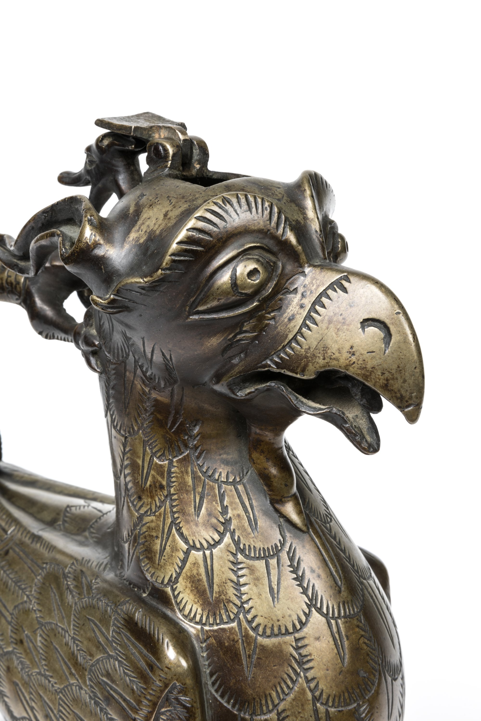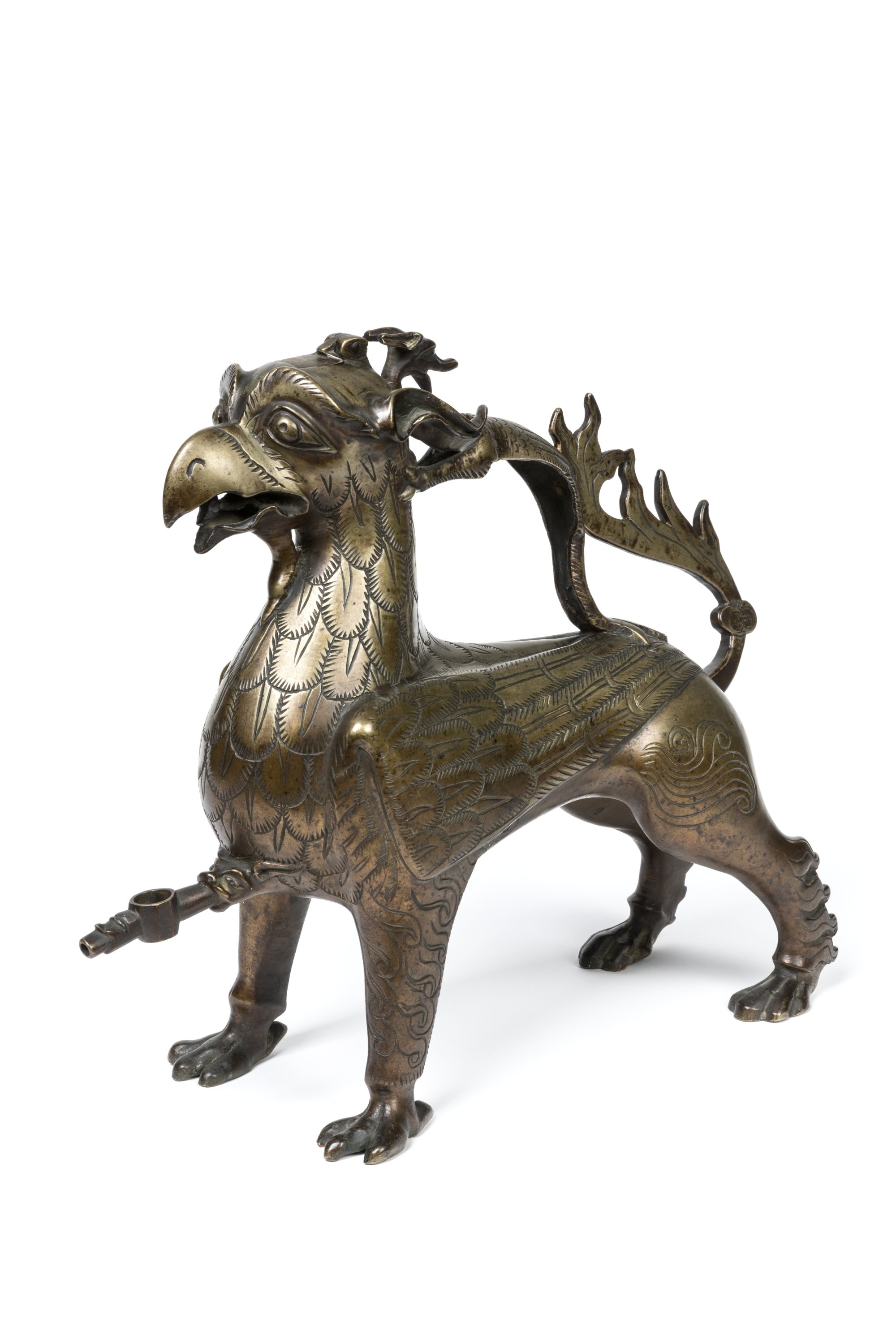 Nuremberg style, 15th century. A bronze aquamanile decorated with a griffin. Marked H on the dragon-shaped handle.