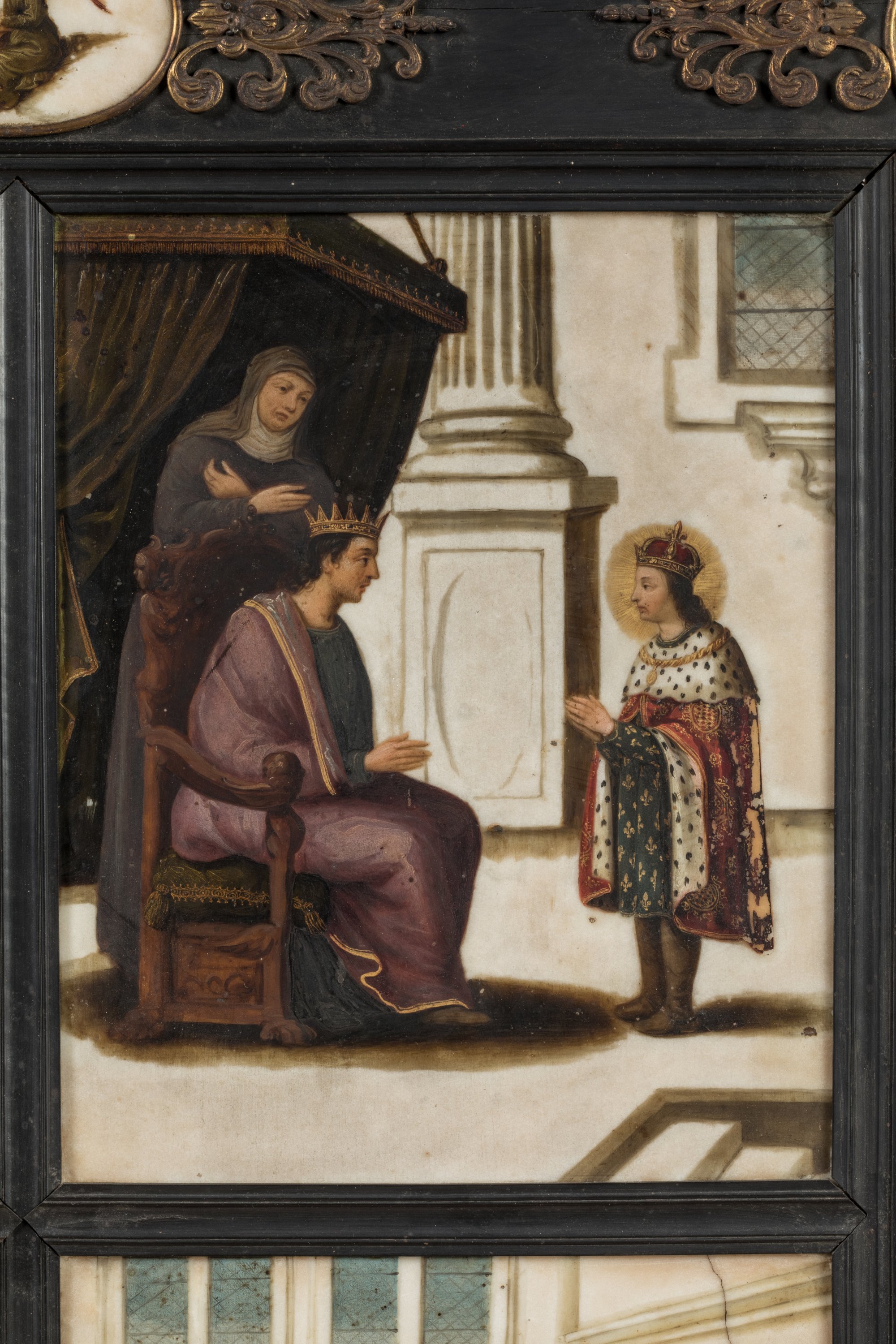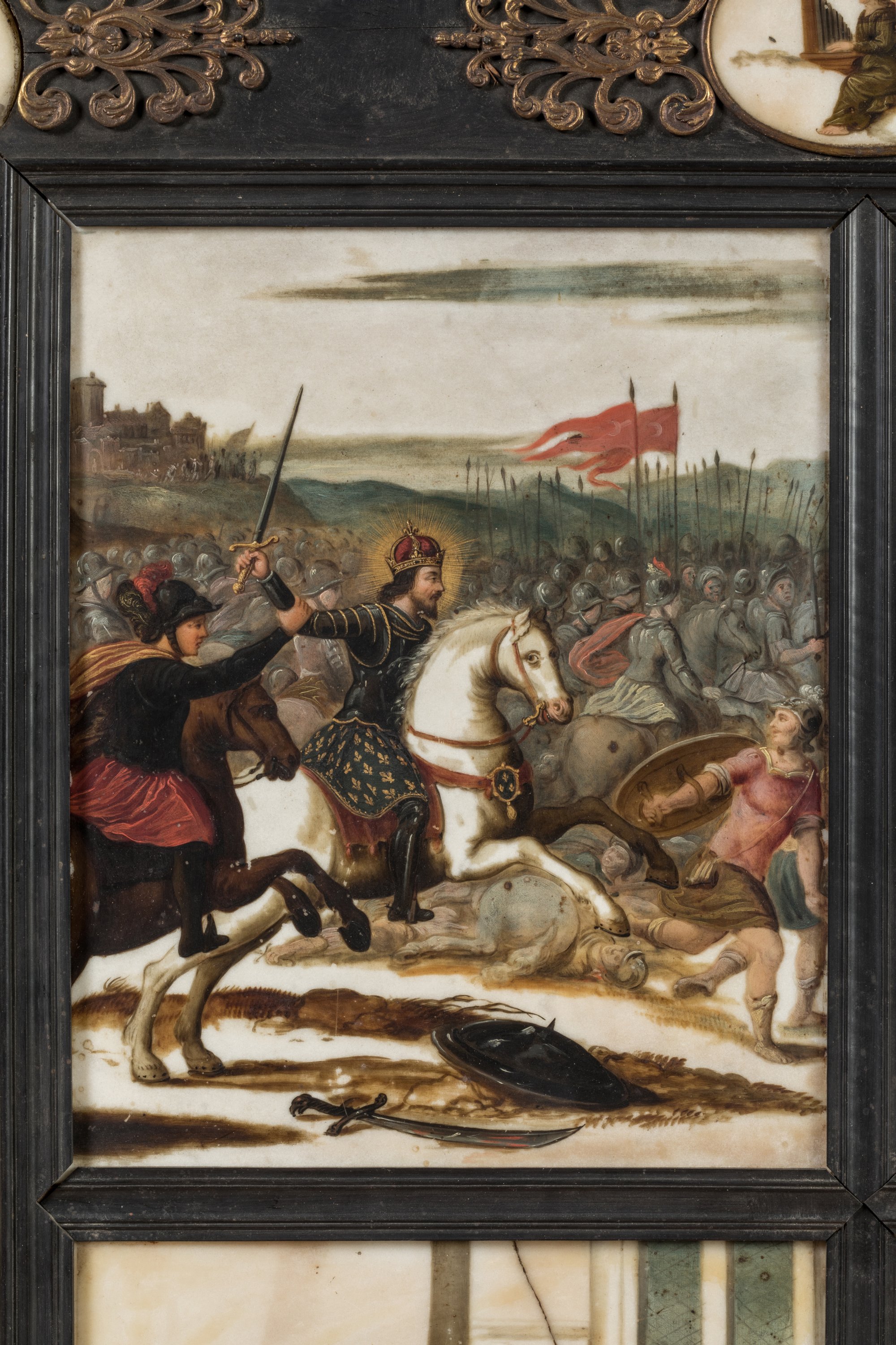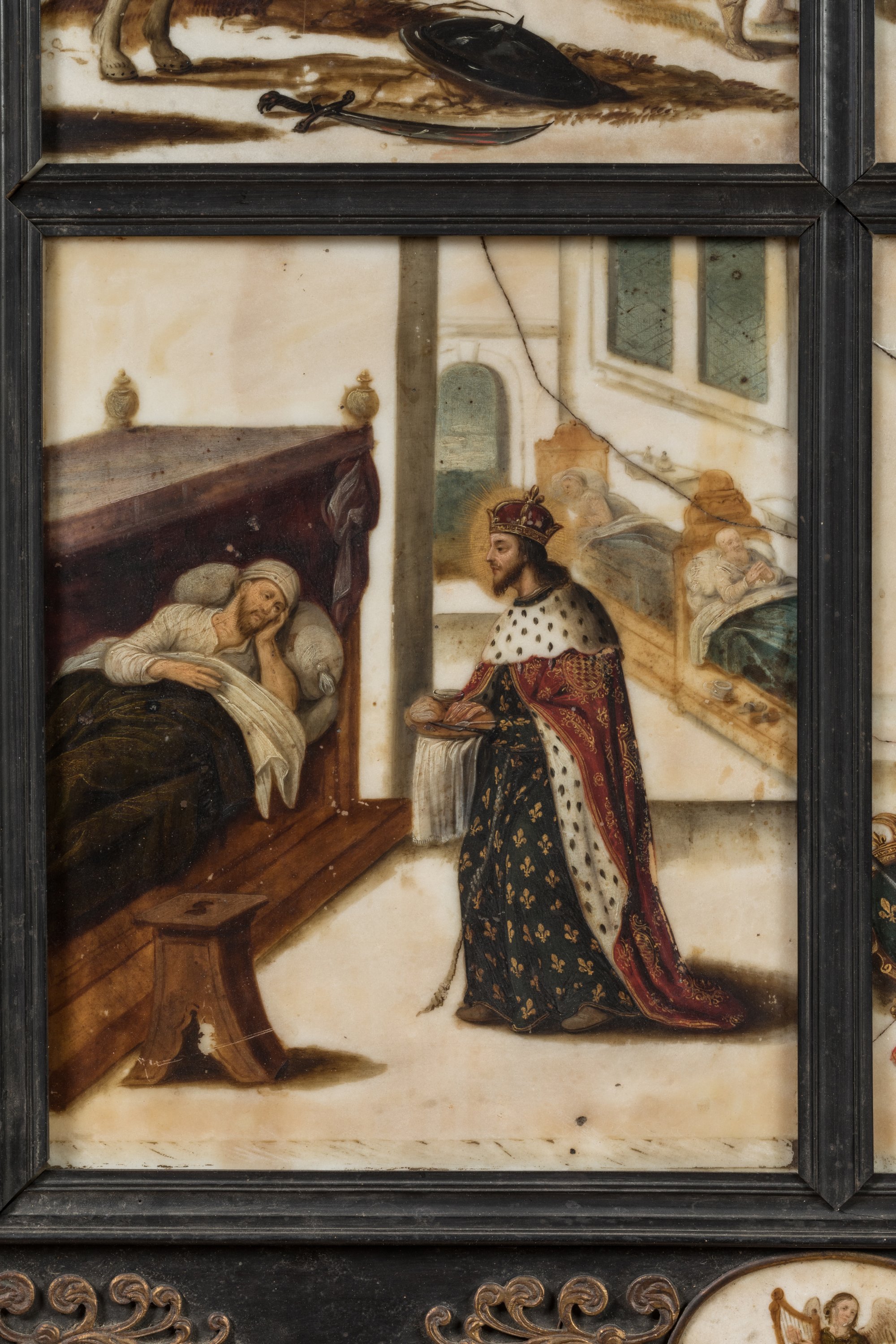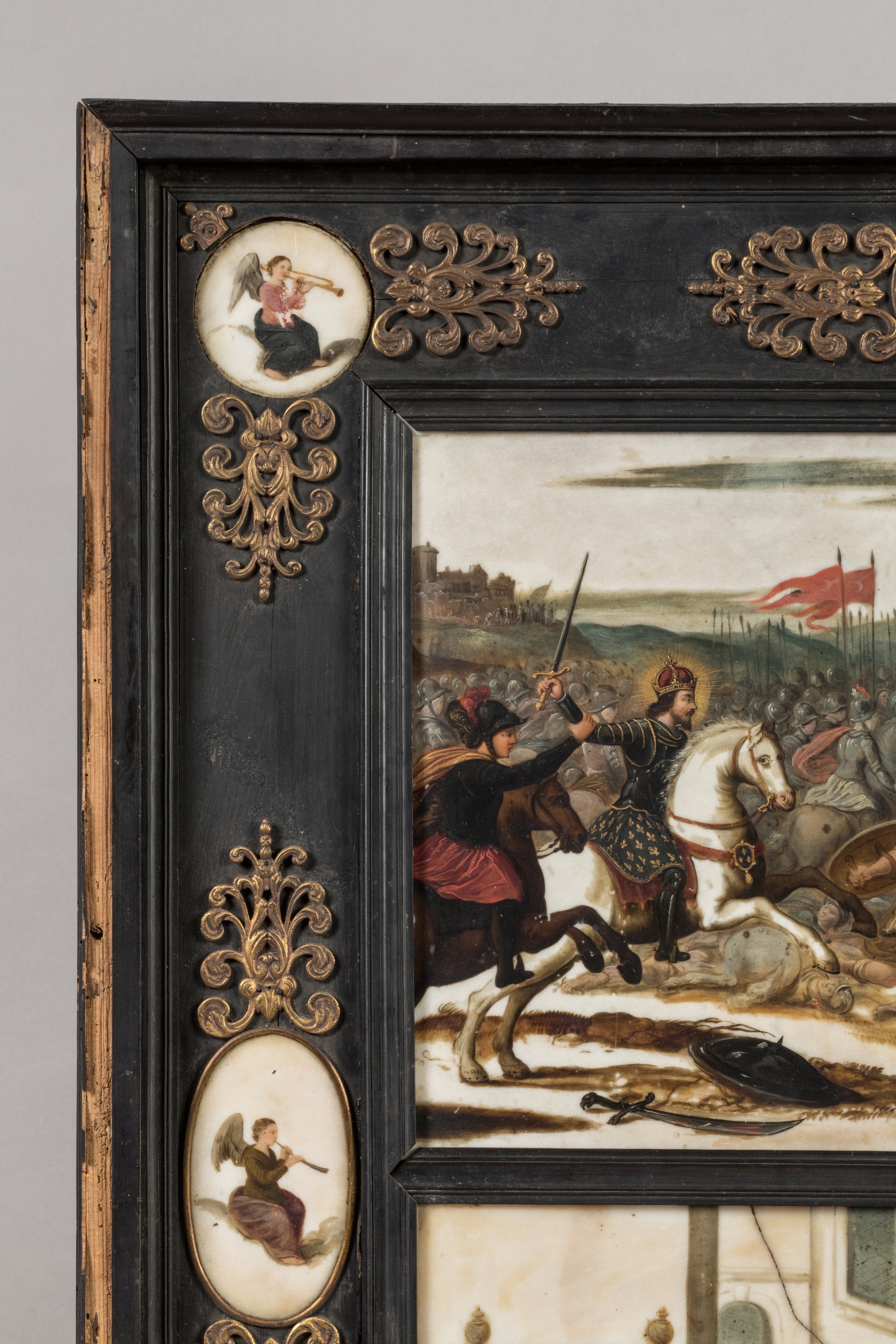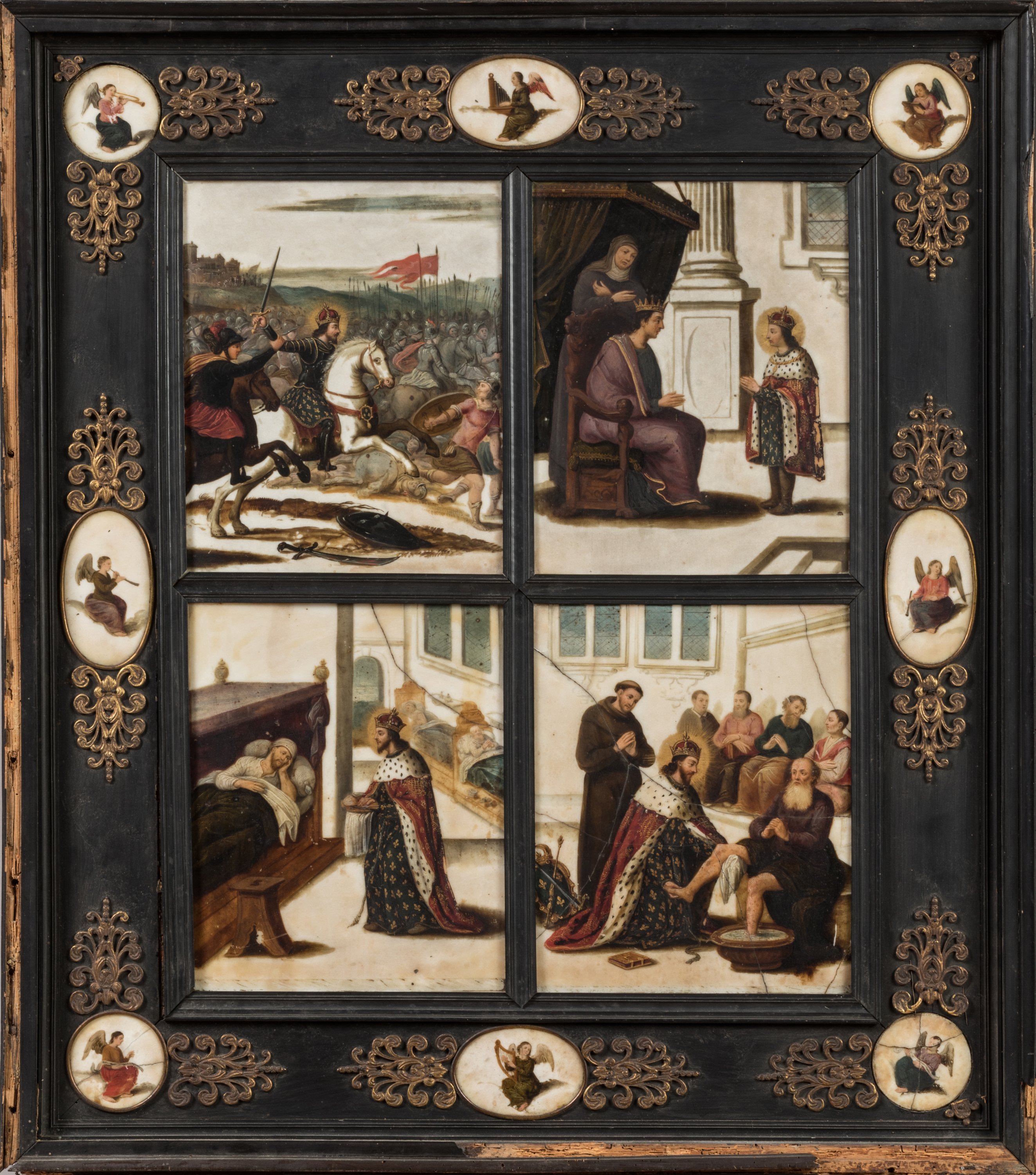 A series of painted marble plates attributed to Claude Déruet depicting four scenes of the life of King Louis IX (aka Saint Louis). In a Louis XIII ebony and blackened wood frame decorated with bronze ornaments and eight round and oval painted marble medallions depicting angels.