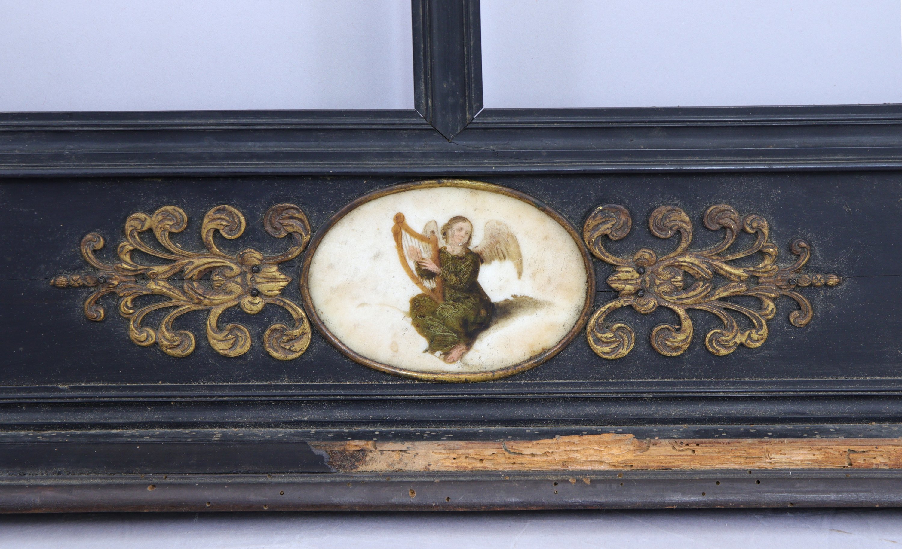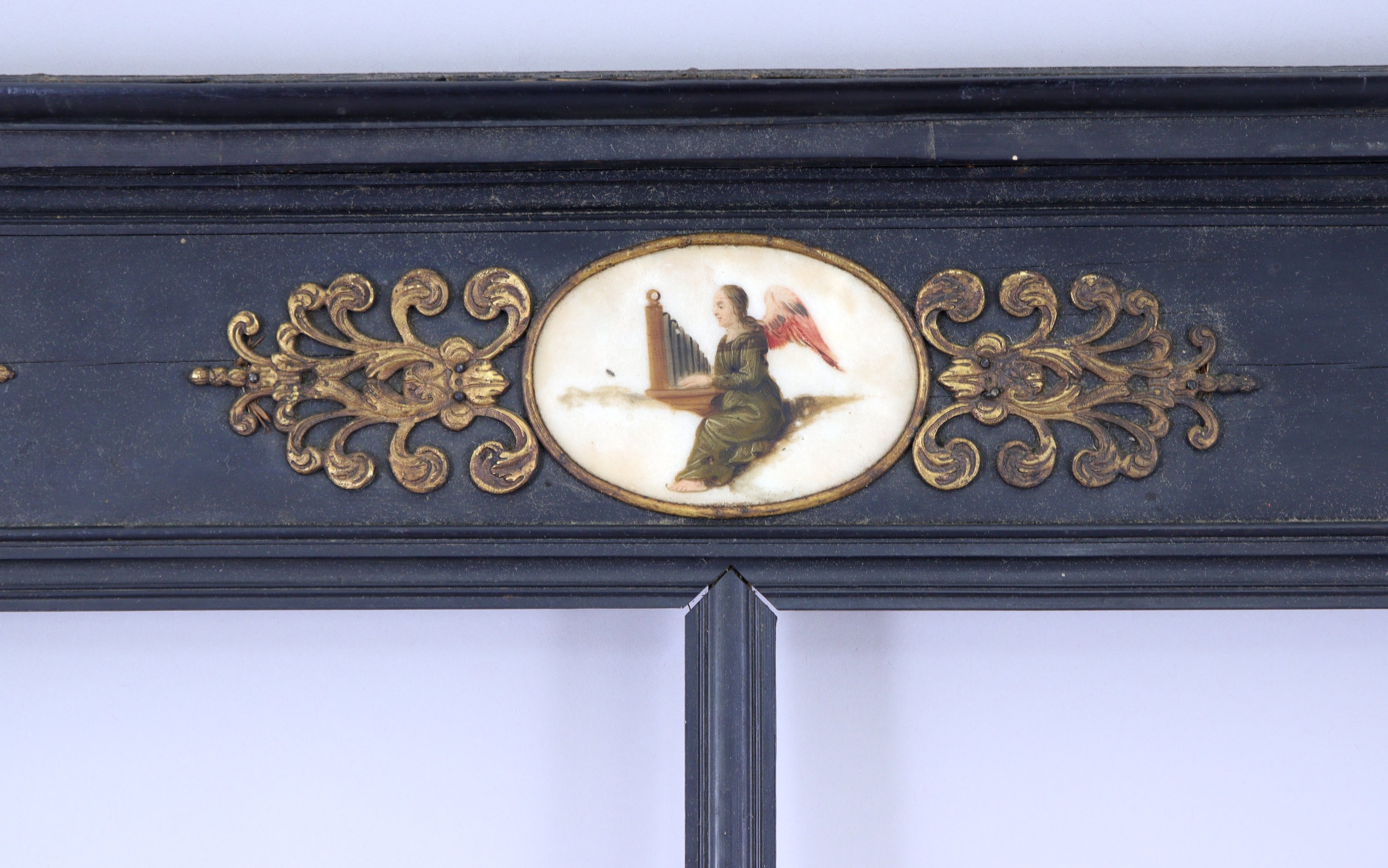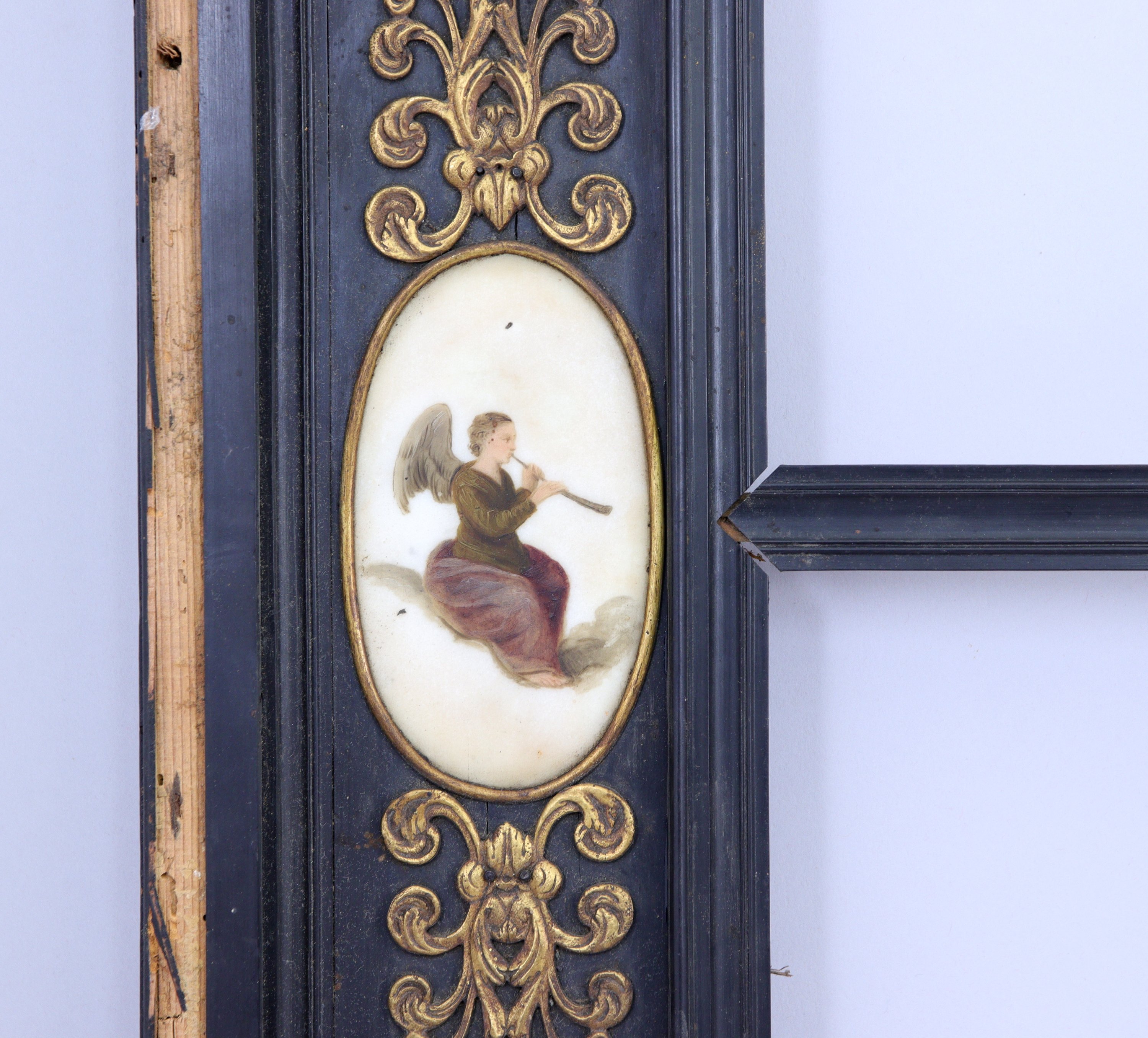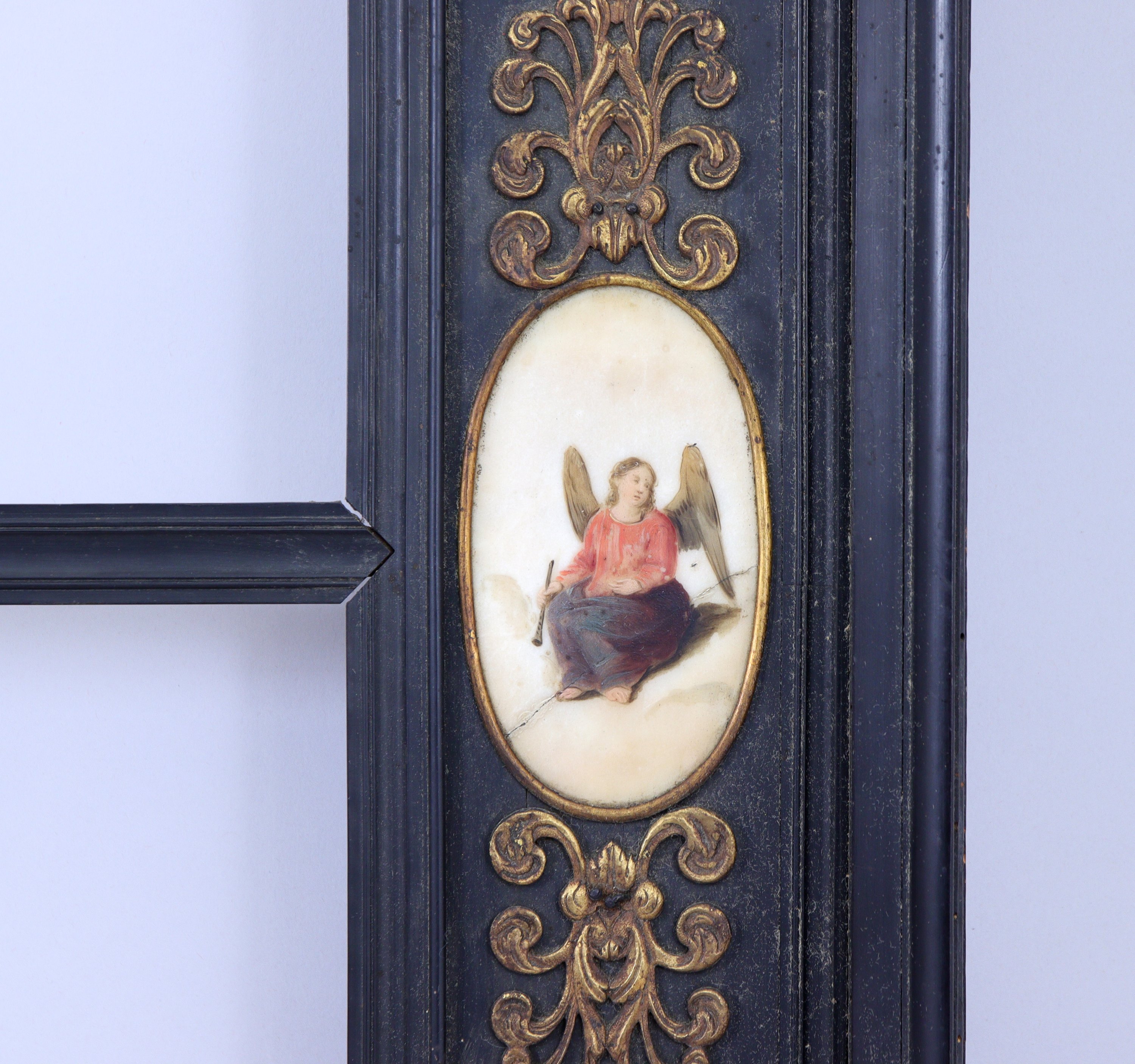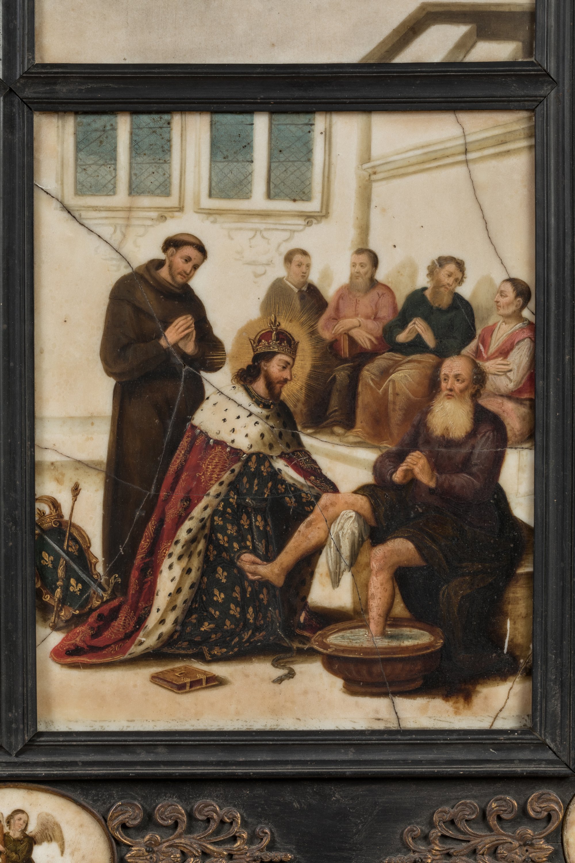 A series of painted marble plates attributed to Claude Déruet depicting four scenes of the life of King Louis IX (aka Saint Louis). In a Louis XIII ebony and blackened wood frame decorated with bronze ornaments and eight round and oval painted marble medallions depicting angels.