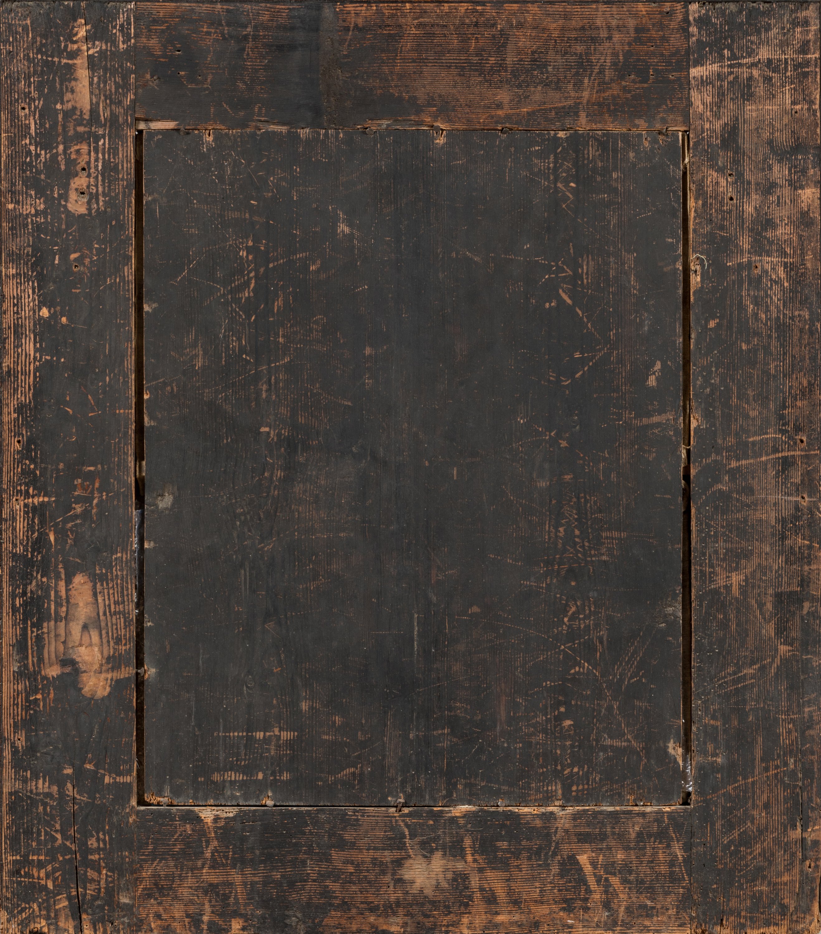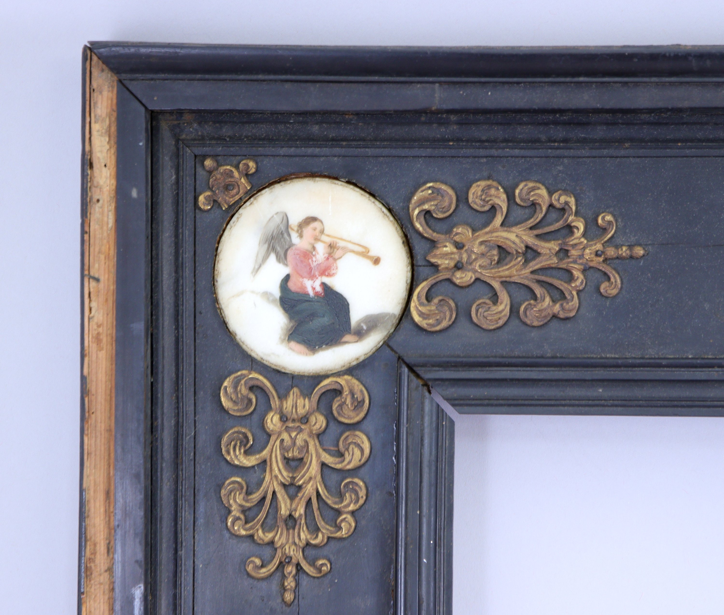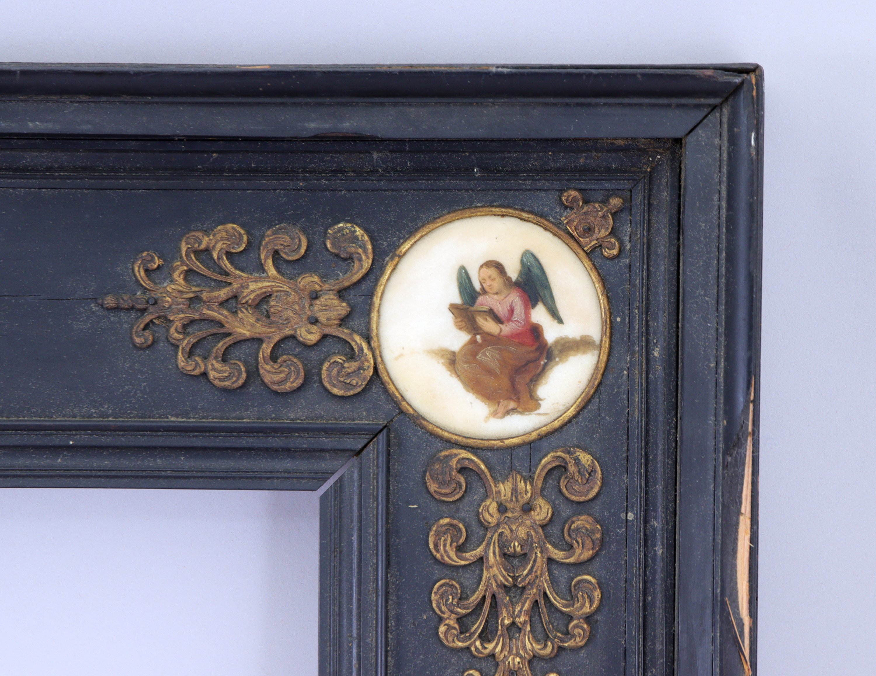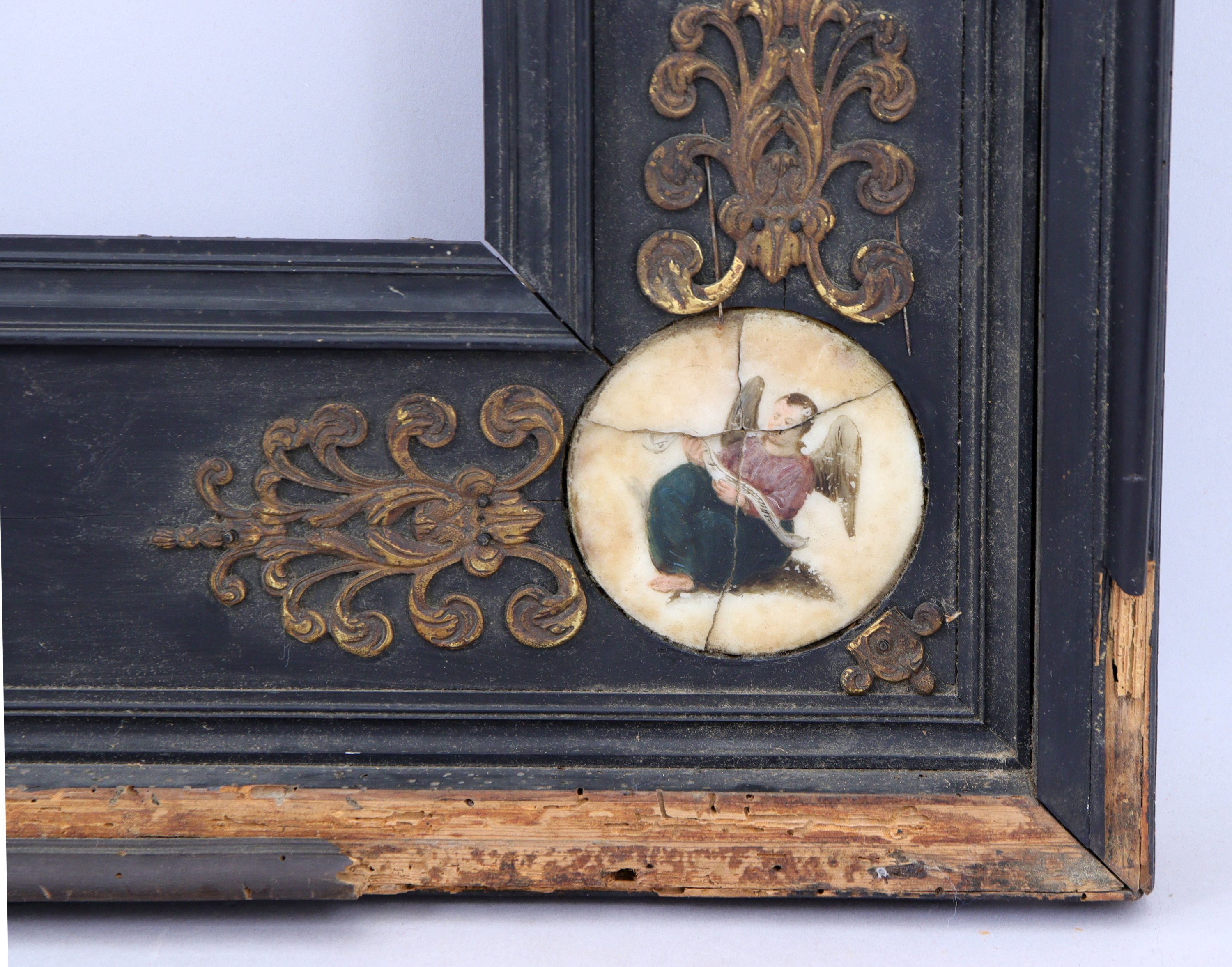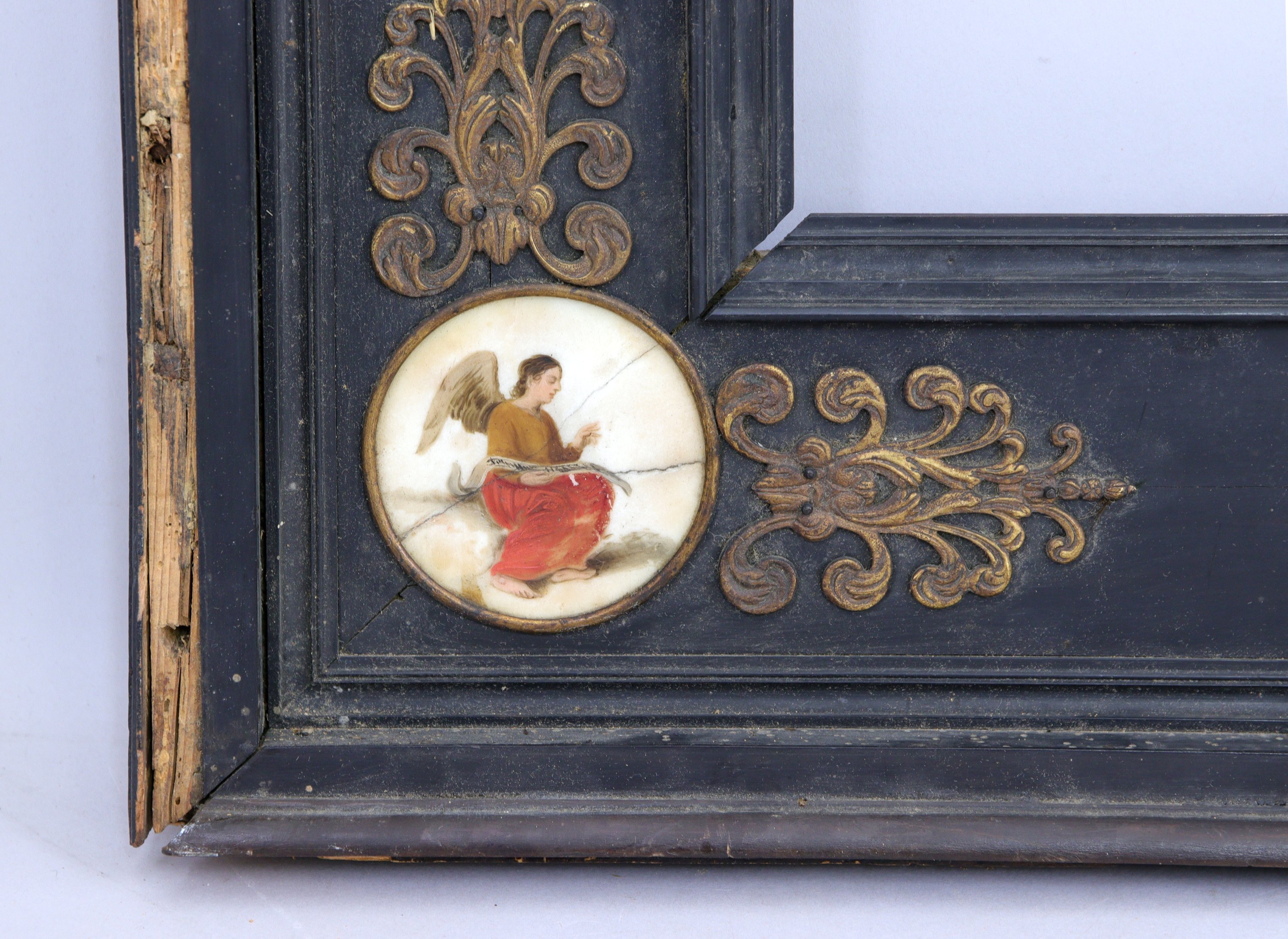 Dans un cadre en placage d'ébène et bois noirci à décor d'agrafes de bronze d'époque Louis XIII, orné de huit médaillons ronds et ovales.