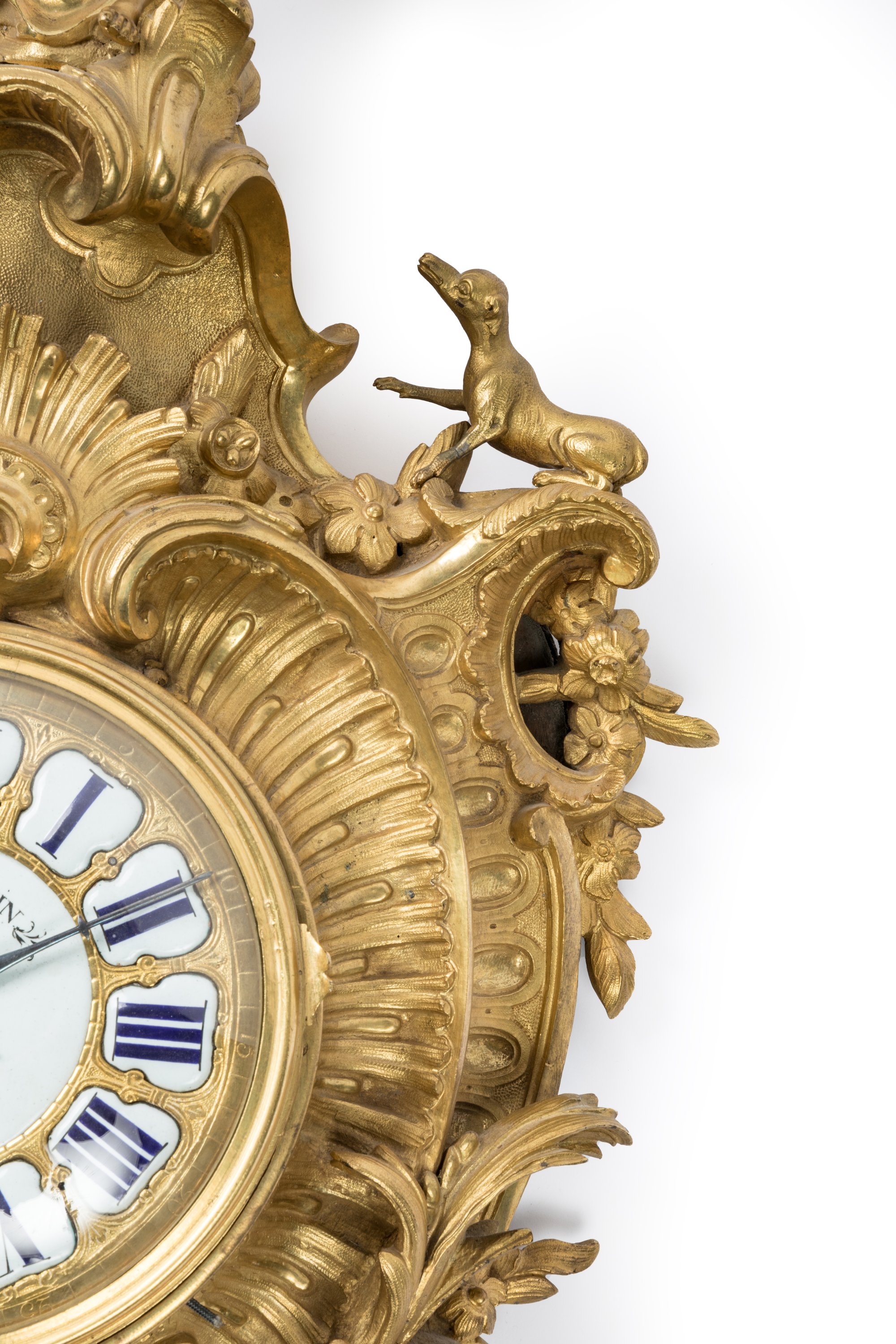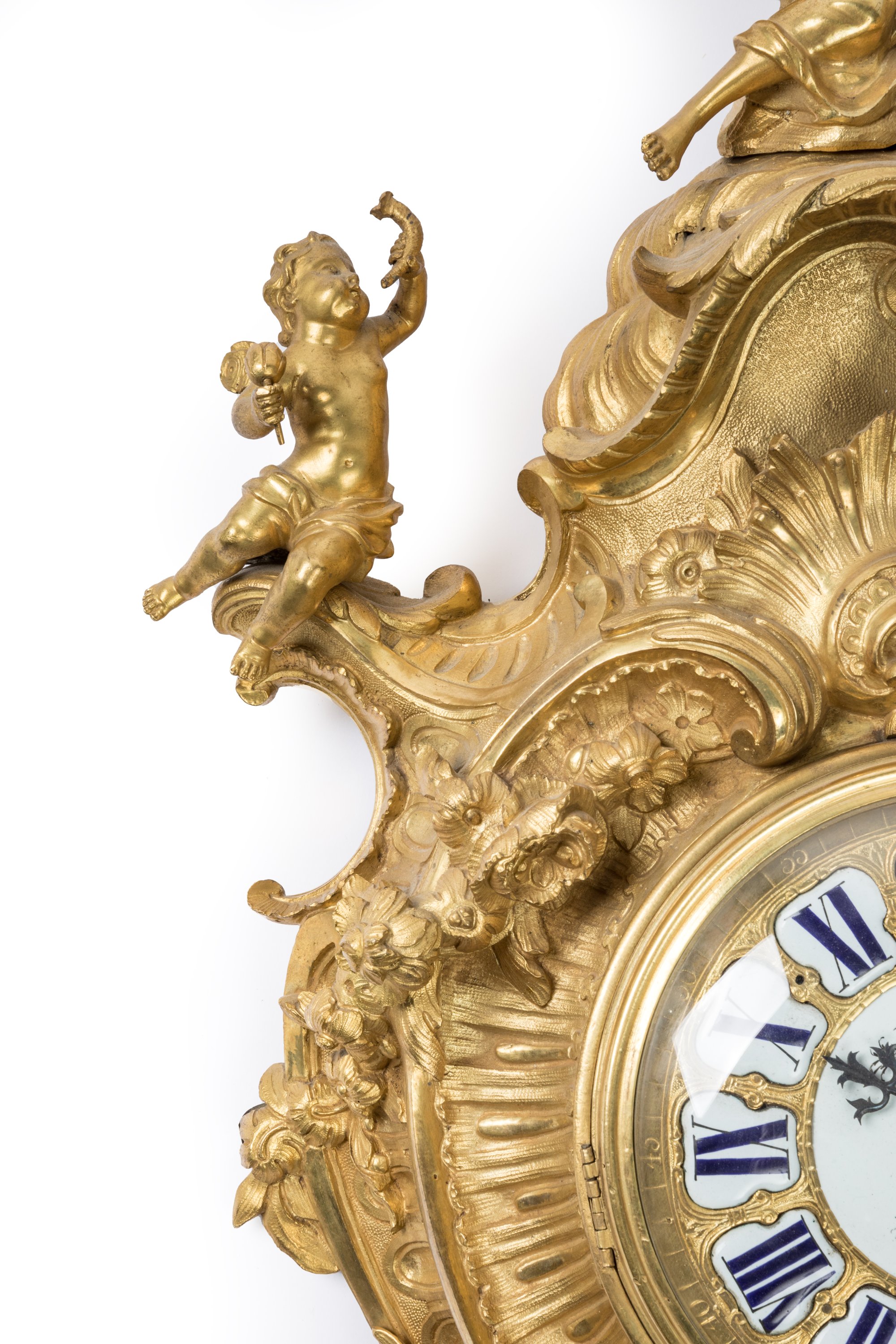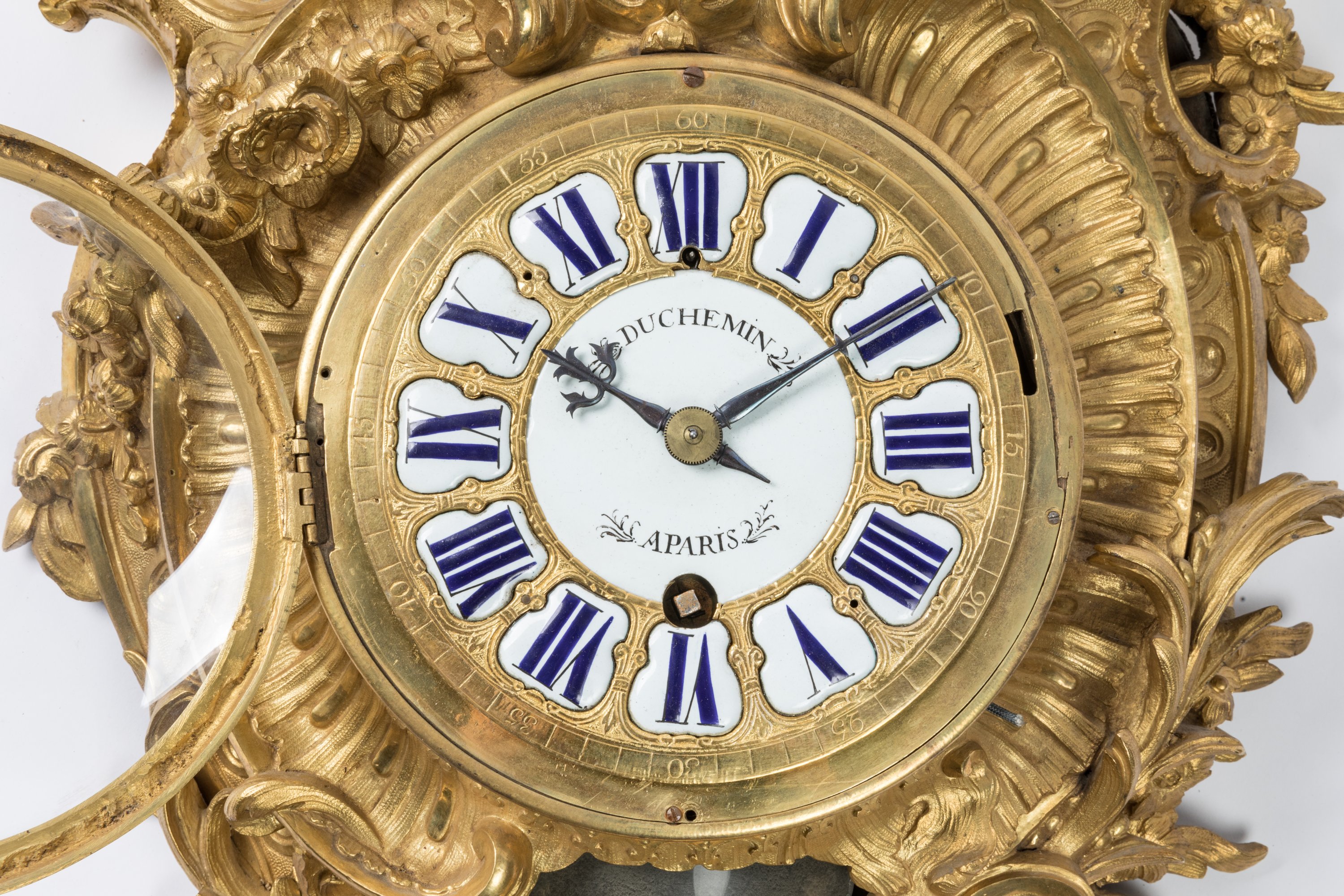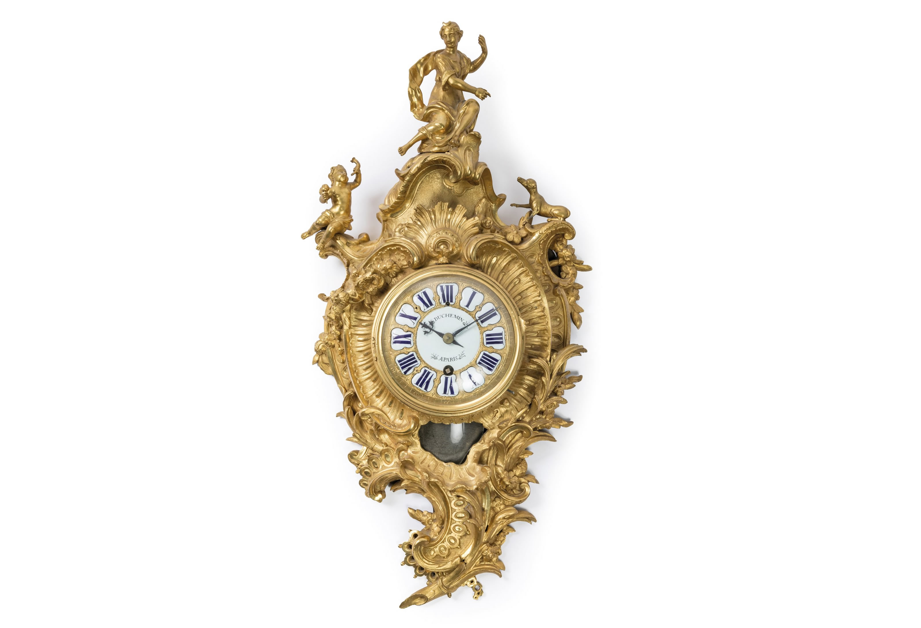 en bronze ciselé et doré, surmonté d'une Diane assise sur des nuées et reposant sous une volute. Le cadran émaillé donnant les heures en chiffres romains est signé "DUCHEMIN A PARIS". Il est décoré de chaque côté de vaguelettes, feuillages, putto et chien de chasse. La partie basse est décorée d'une coquille déchiquetée, noeuds agrafes et bouquets.