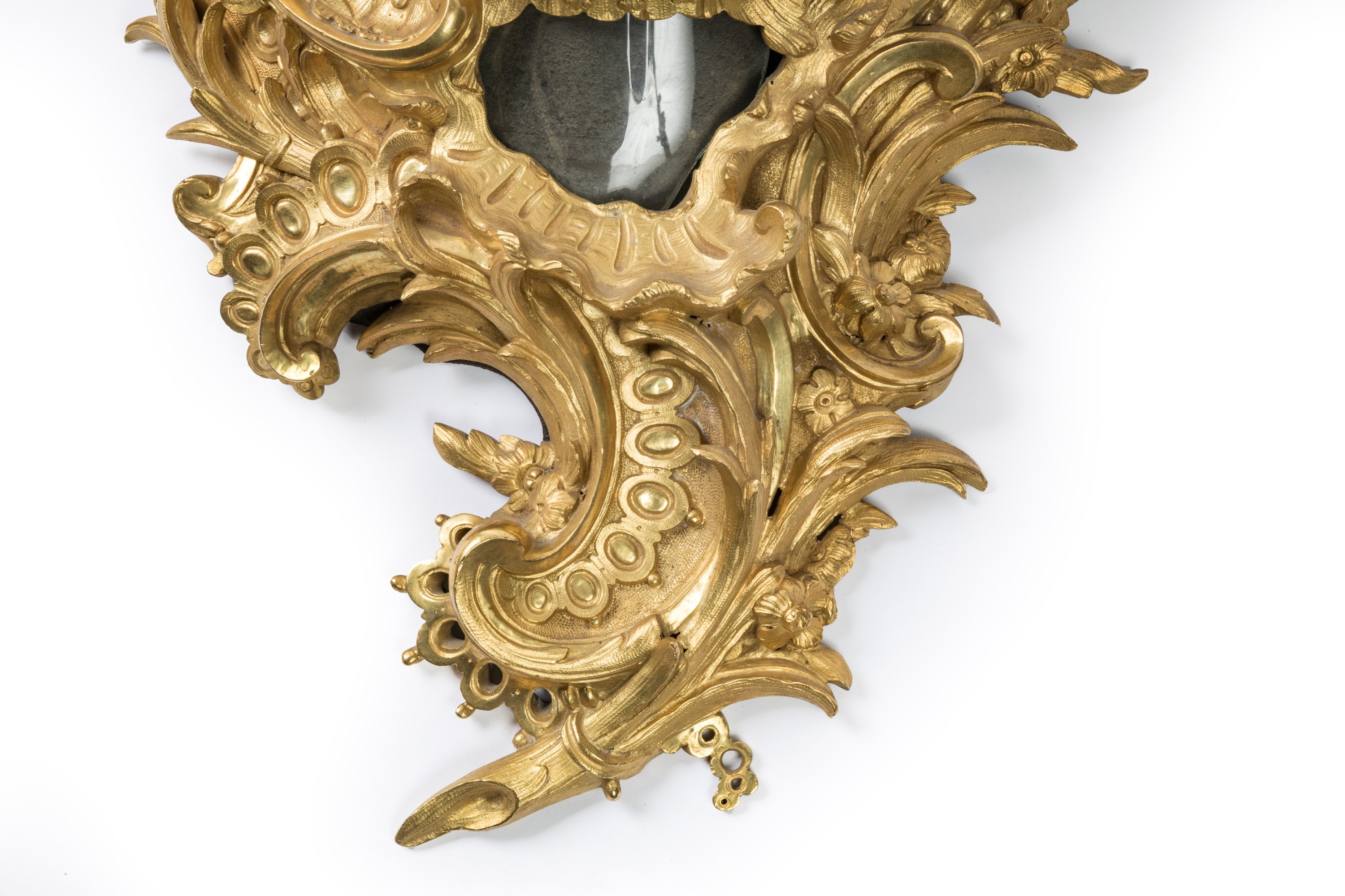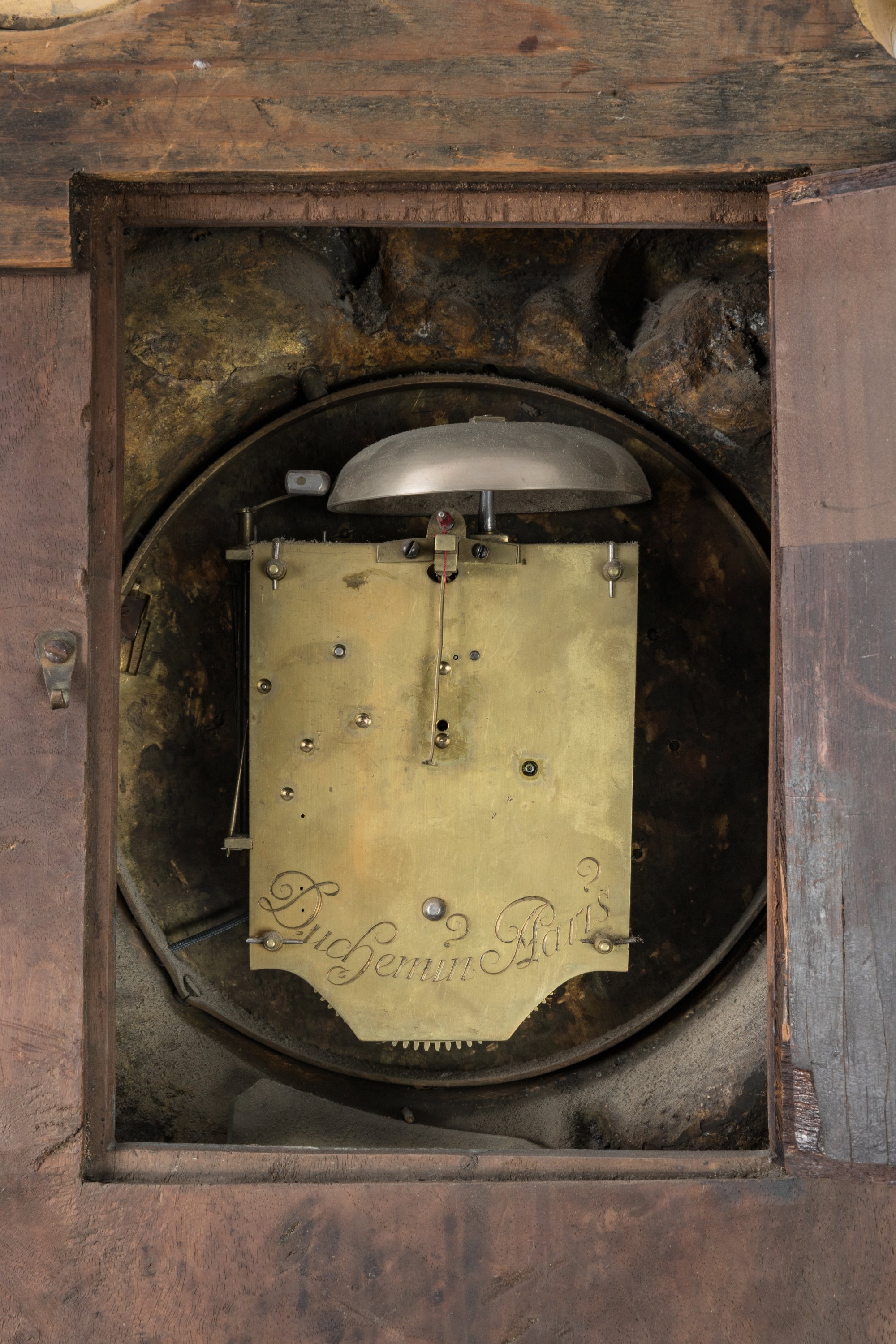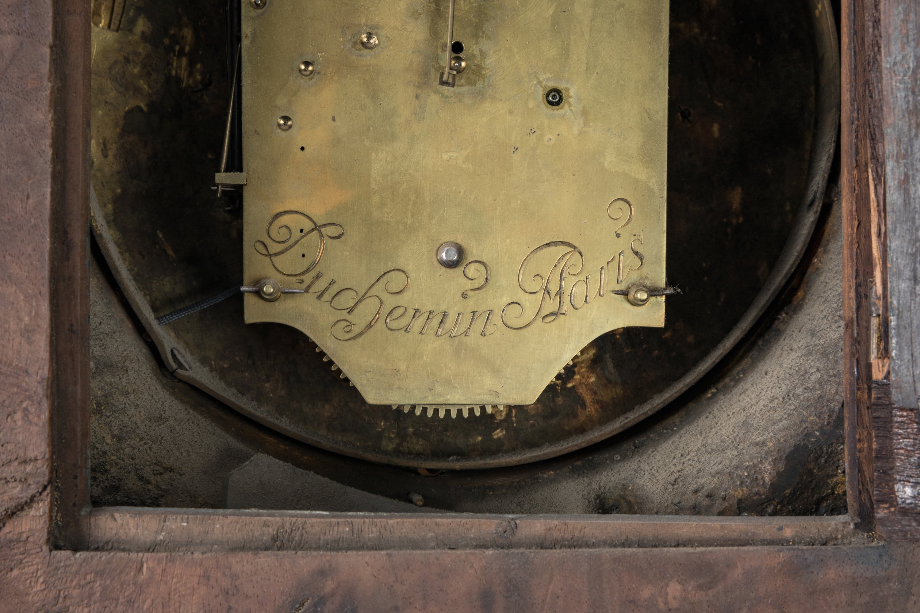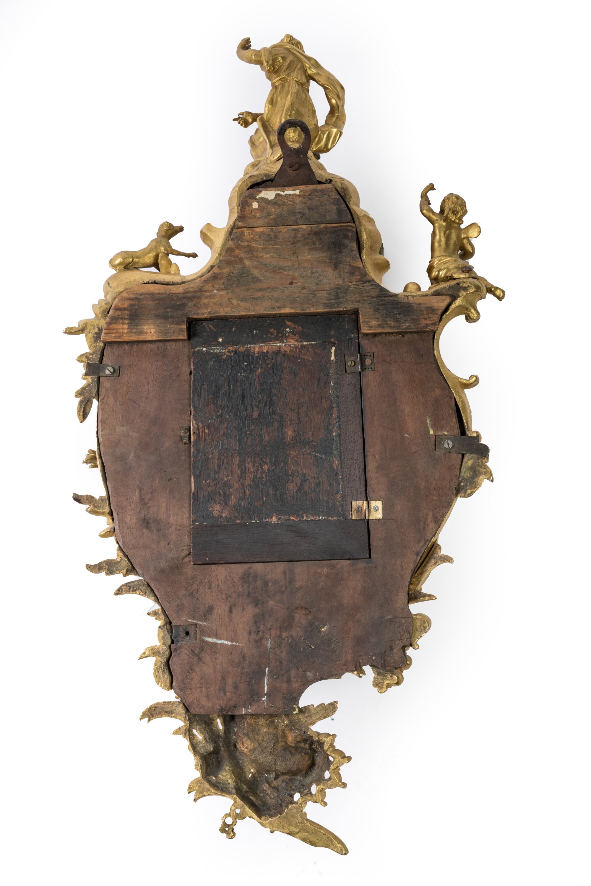 en bronze ciselé et doré, surmonté d'une Diane assise sur des nuées et reposant sous une volute. Le cadran émaillé donnant les heures en chiffres romains est signé "DUCHEMIN A PARIS". Il est décoré de chaque côté de vaguelettes, feuillages, putto et chien de chasse. La partie basse est décorée d'une coquille déchiquetée, noeuds agrafes et bouquets.