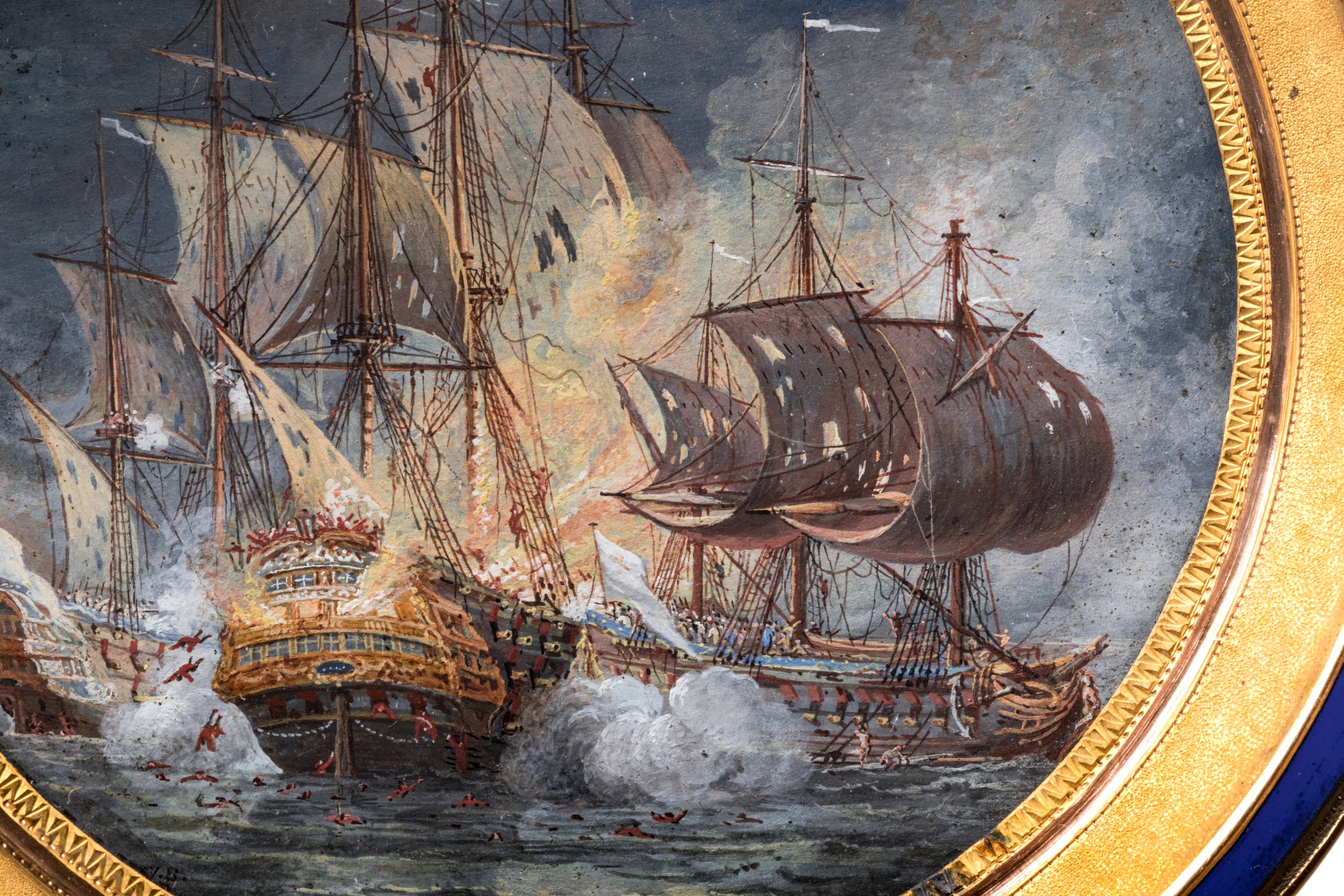 A gouache and watercolor tondo by Louis-Nicolas Van Blarenberghe depicting a sea battle. In a fine enameled frame.