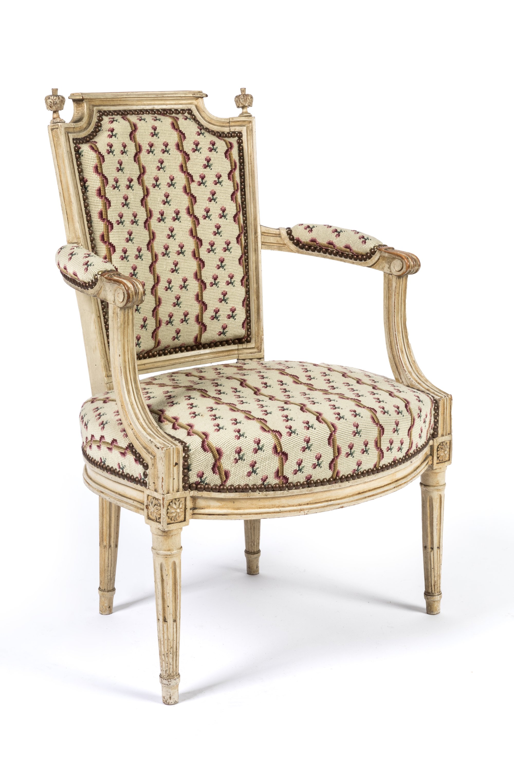en hêtre mouluré, sculpté et laqué à dossier en chapeau de gendarme à motif de grattoir entouré de deux fleurons. Les accotoirs à manchettes reposent sur des consoles, les dés de raccordement sont sculptés dune fleur épanouie. Il repose sur quatre pies fuselés, cannelés et rudentés.