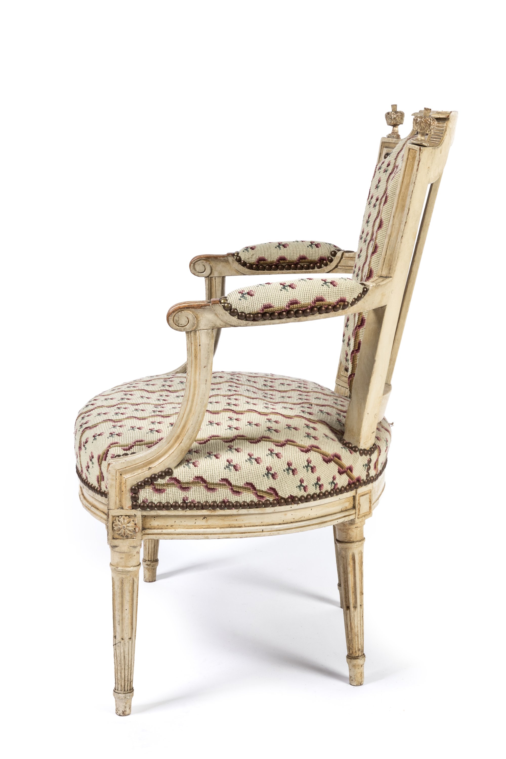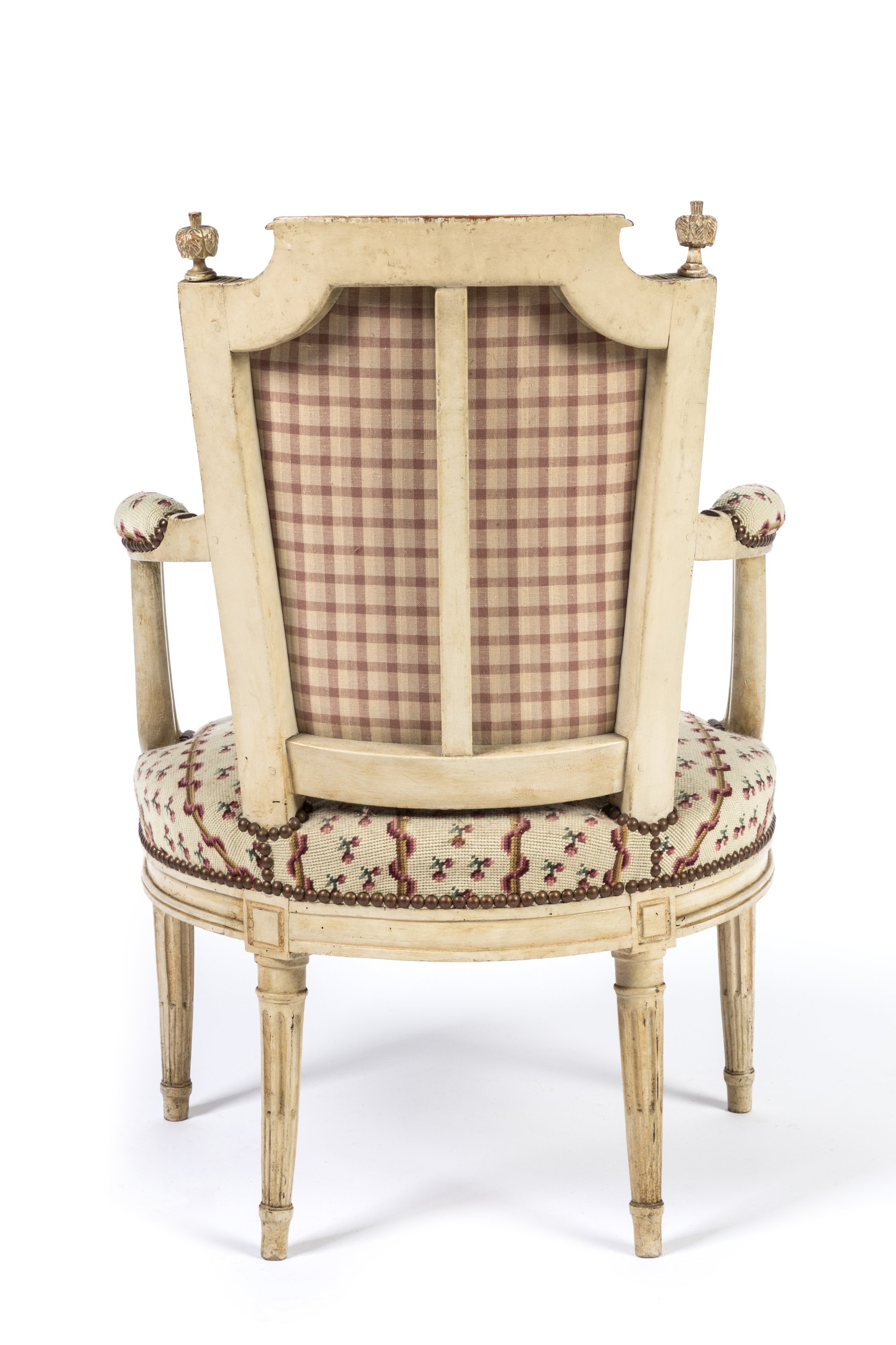 Louis XVI. A carved and lacquered beechwood cabriolet armchair reportedly from the Chanteloup Castle.